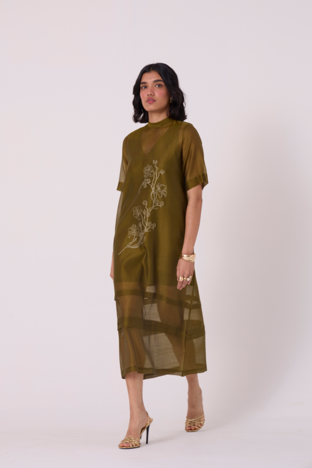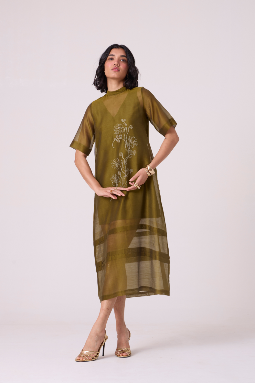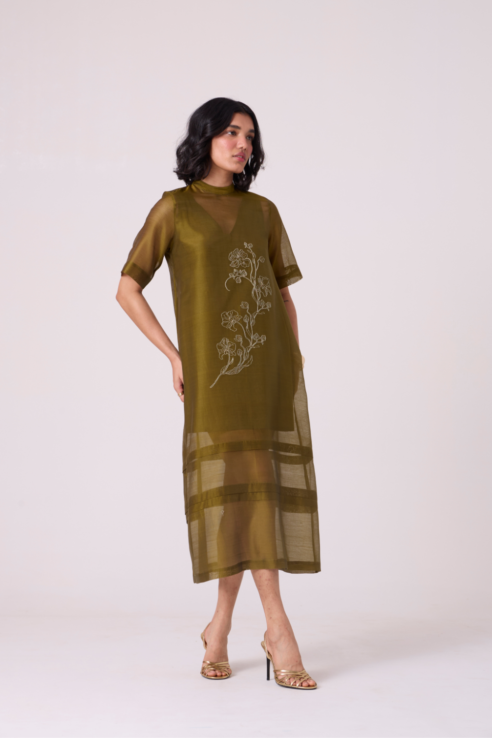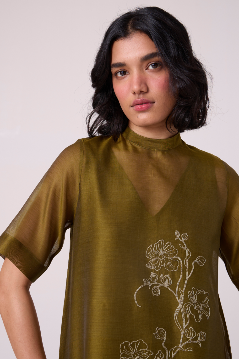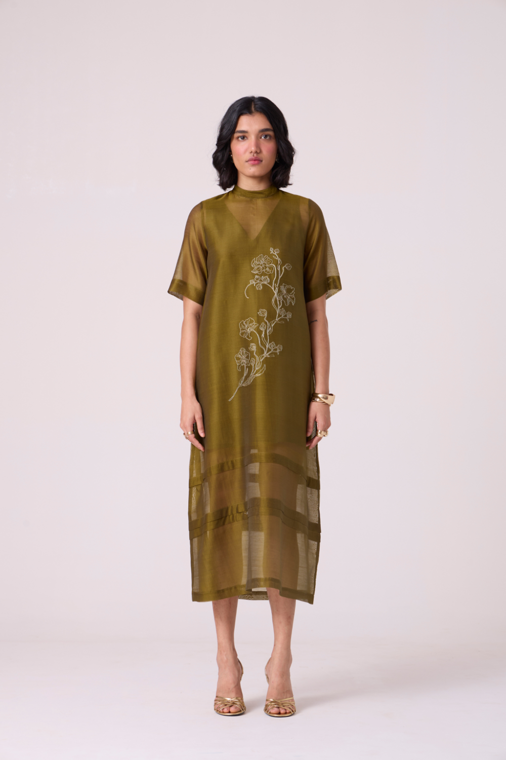An easy shift with a precise pleated hem and high neck. Short set-in sleeves. A hand-embroidered front brings quiet focus to a clean, uninterrupted line.
