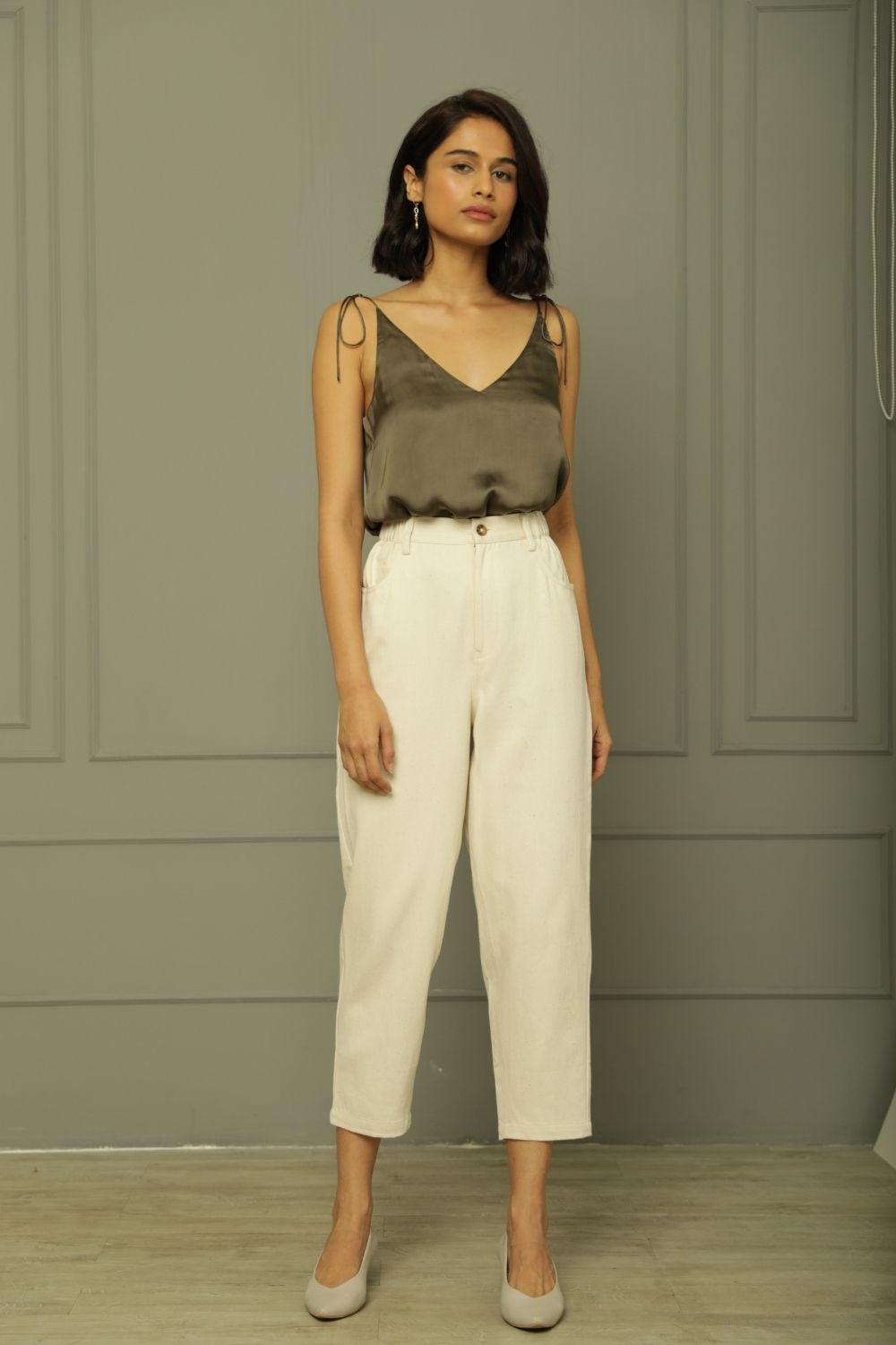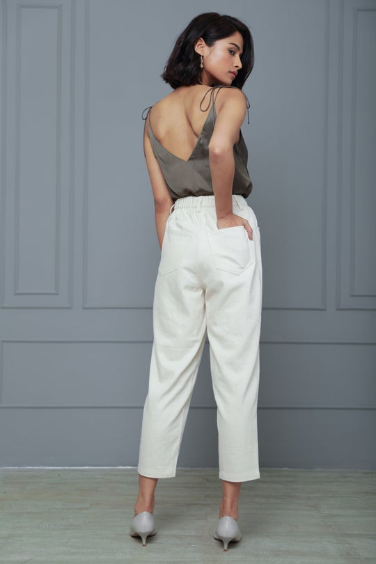 Handwoven, dye free denim. High rise with ankle grazing length. Elasticated waist. Front button fastening with a zip fly.
