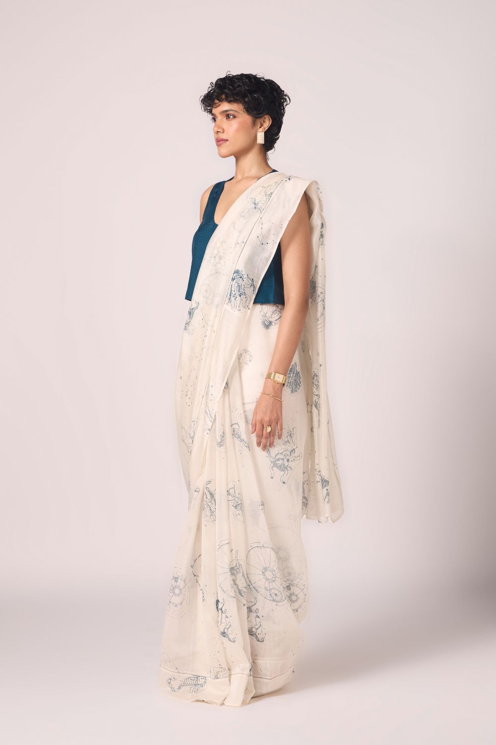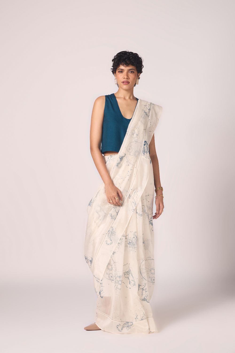 A sari that wears like starlight. Handwoven Chanderi forms a sheer canvas for constellation print, while fagotting detail along the border lends quiet intricacy. Light, fluid, and radiant — it carries six yards of poetry.