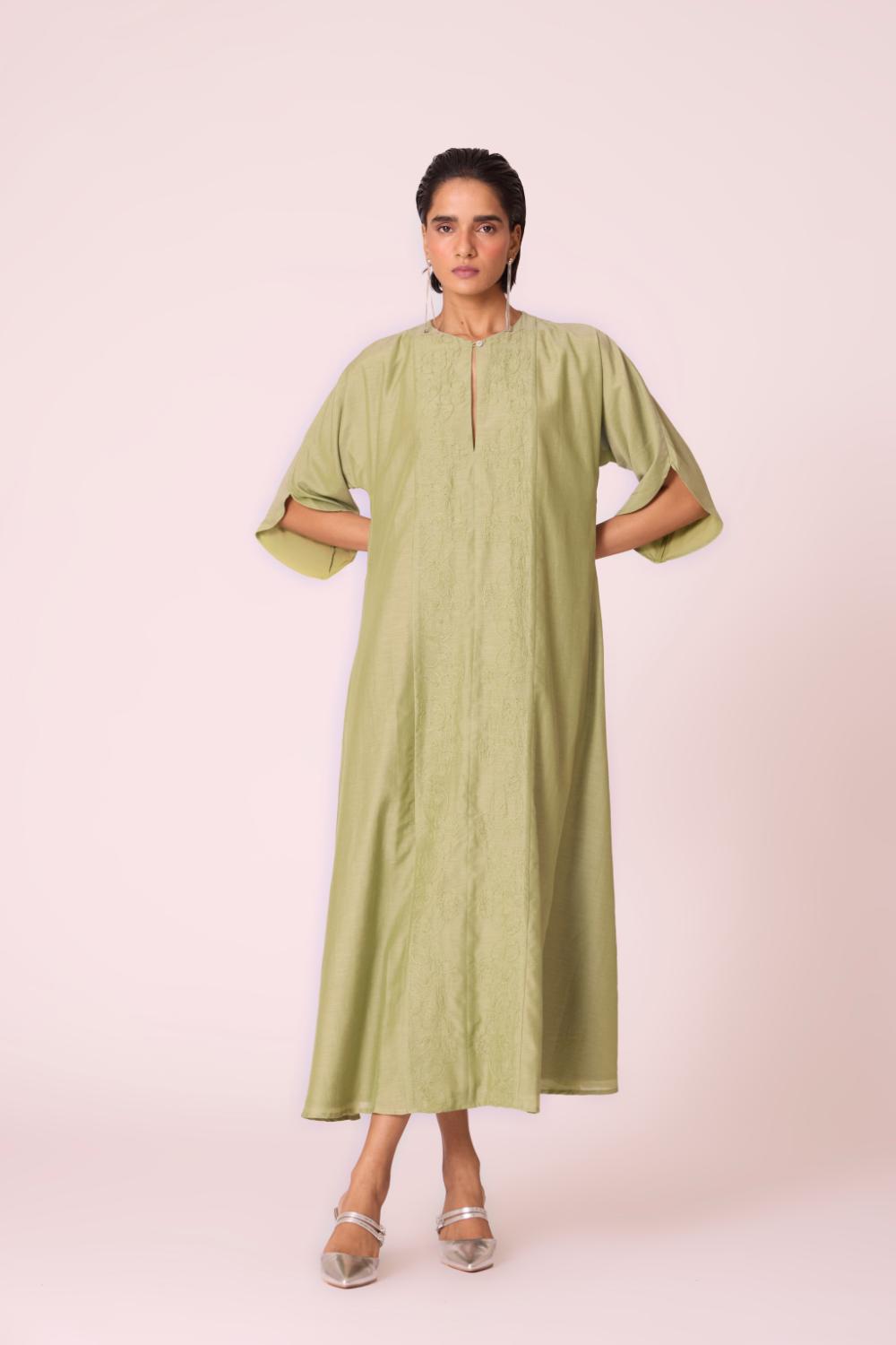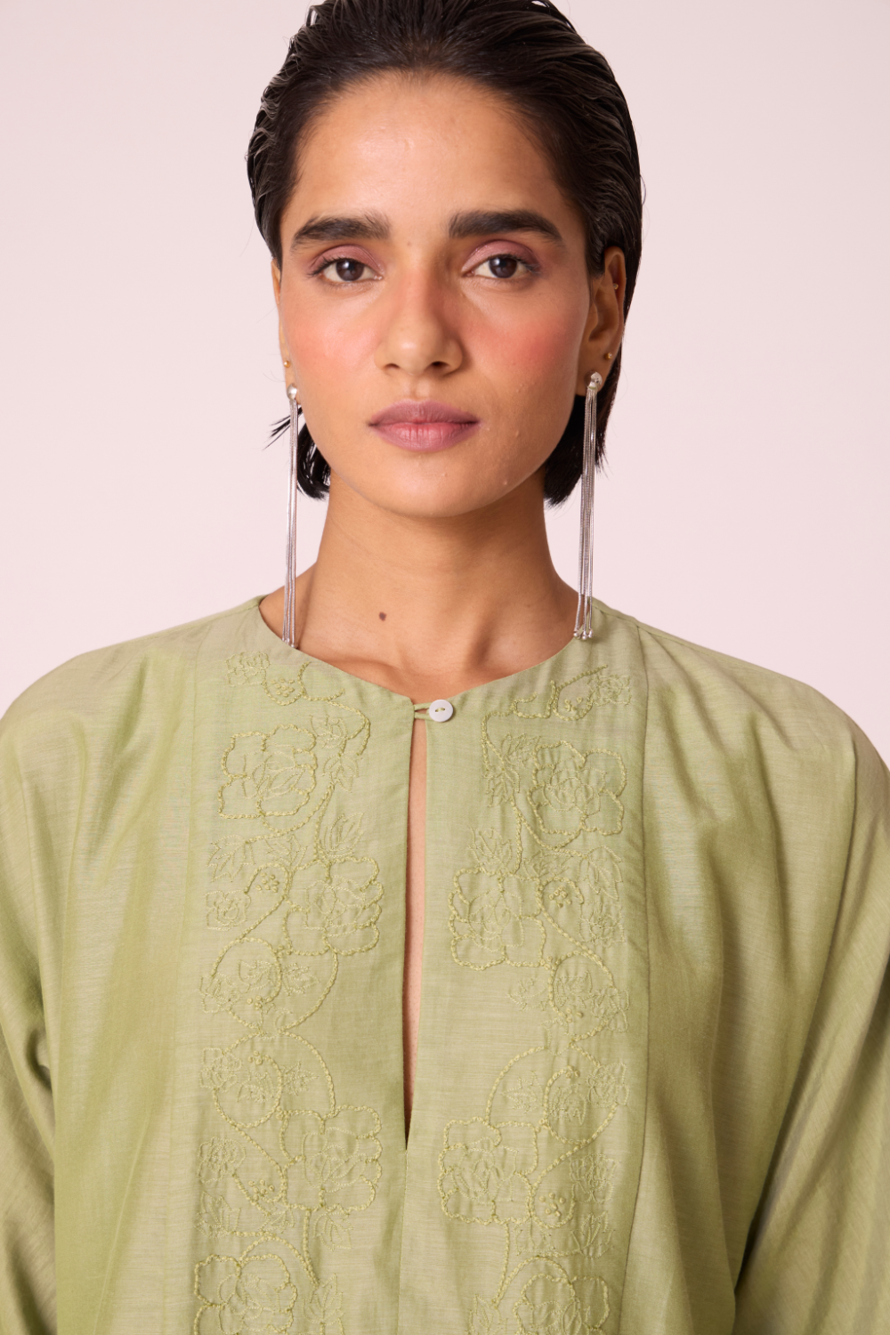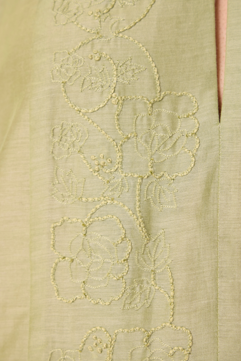 - Keyhole neckline with a hand-embroidered panel, crafted in-house