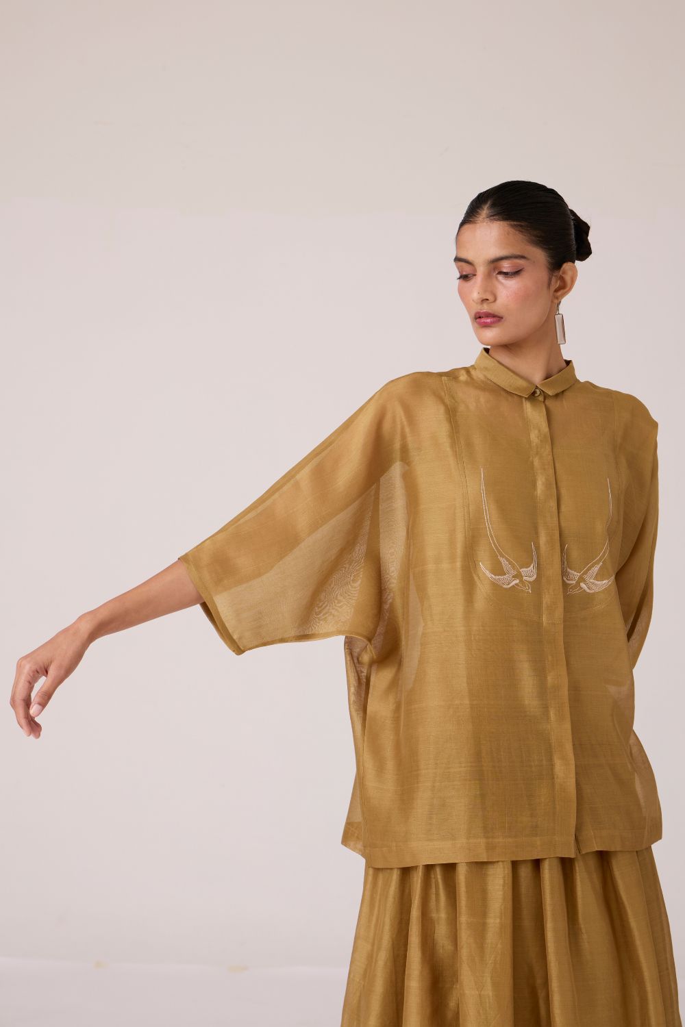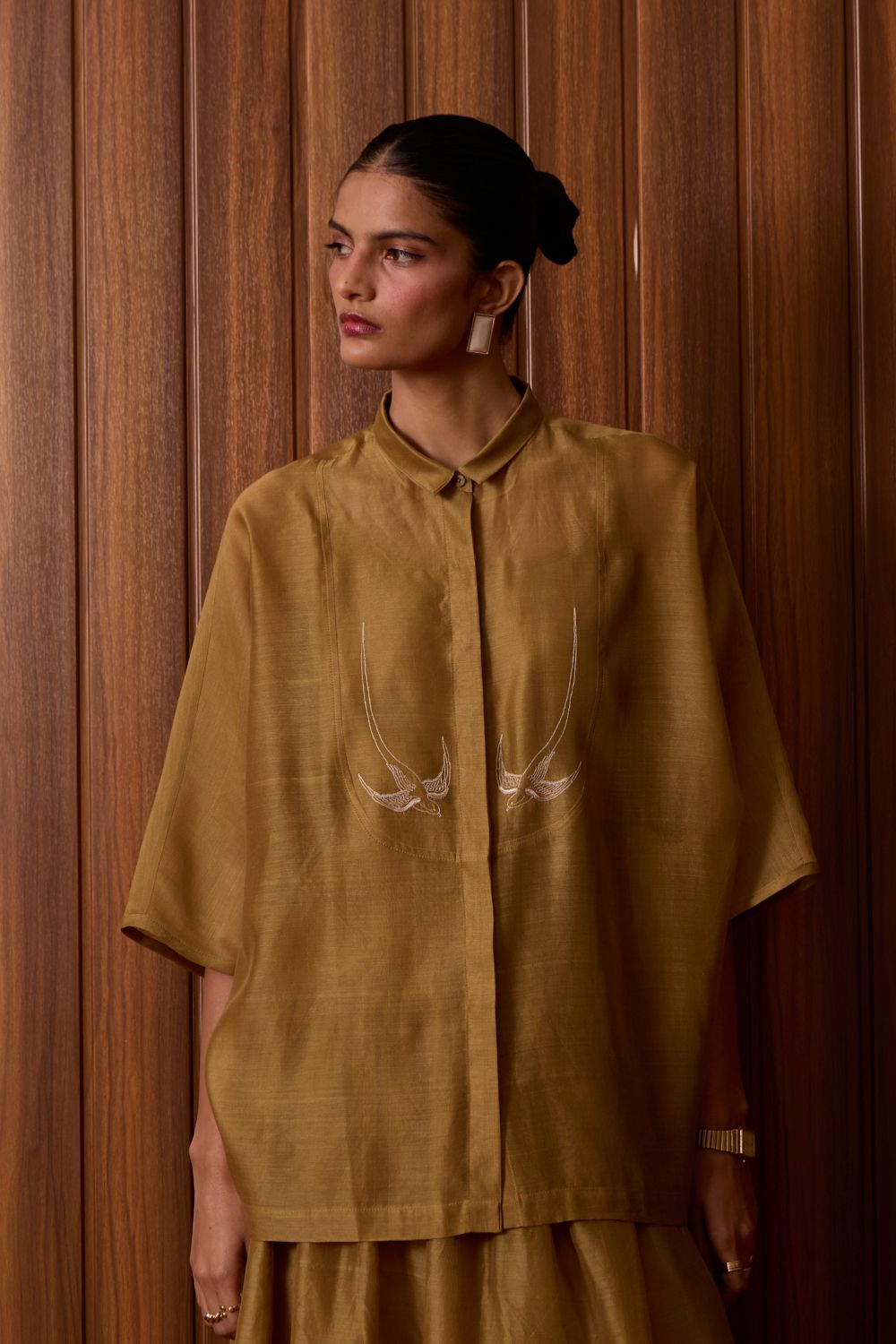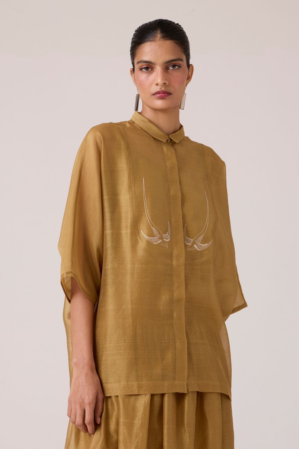 Embroidery punctuates clarity. With a slim collar and dolman sleeve, this top balances quiet detail with deliberate ease.