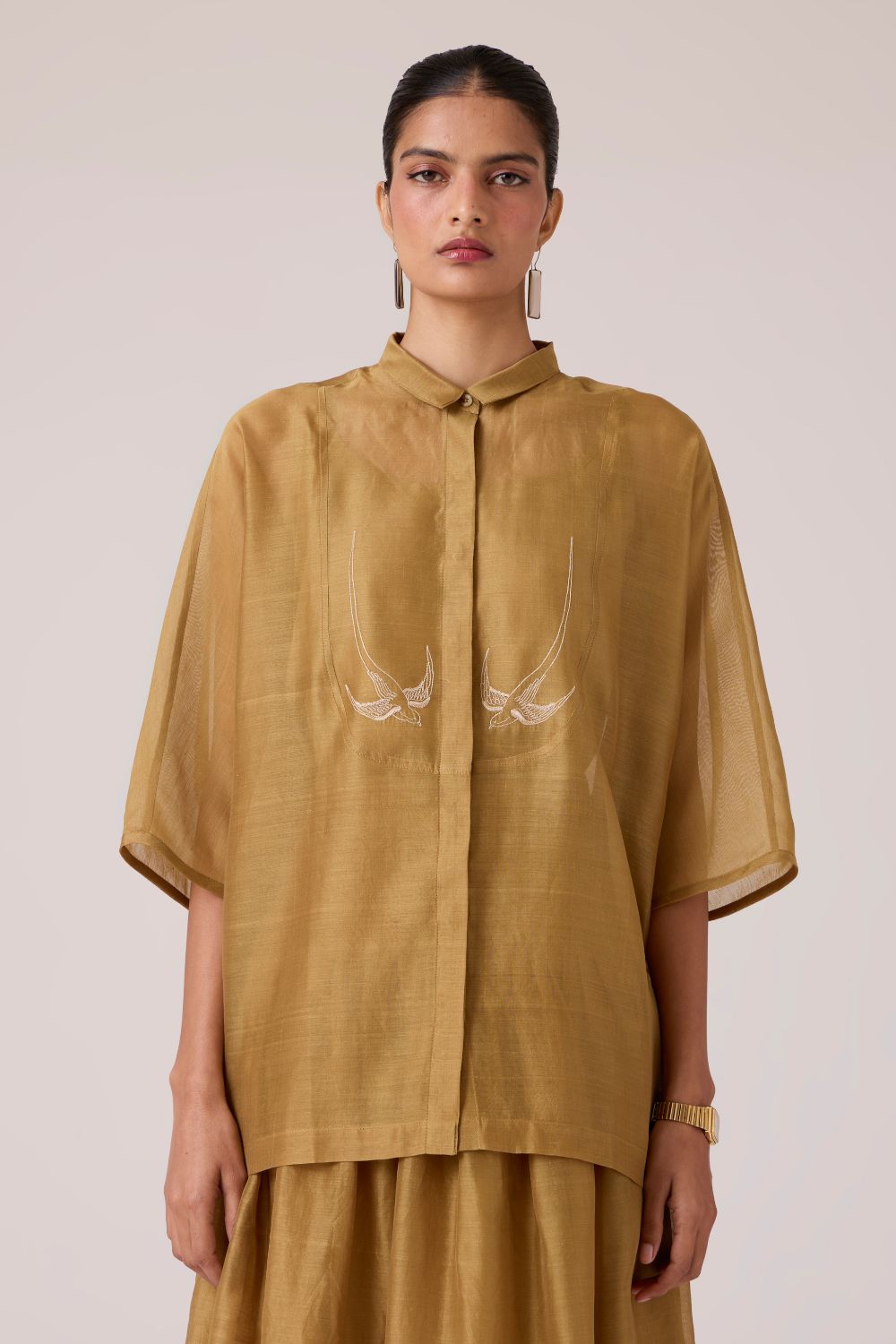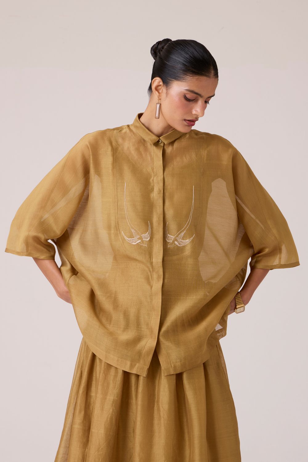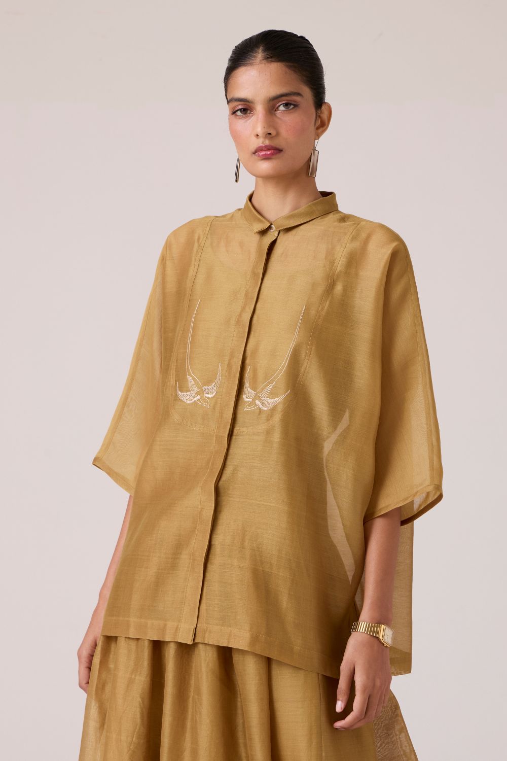 Embroidery punctuates clarity. With a slim collar and dolman sleeve, this top balances quiet detail with deliberate ease.