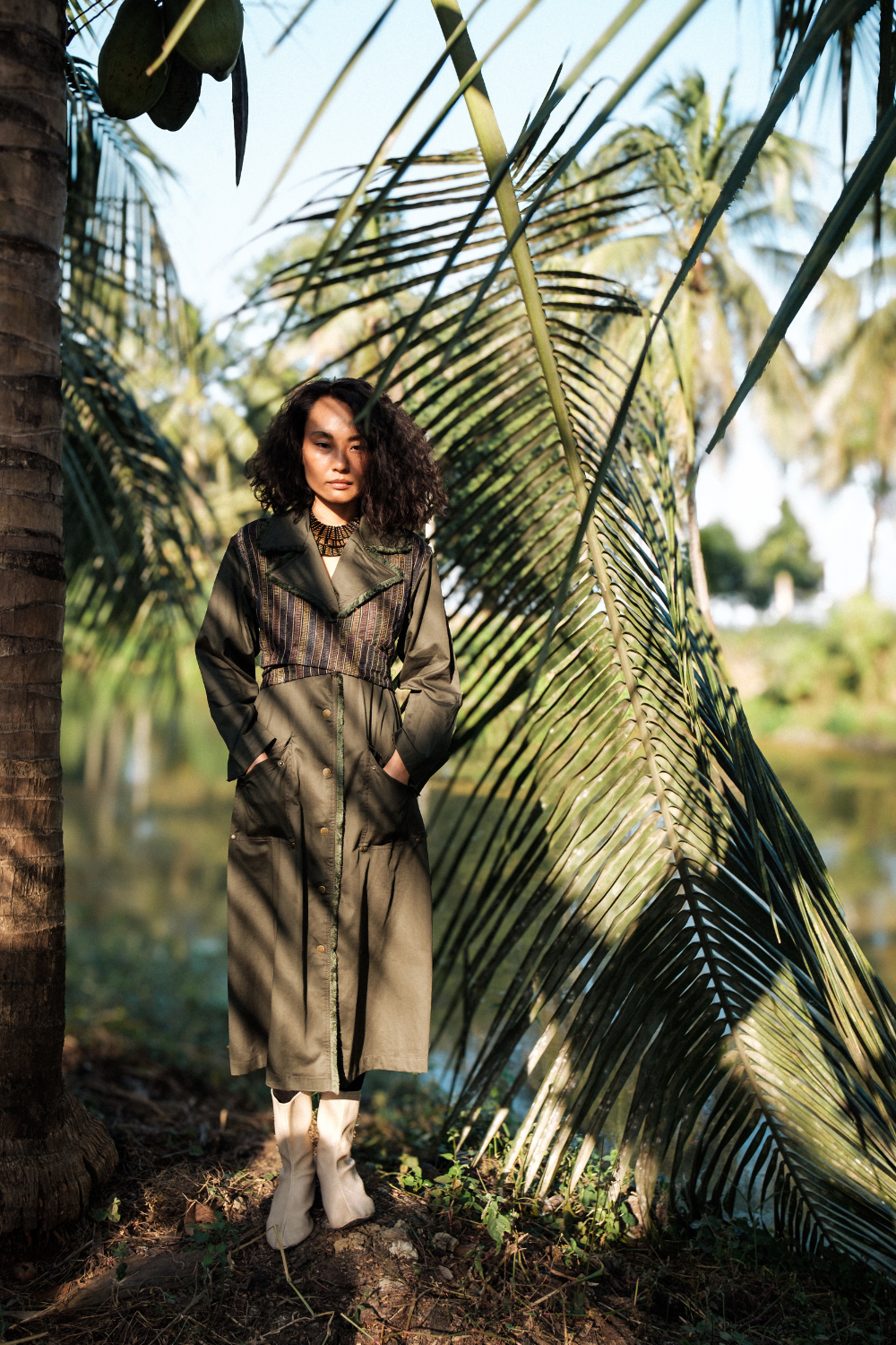 This incredibly versatile trench coat featuring a notch collar, our take on the classic trench with a timeless wrap detail designed from upcycled fabric, made using post production waste that transcends all seasons, making it a perfect wardrobe staple.It can be worn as a dress or as an overlay. Our garments are dyed using pigments that do not cause any major harm to the environment in any manner. The garment is made from hand woven upcycled fabric and so the color might vary slightly for each batch. Peta approved vegan/Plant based clothing. For customization, please reach out to us.""