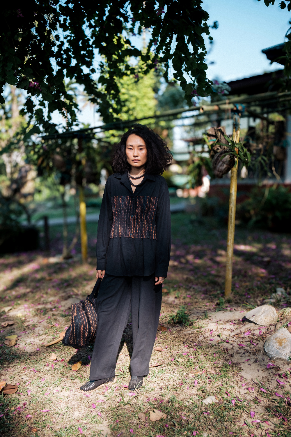 This shirt features a patch detail designed from upcycled fabric, made using post production waste, creating the most perfect cinch on the waist. An elevated classic shirt that pairs perfectly with our barrel pants. Our garments are dyed using pigments that do not cause any major harm to the environment in any manner. The garment is made from hand woven upcycled fabric and so the color might vary slightly for each batch. Peta approved vegan/Plant based clothing. For customization, please reach out to us.