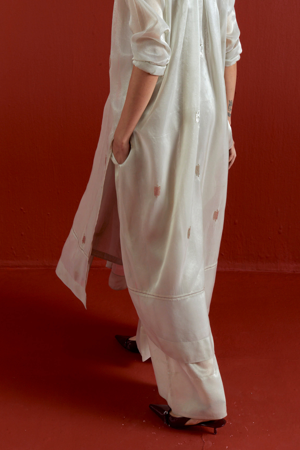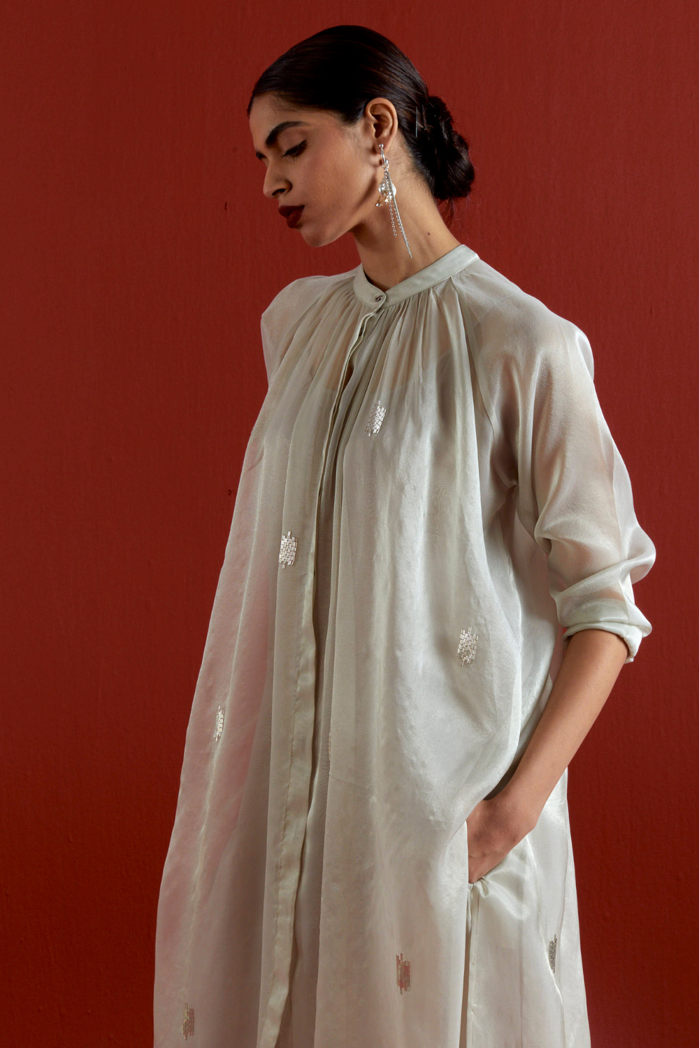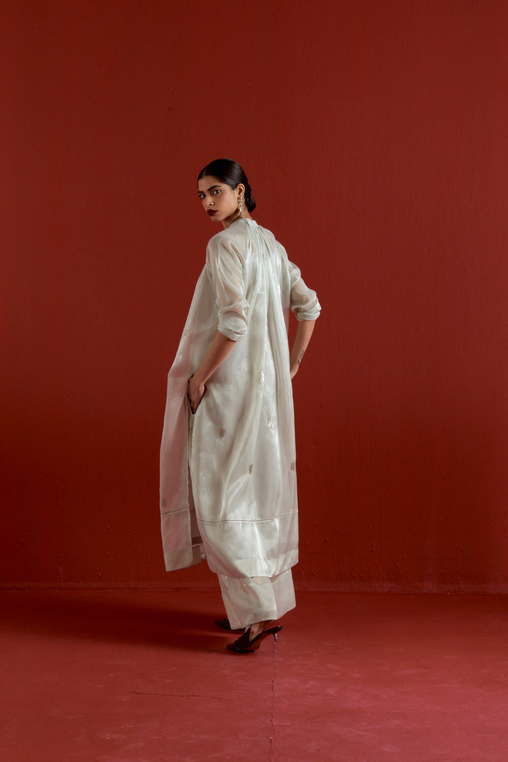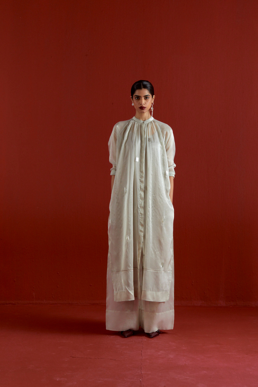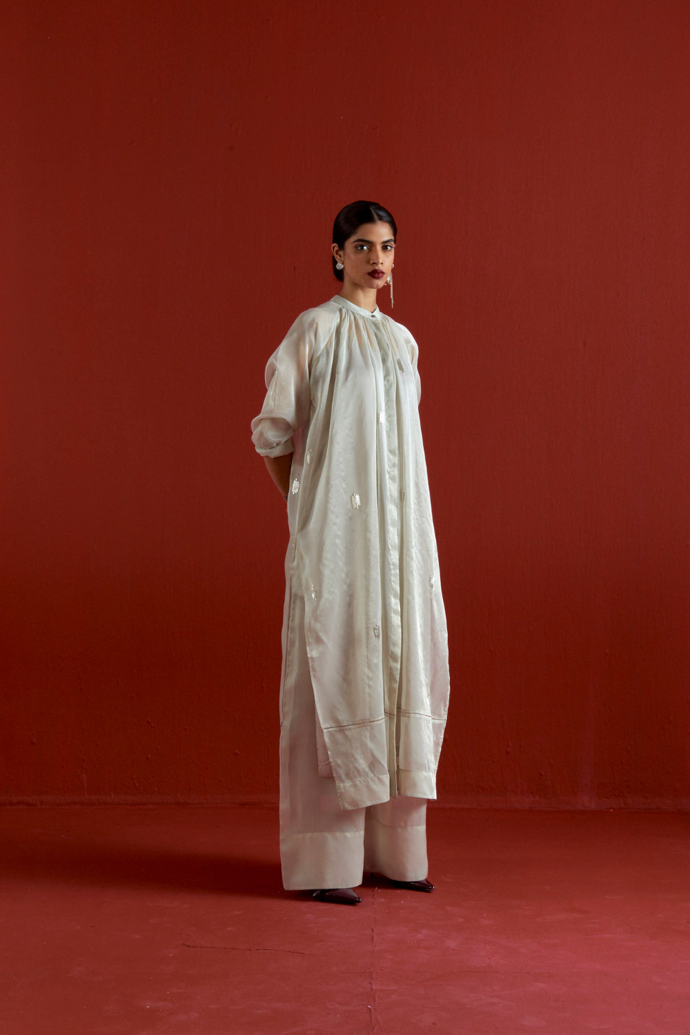 EMB. GATHER NECK SHIRT CO-ORD-METALLIC GREY