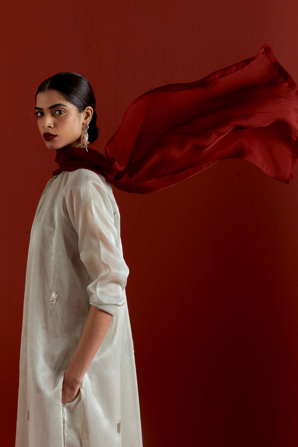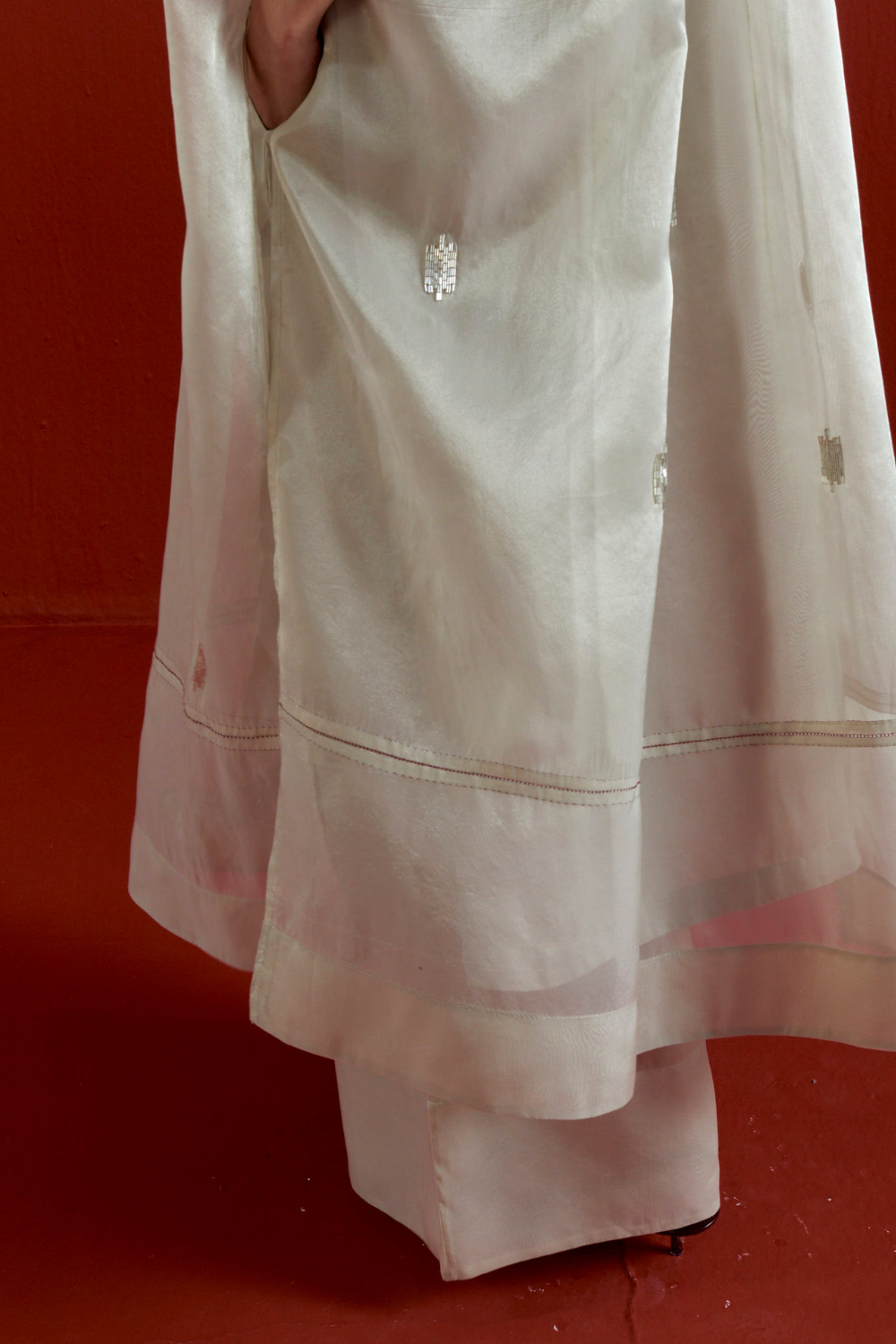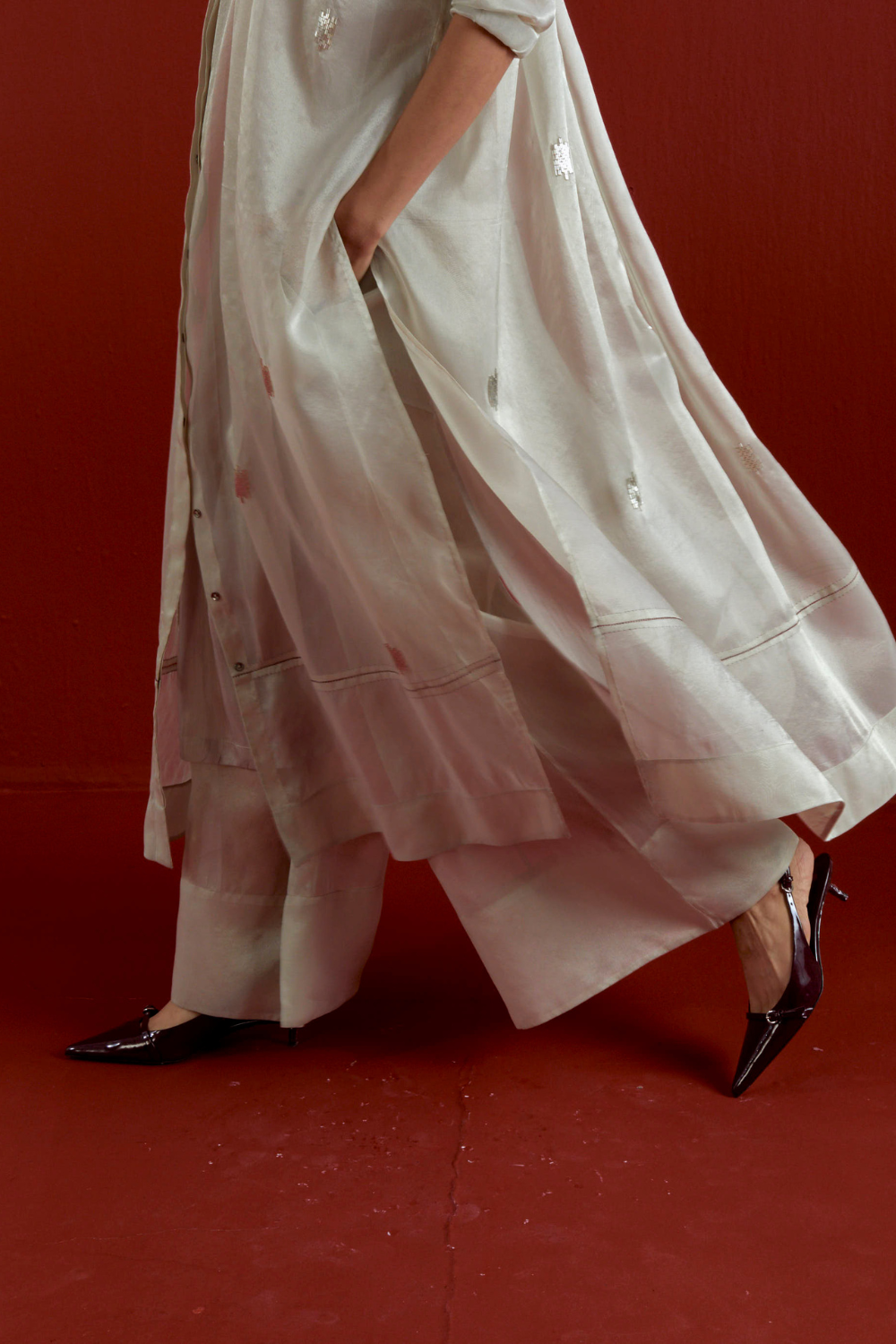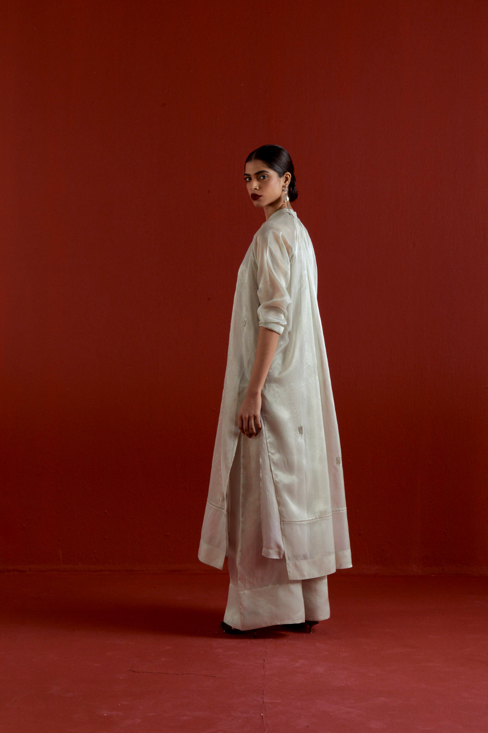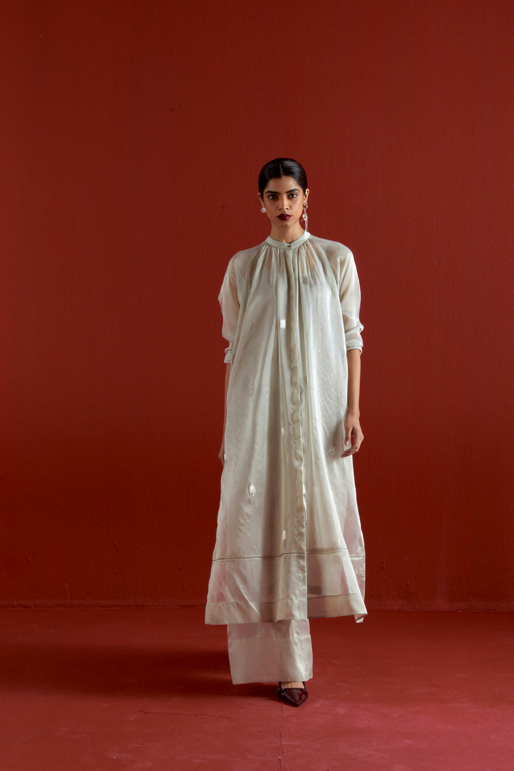 EMB. GATHER NECK SHIRT CO-ORD-METALLIC GREY