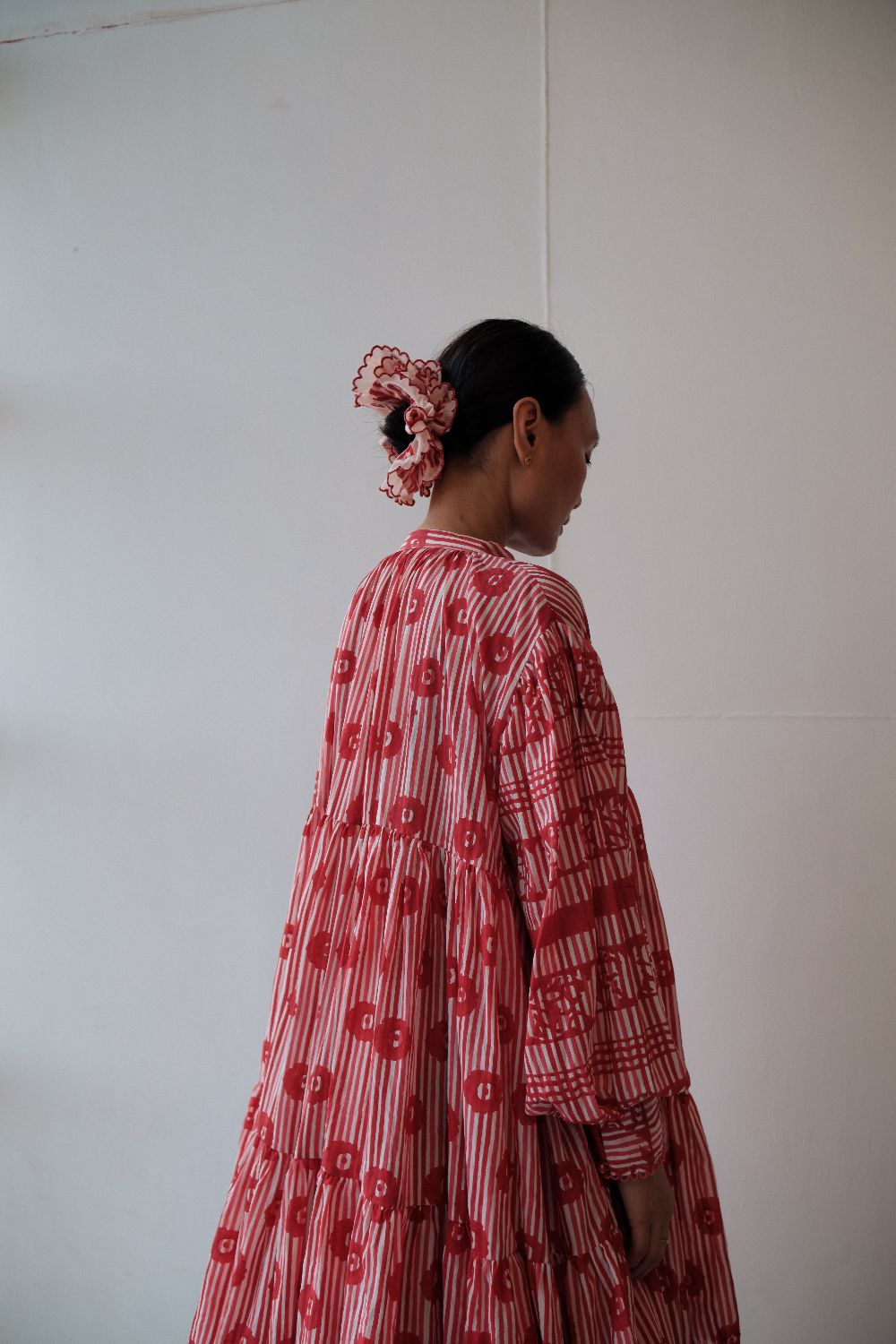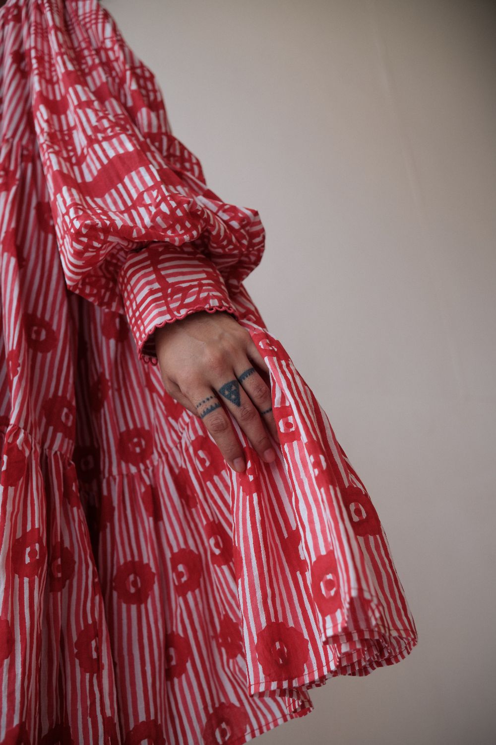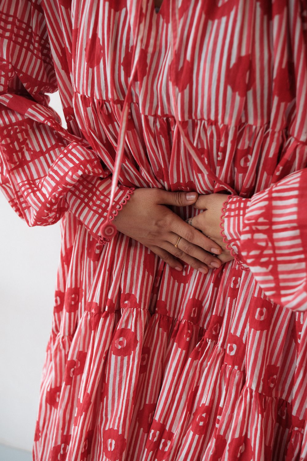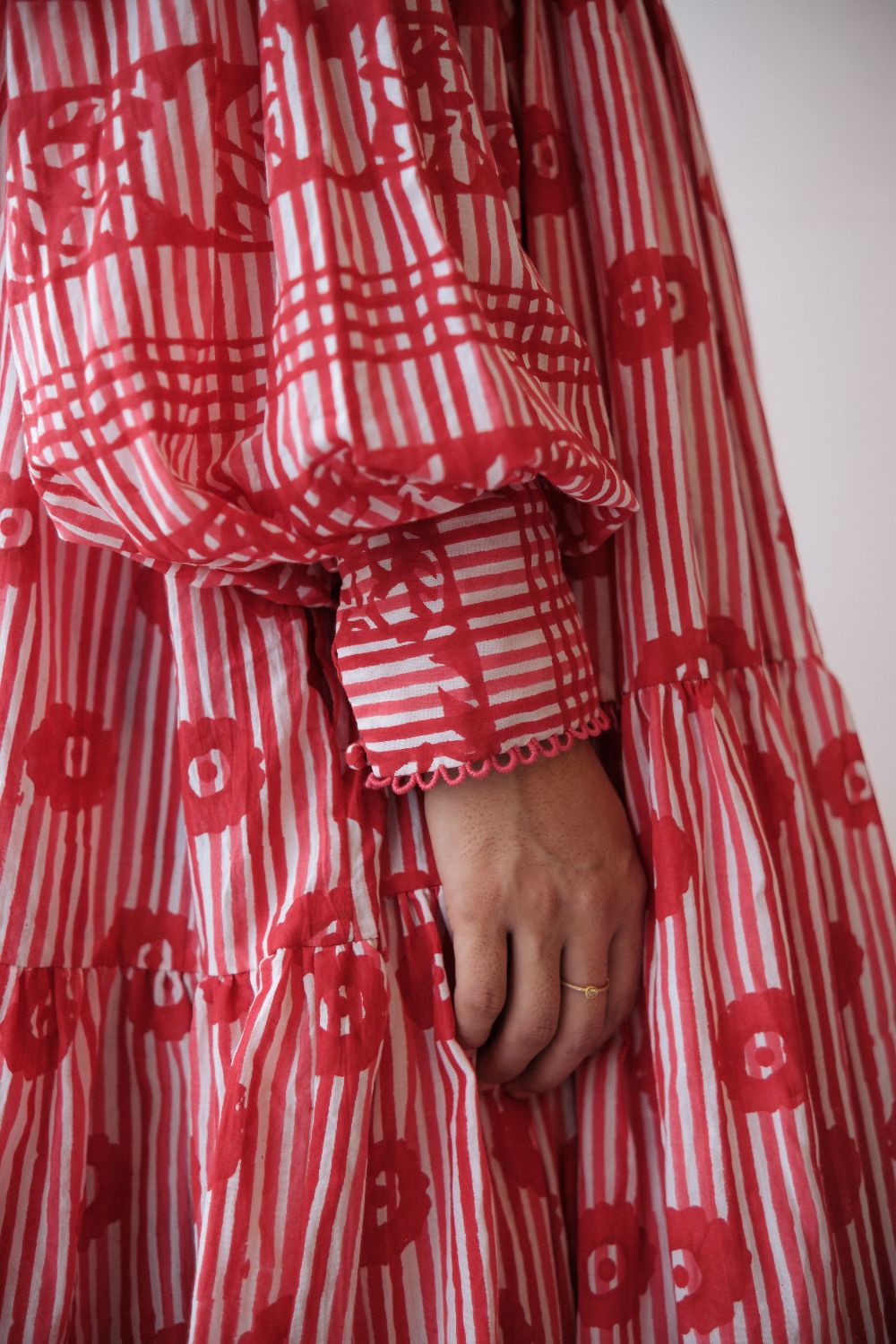 short hand-block printed dress, with hand block printing by our partner artisans in Jaipur. Thread Scalloped detailing on sleeves in colour. Dress is made in cotton.