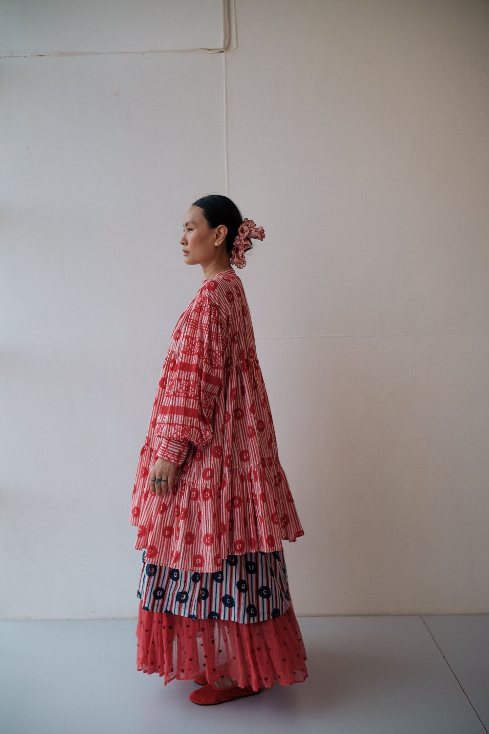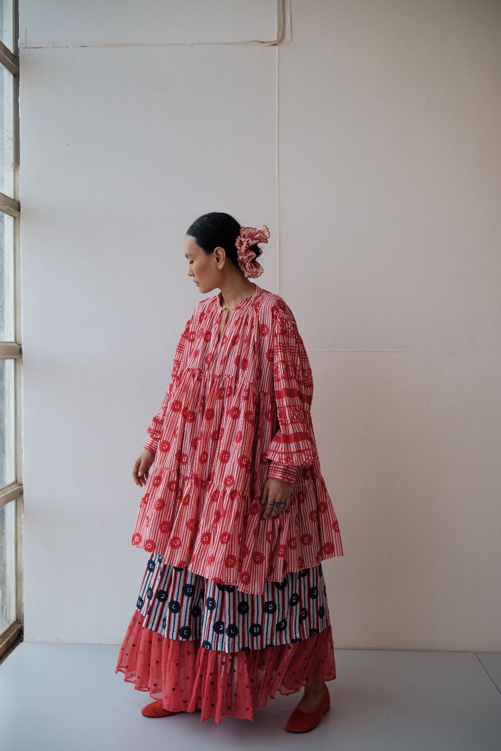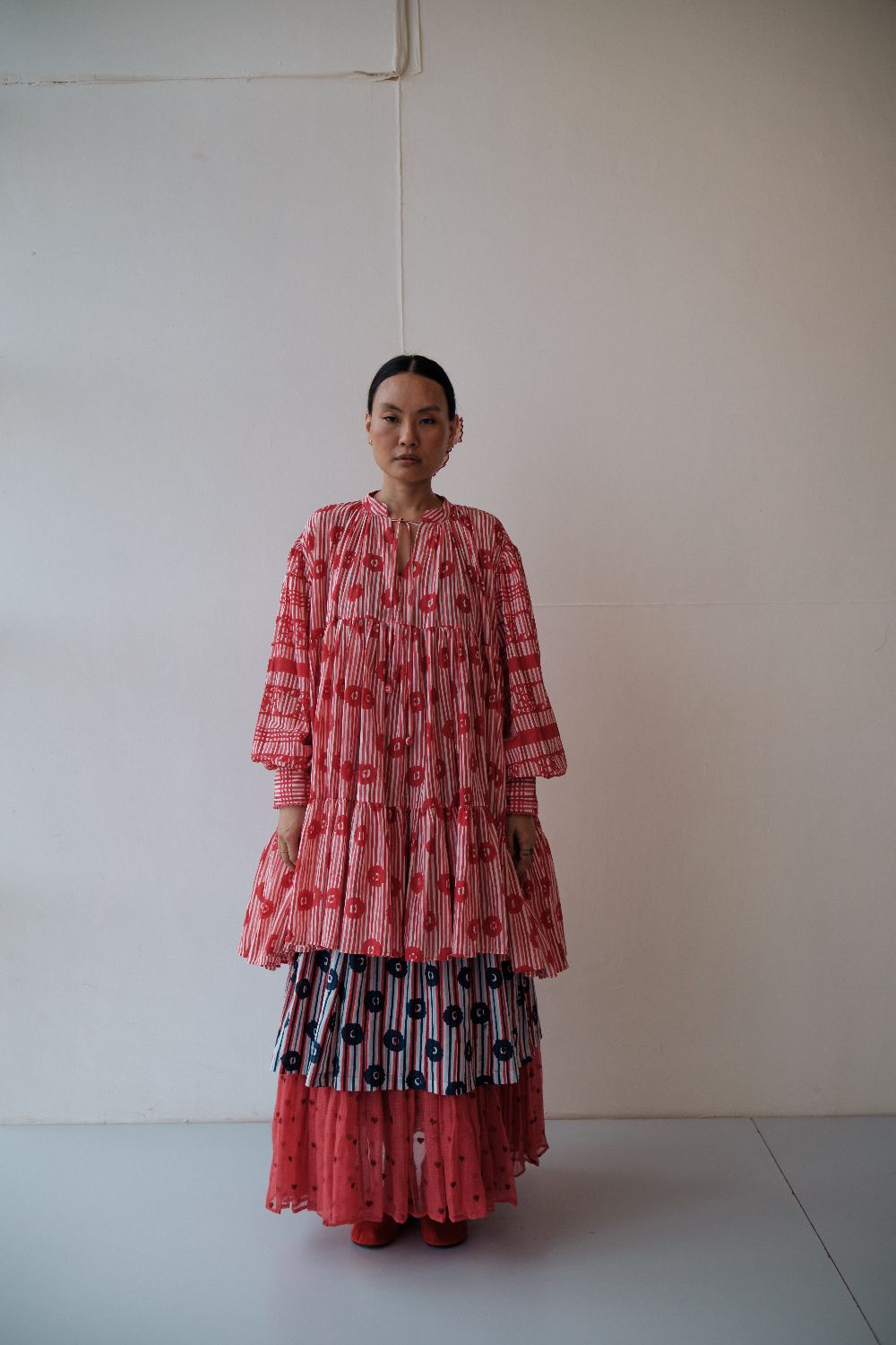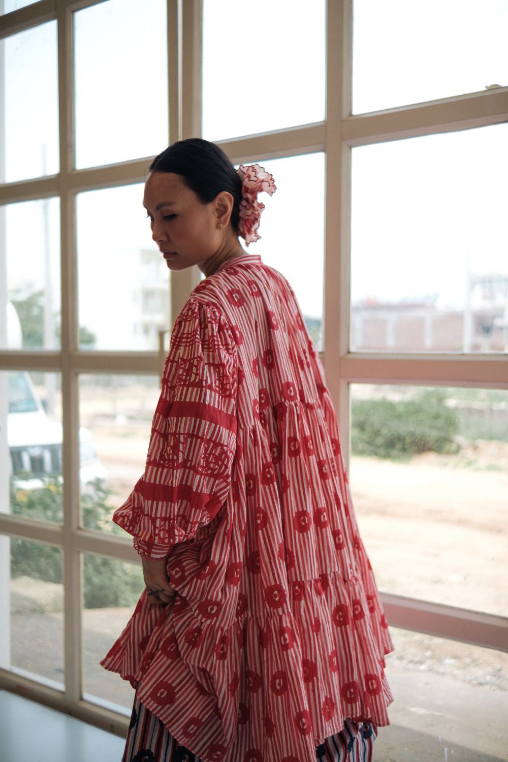 short hand-block printed dress, with hand block printing by our partner artisans in Jaipur. Thread Scalloped detailing on sleeves in colour. Dress is made in cotton.
