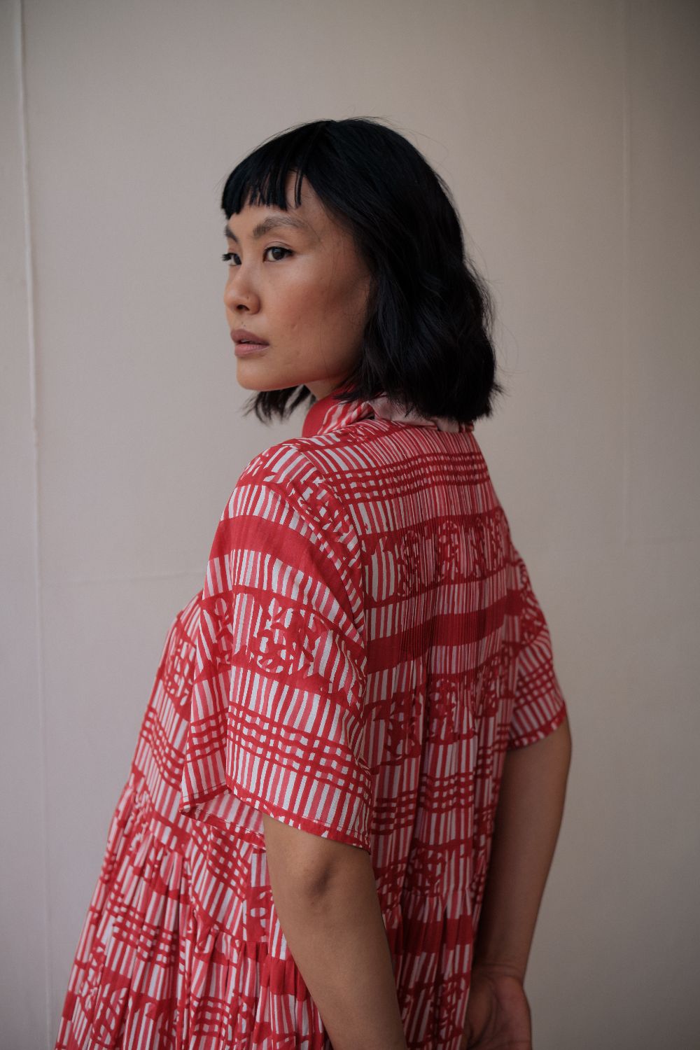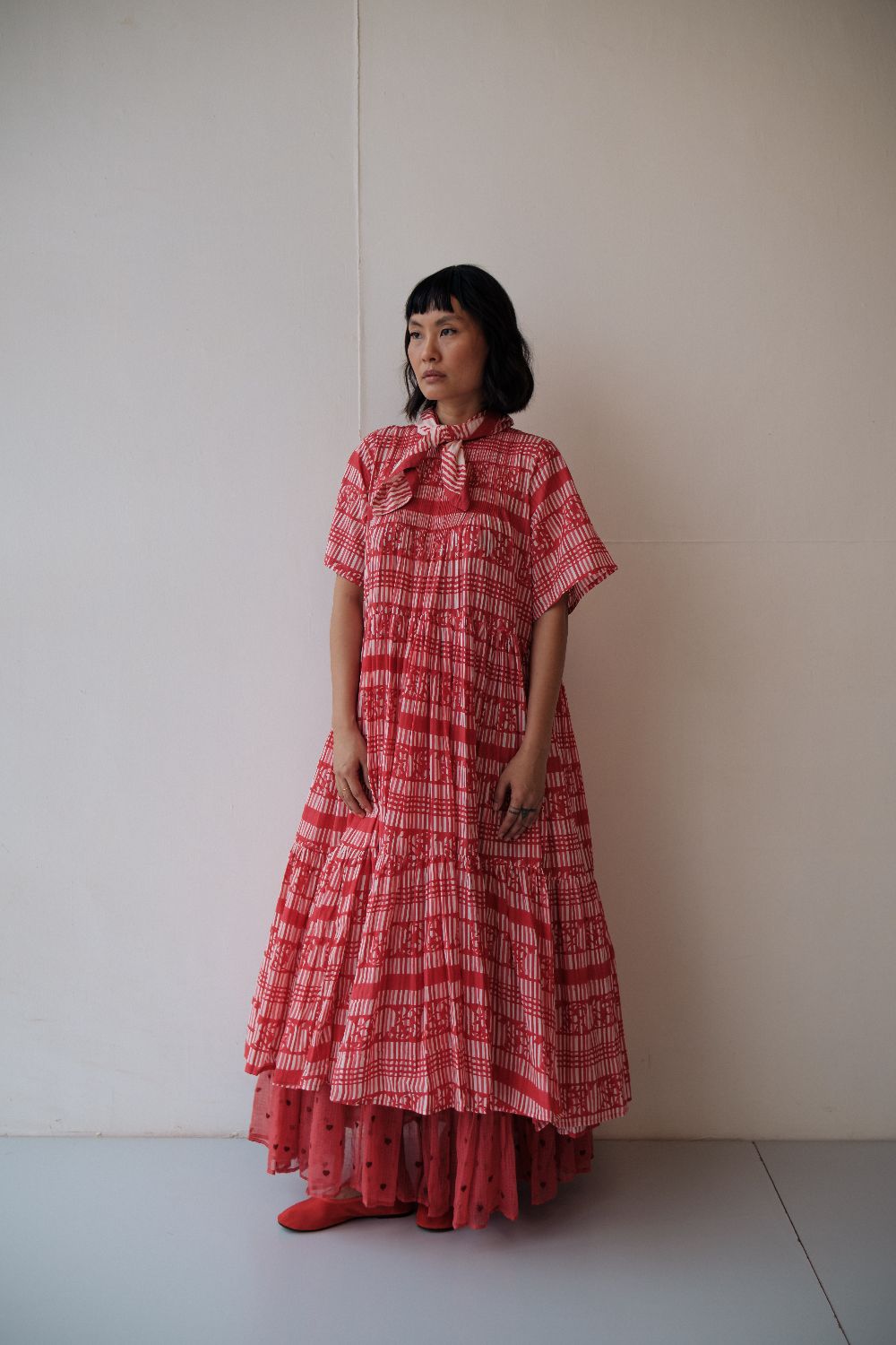 Tiered handblock printed dress in indian cotton.Details of pintucking on neckline .Paired here with a scarf & Maya skirt.