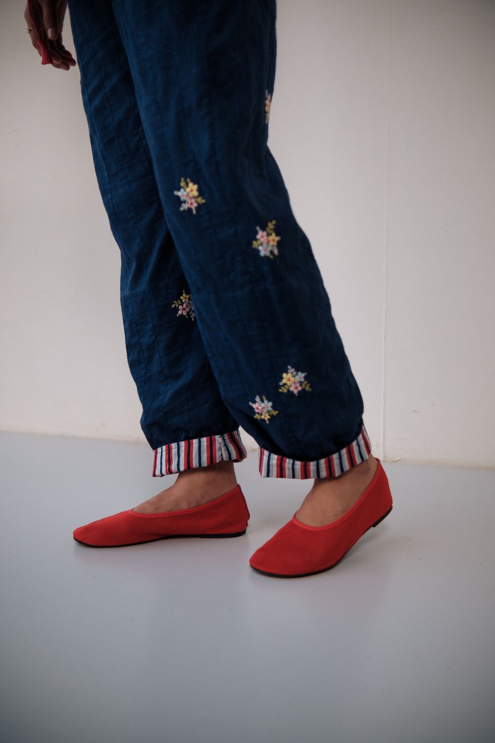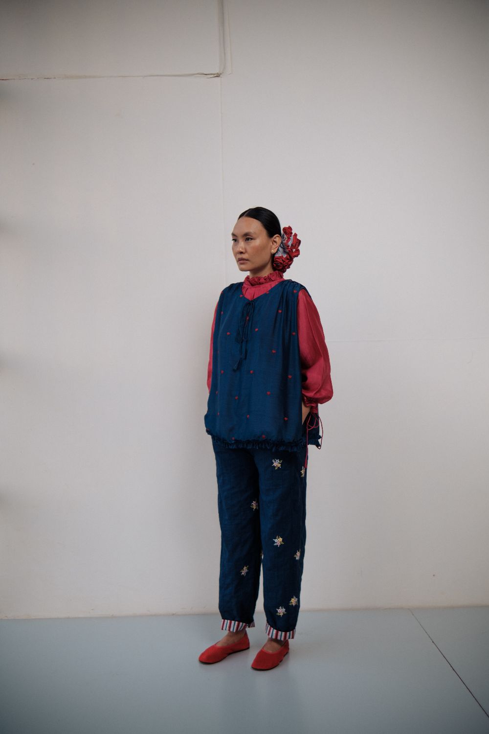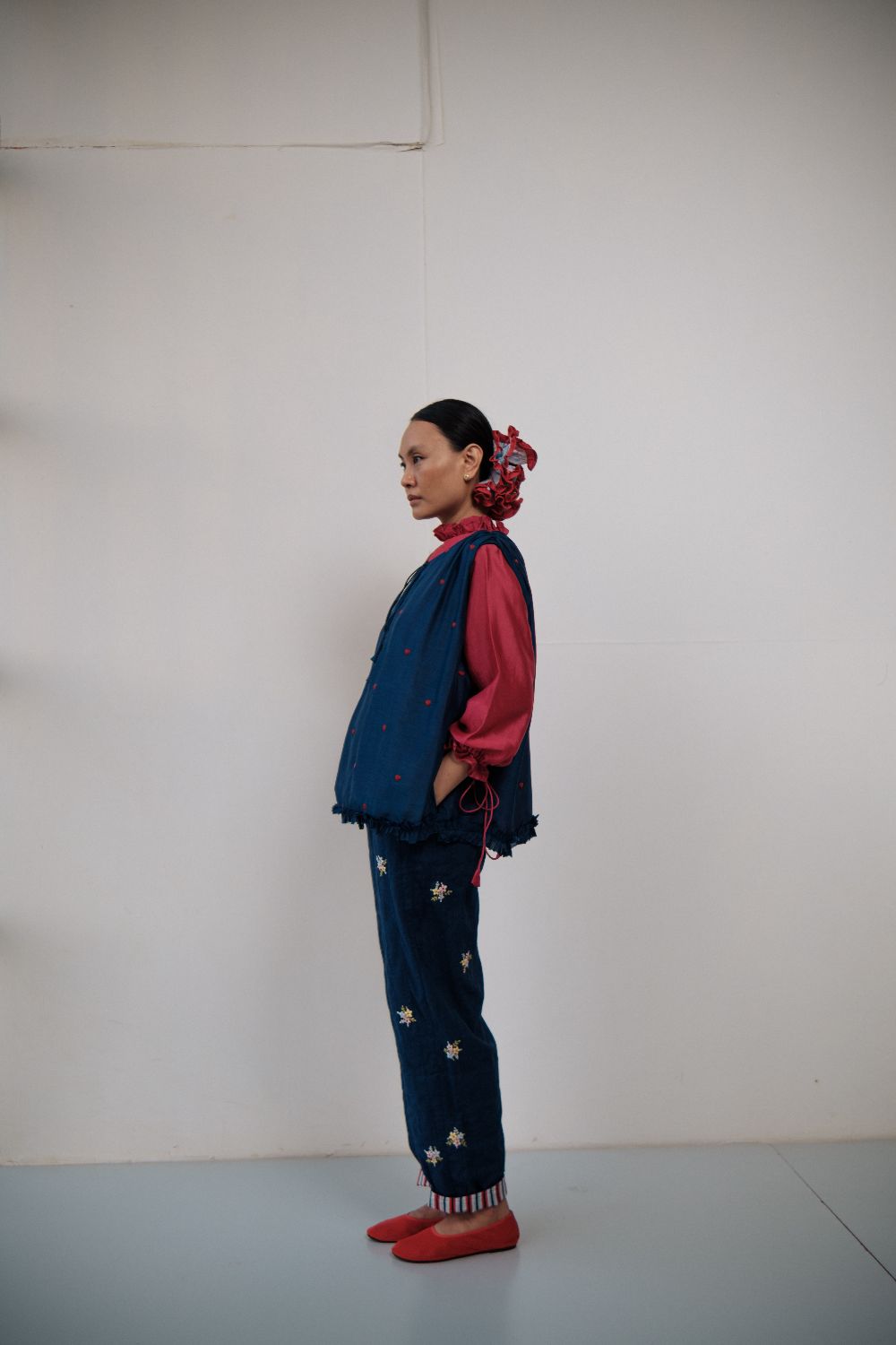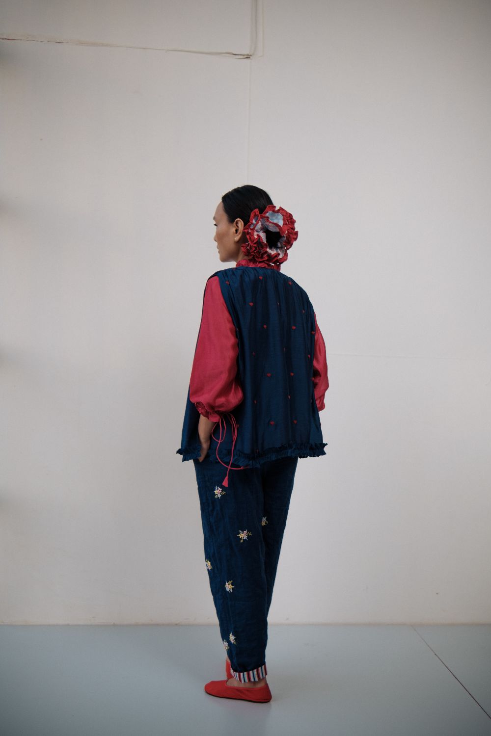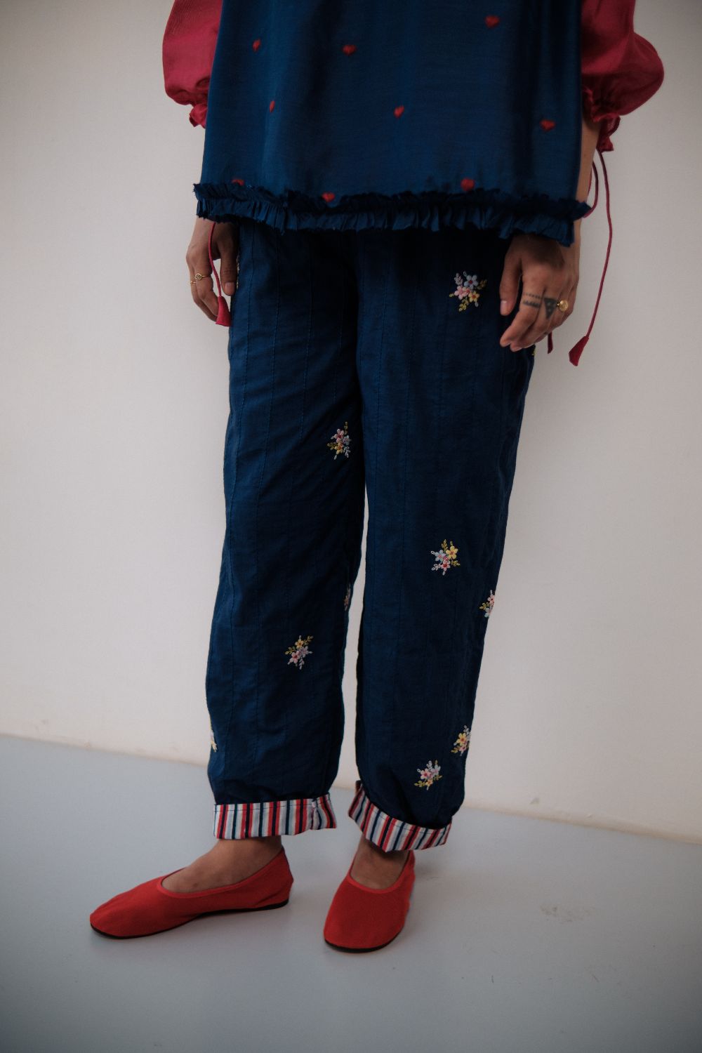 Cotton pants double layered and stitched with bunches of flowers hand embroidered on them, and hand-block printed cotton turn up detailing.These pants are paired with handloom chanderi with handmade fabric buttons detailing and neck gathers. It is further layered with a navy blue Bamber top with