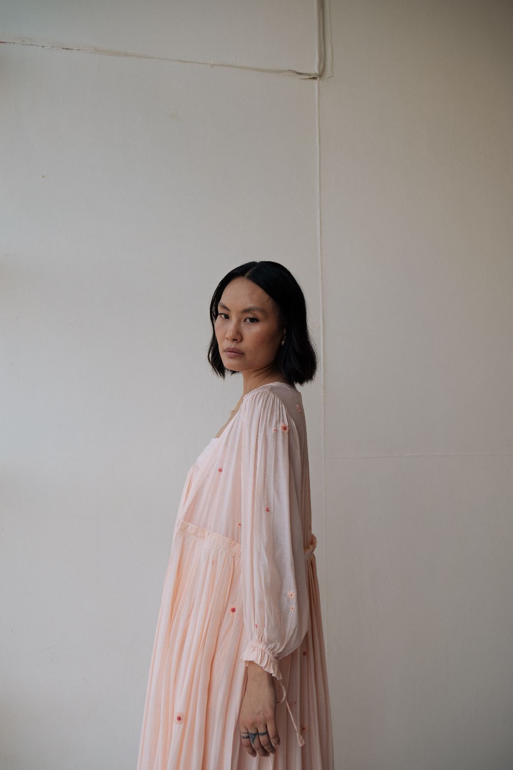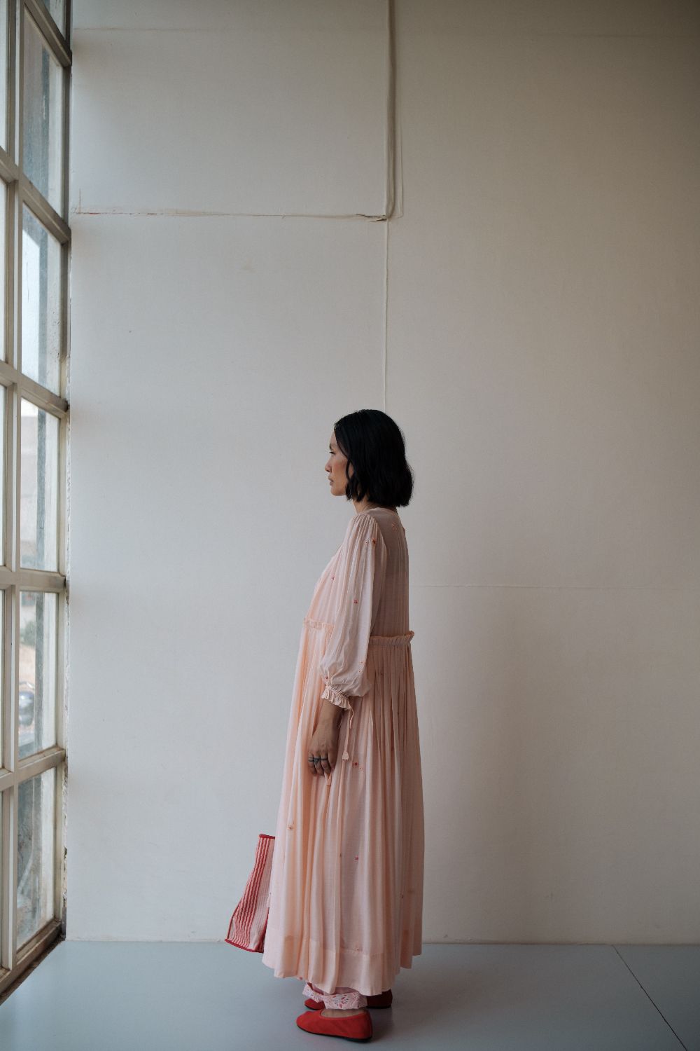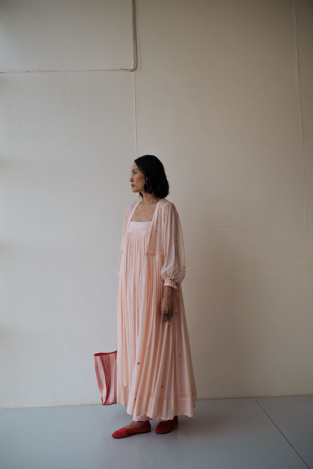 The silhouettes are simple but considered: relaxed cuts, thoughtful details, and fabrics that breathe — from handwoven cottons to delicately finished textiles rooted in Rajasthan’s craft culture. Colours stay close to the earth: muted florals, soft neutrals, and tones that age gracefully rather than fall out of season.