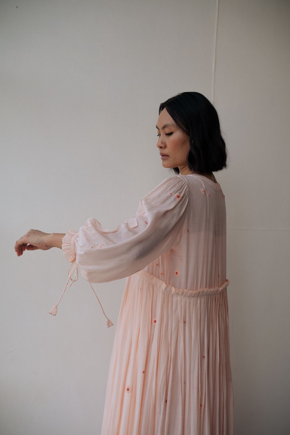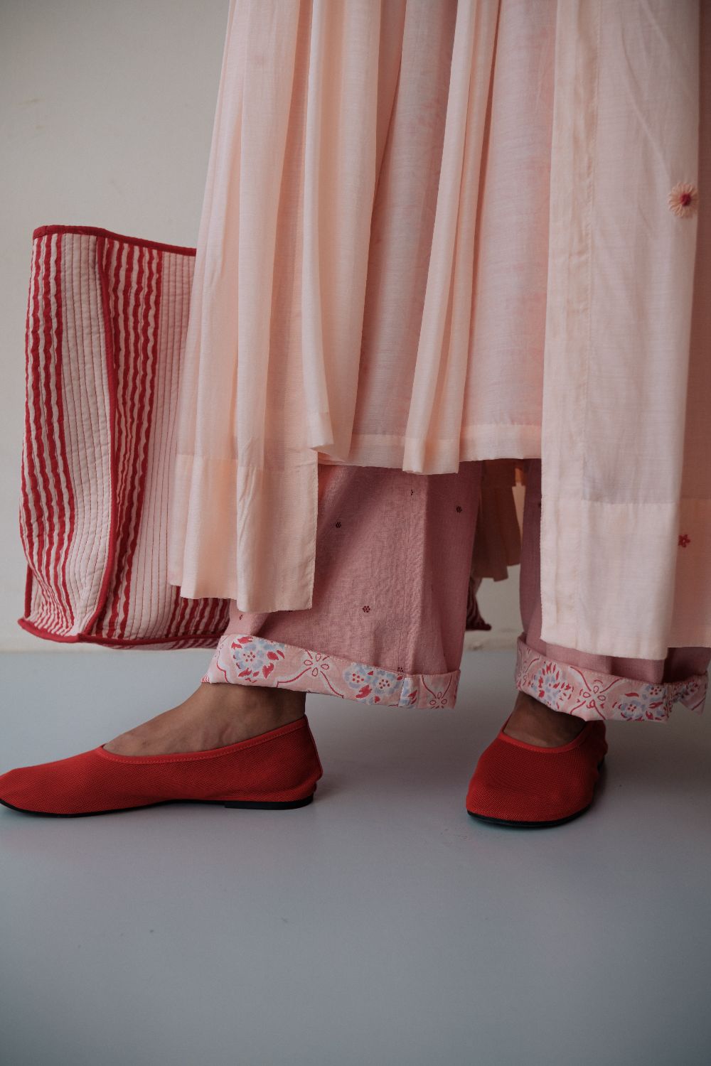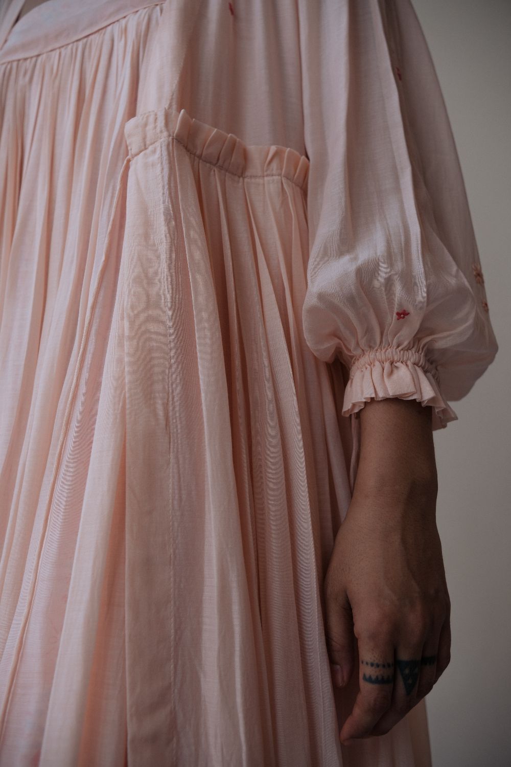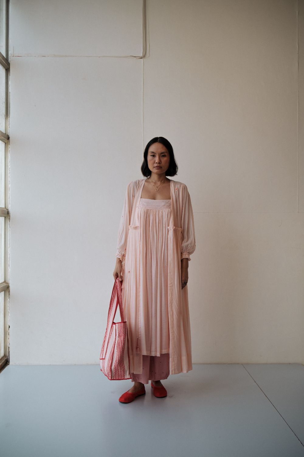 The silhouettes are simple but considered: relaxed cuts, thoughtful details, and fabrics that breathe — from handwoven cottons to delicately finished textiles rooted in Rajasthan’s craft culture. Colours stay close to the earth: muted florals, soft neutrals, and tones that age gracefully rather than fall out of season.