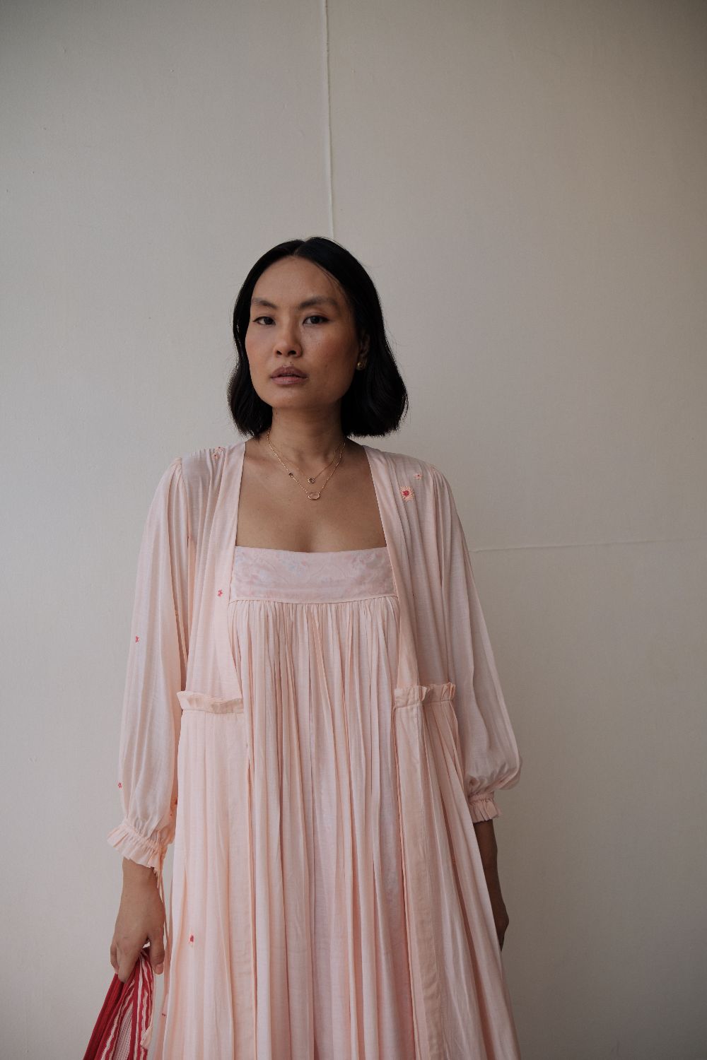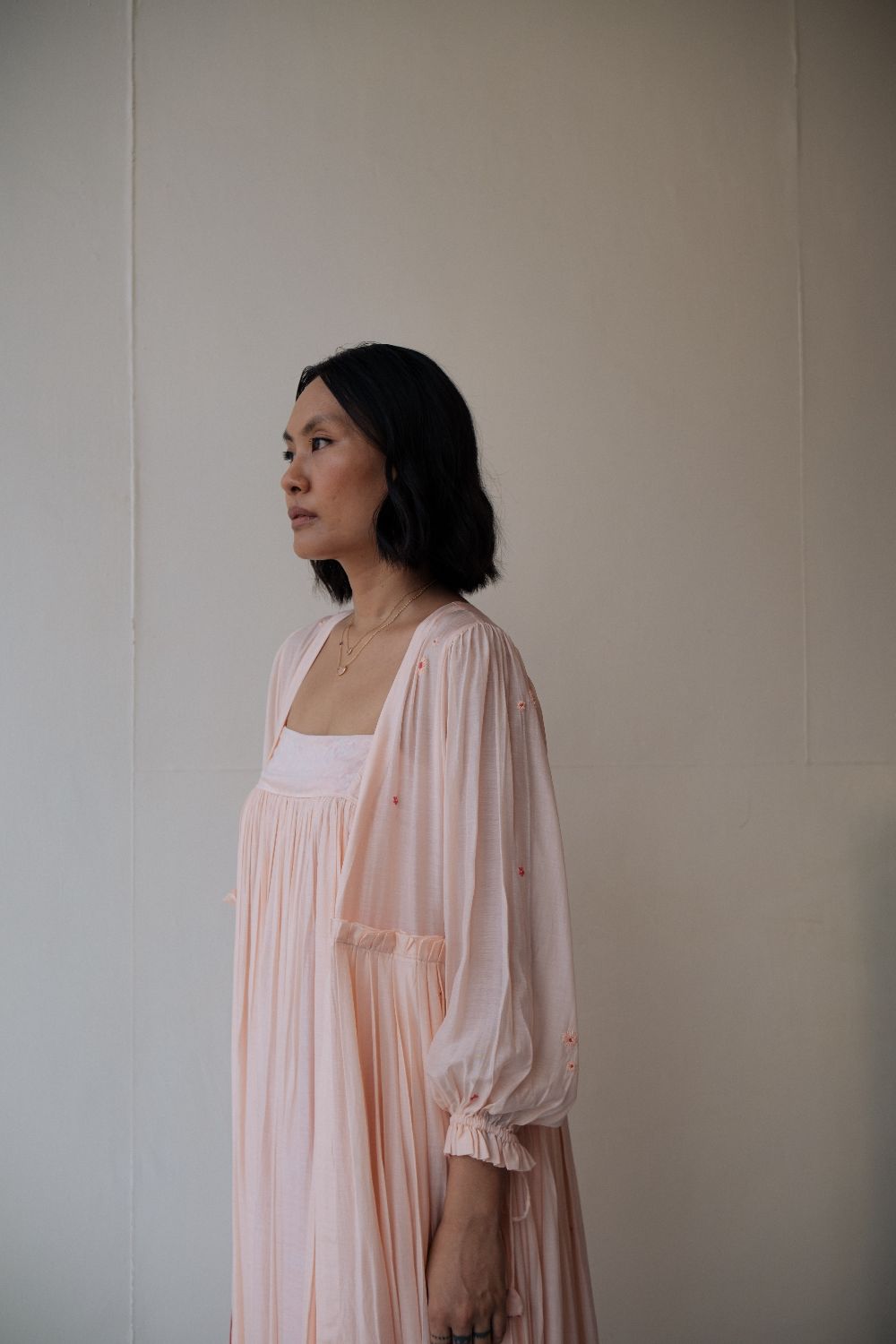 Bamber modal overlay in salmon pink, hand embroidered daisies.Paired here with a strappy salmon dress