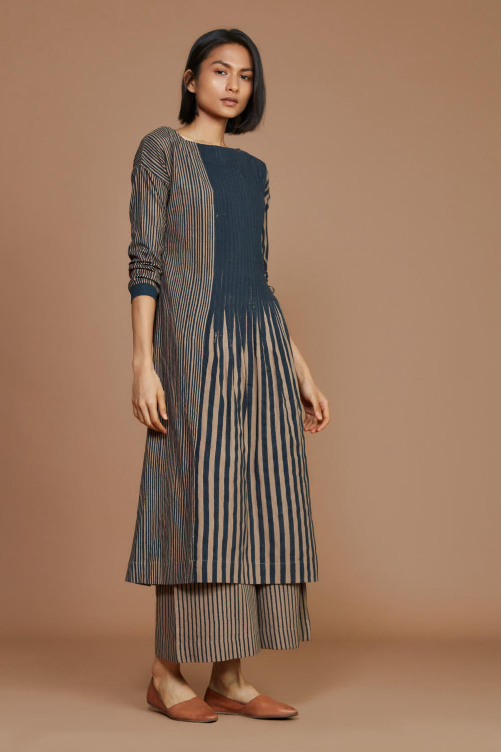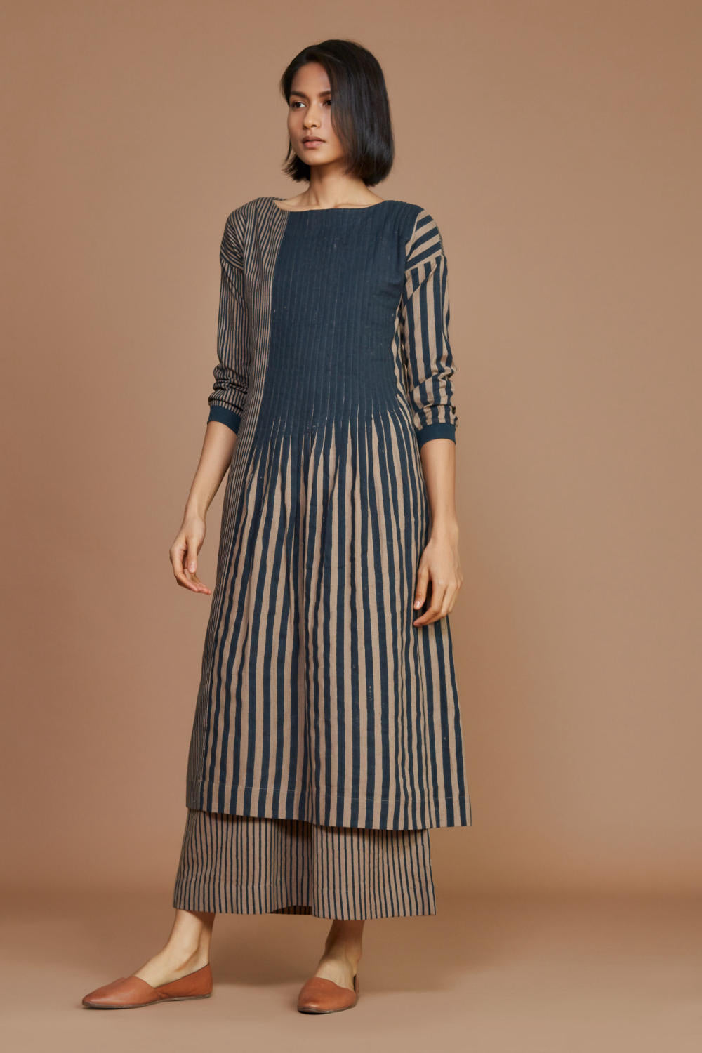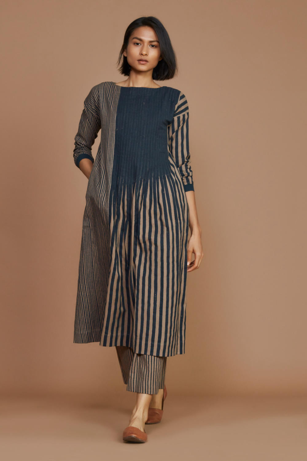 Brown With Charcoal Striped Pleated Co-Ord Set Fashion Mati