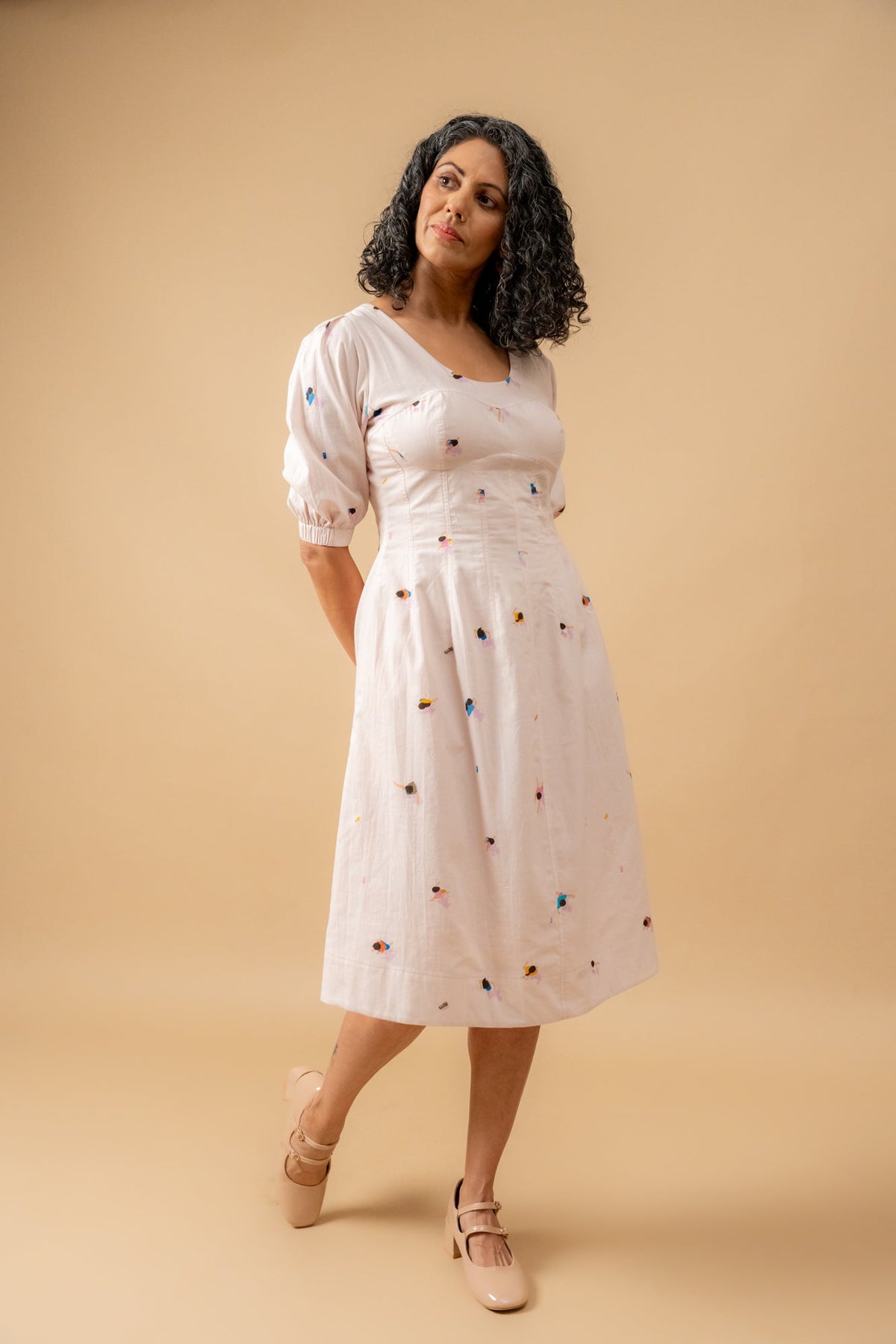 Description: Fitted bustier dress with elasticated sleeves made from upcycled linen.