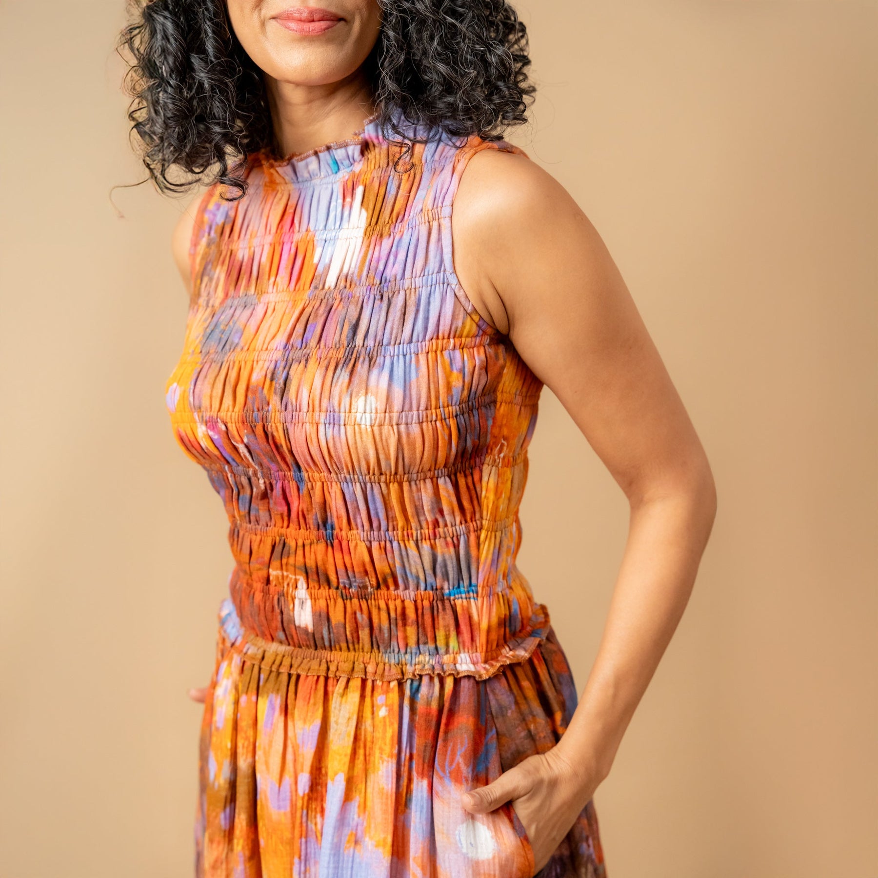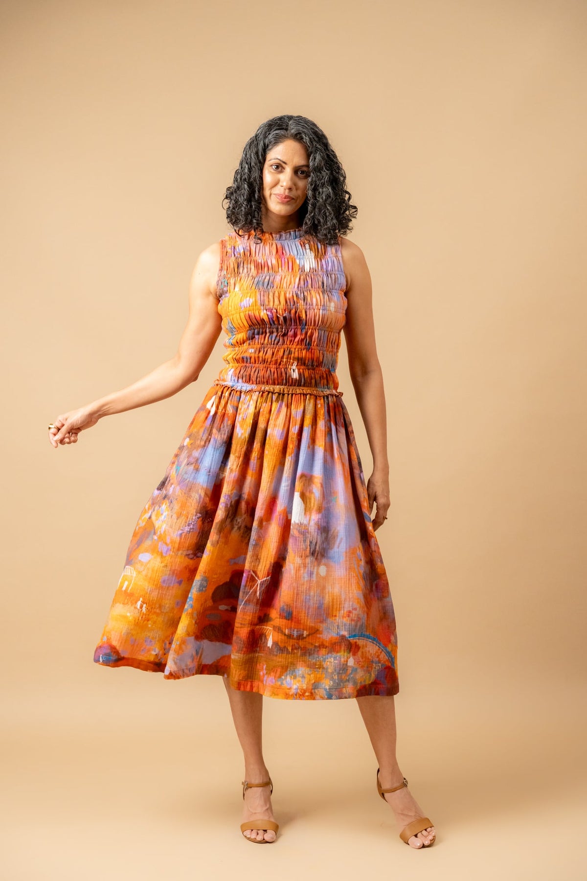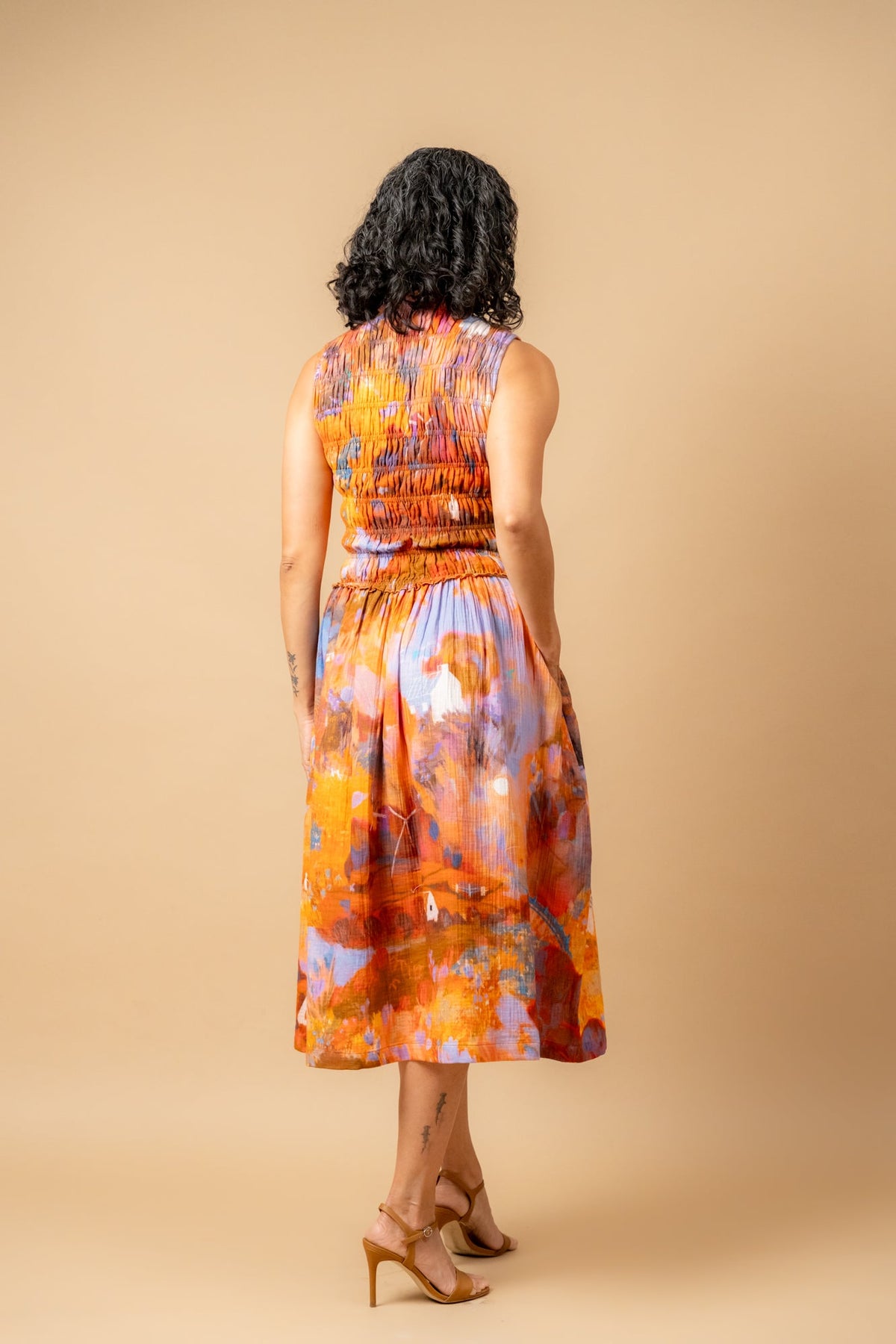 Description: Midi length dress, with smocked top, side pockets made in printed organic cotton gauge.