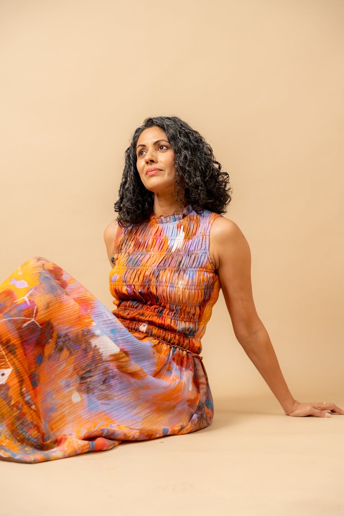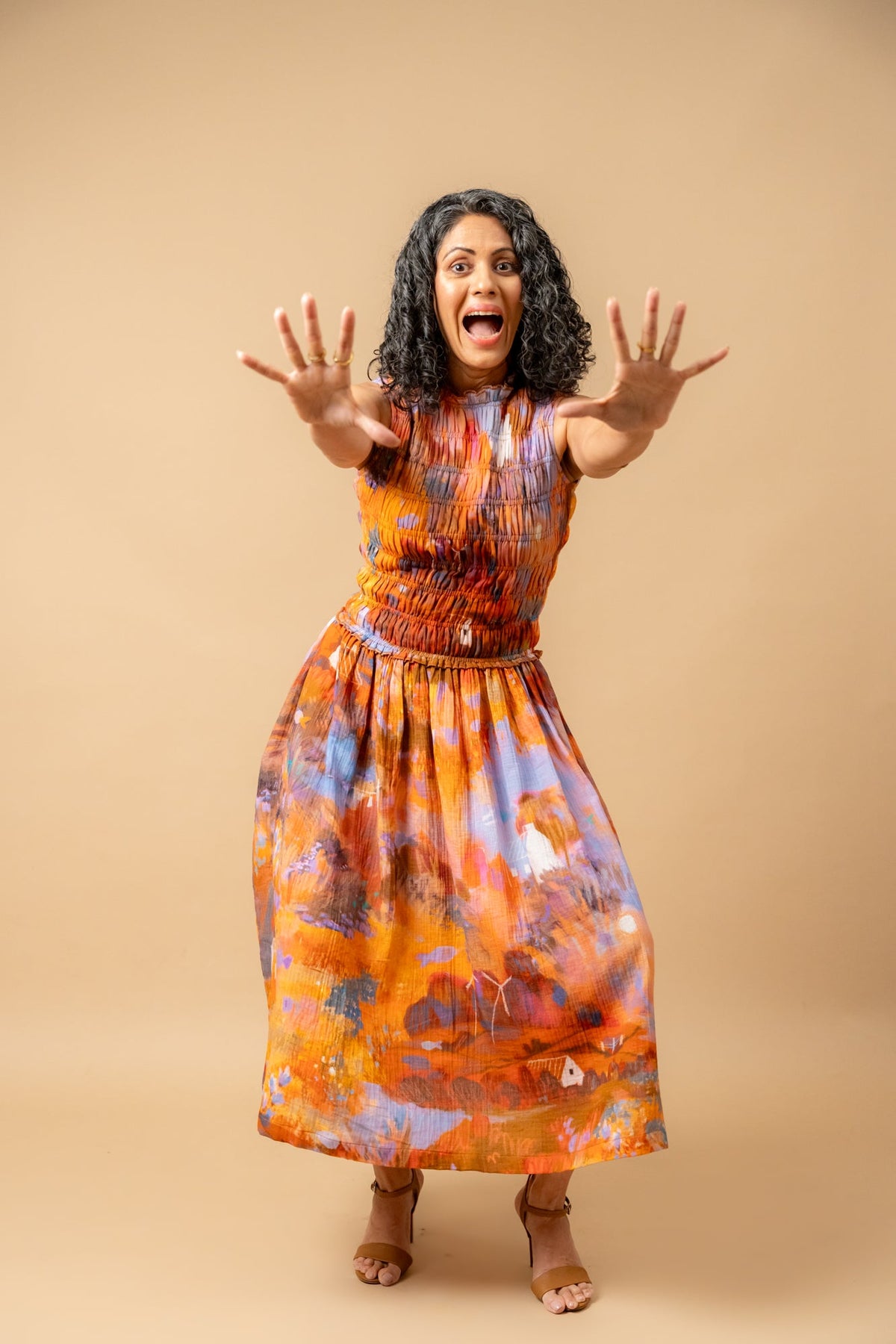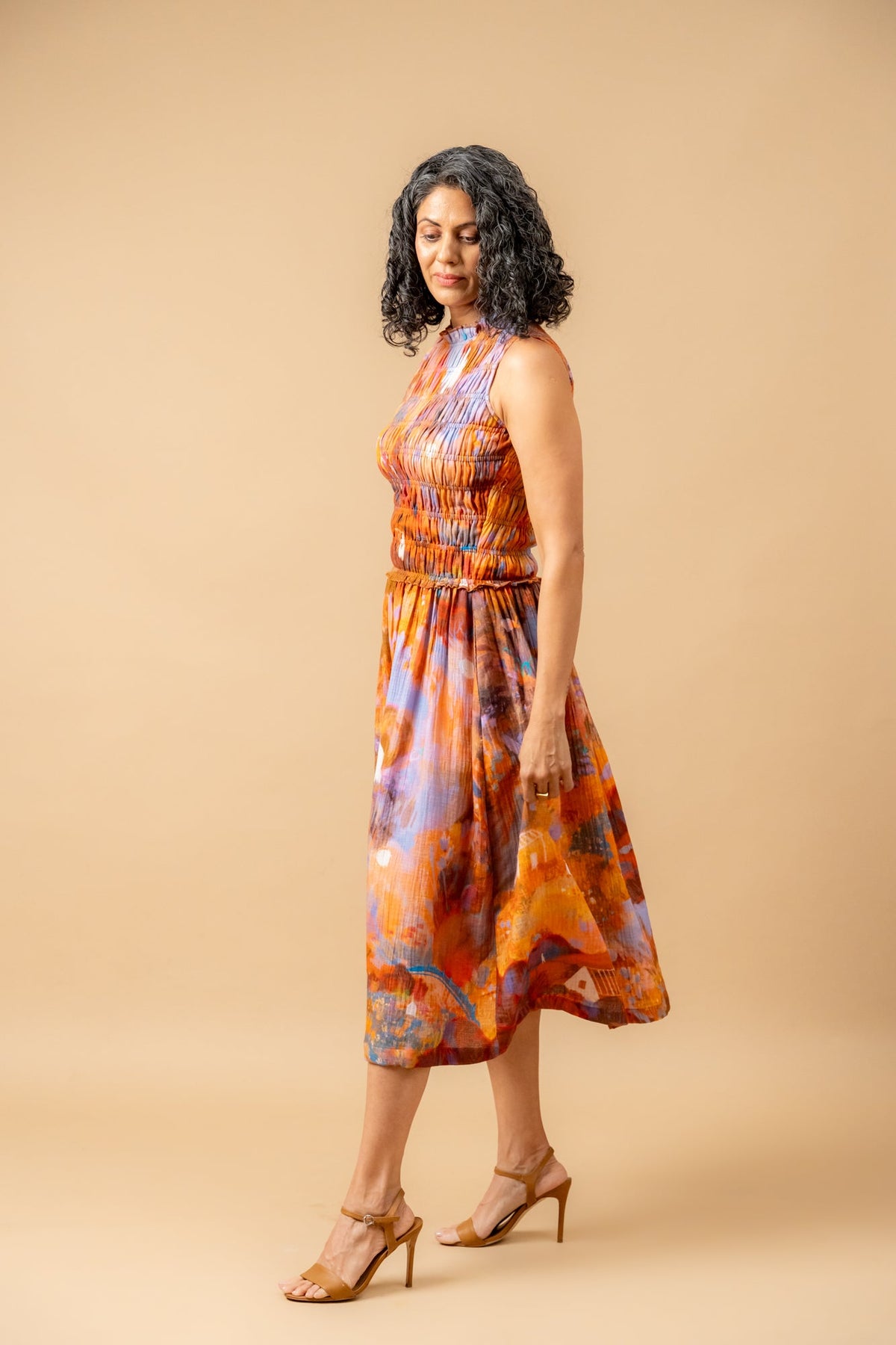 Description: Midi length dress, with smocked top, side pockets made in printed organic cotton gauge.