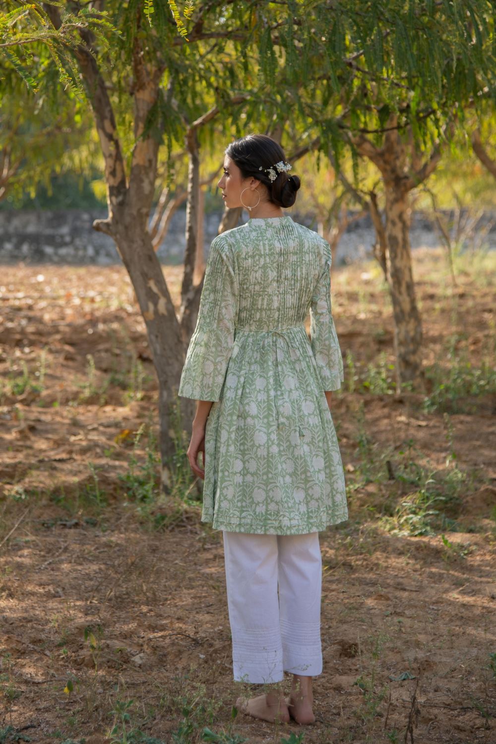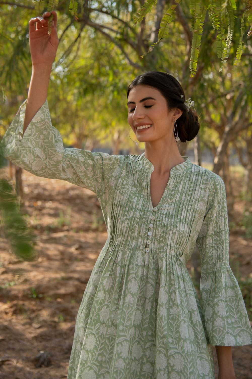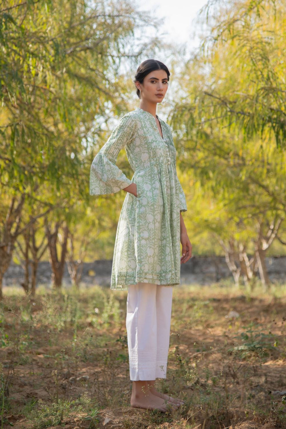 Floral block printed tunic on a soothing green base. Tunic dress with printex ,bell sleeve and pocket details. Wear it is as a dress or style it up with classic white pants. This one is a summer staple.
