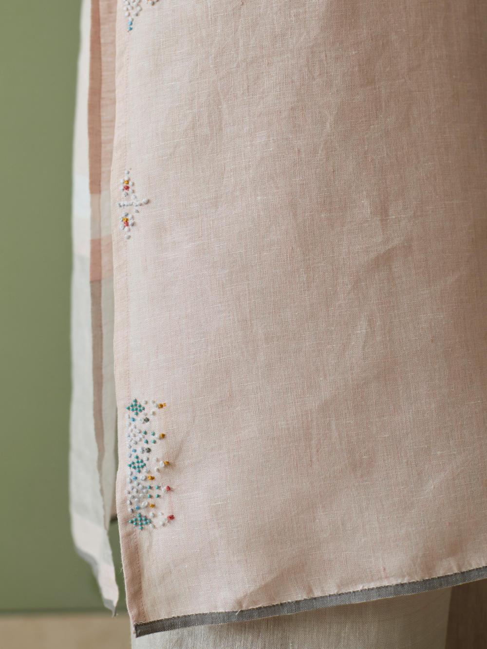 A signature Manan kurta crafted from our soft handwoven metallic border linen with a soft grey selvedge. Hand-embroidered with intricate motifs, along the neckline and side slits, inspired by the timeless age-old Tangalia weave. The hand-embroidery is brought to life through meticulous multi-coloured french knots in threads and fine beadwork, creating a subtle pattern of texture and colour. Wear Vira with our flared pants for a statement, yet comfortable look.