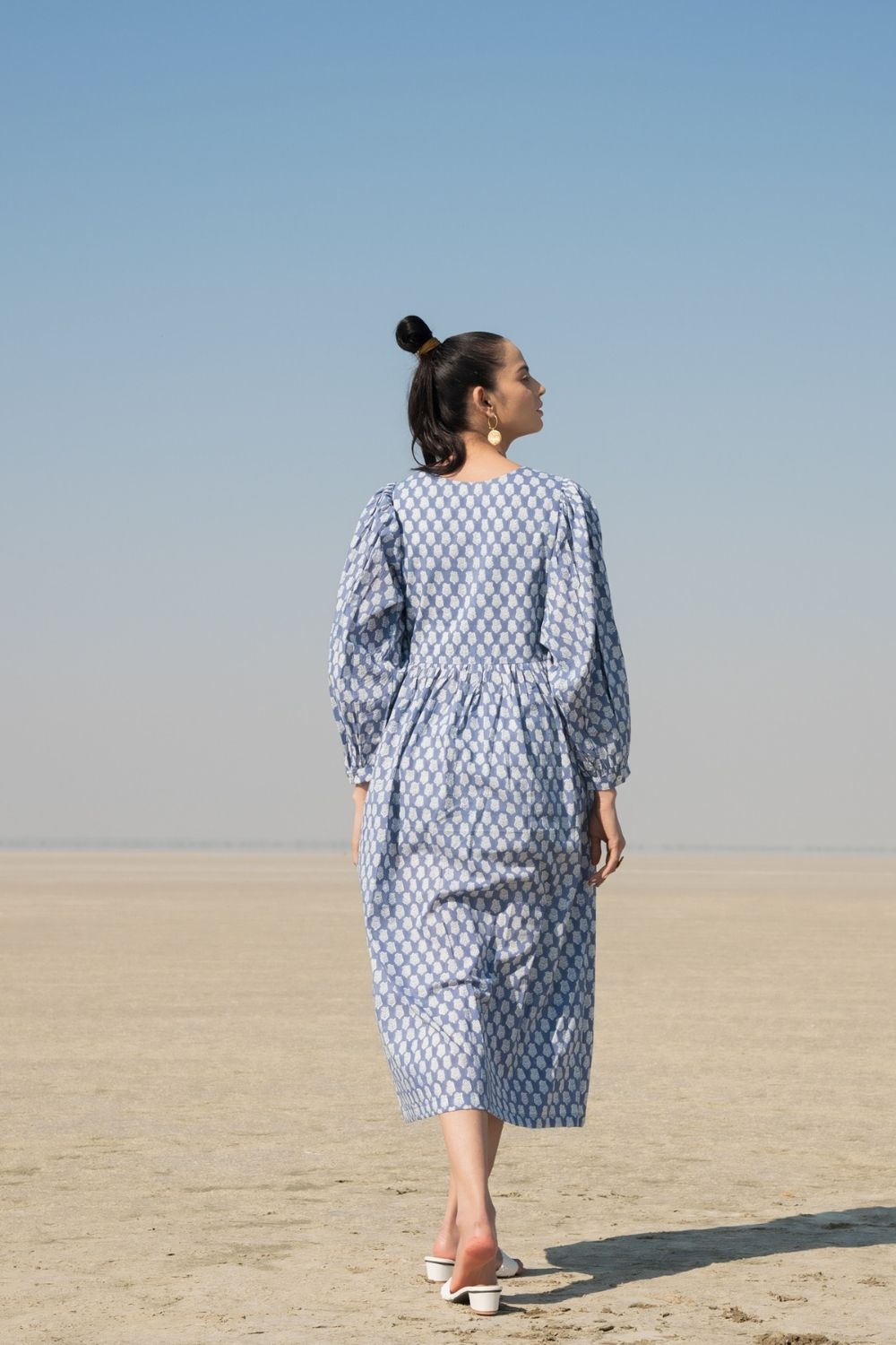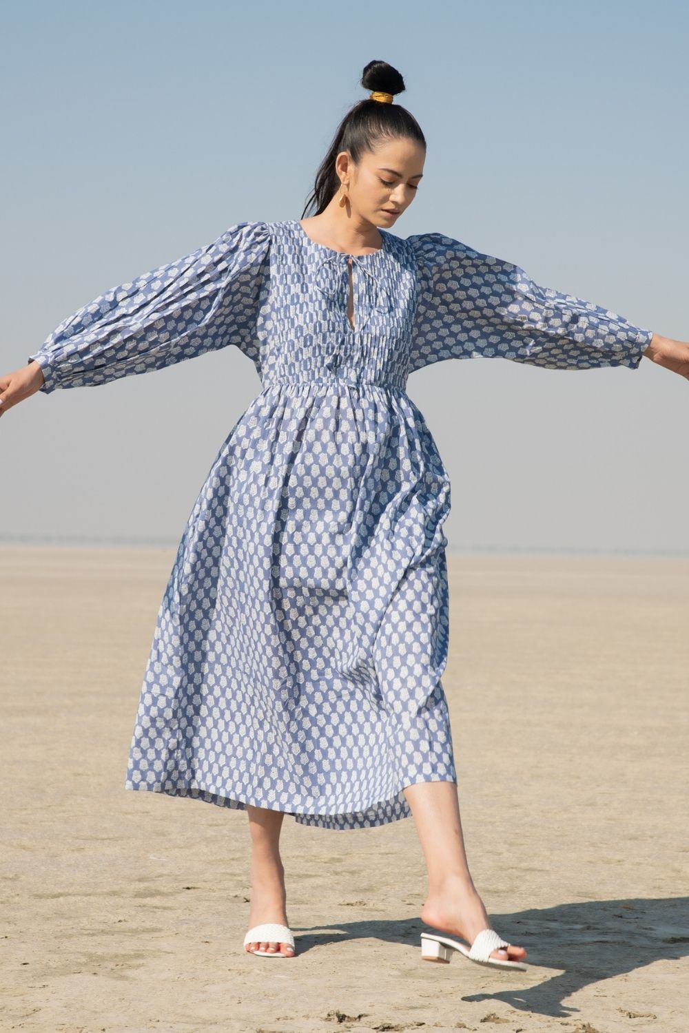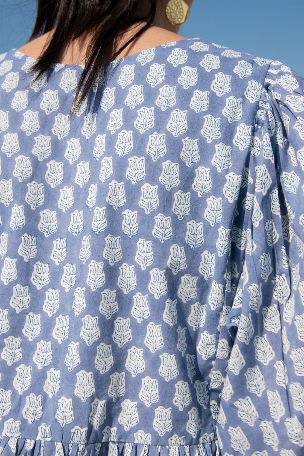 Make your summer style effortless with this gathered blue hand block printed dress. Complete with kaftan style sleeves & a handmade printex detailing on neck, this ones a must have. The print is a soft lotus bud design on a soft cotton base.