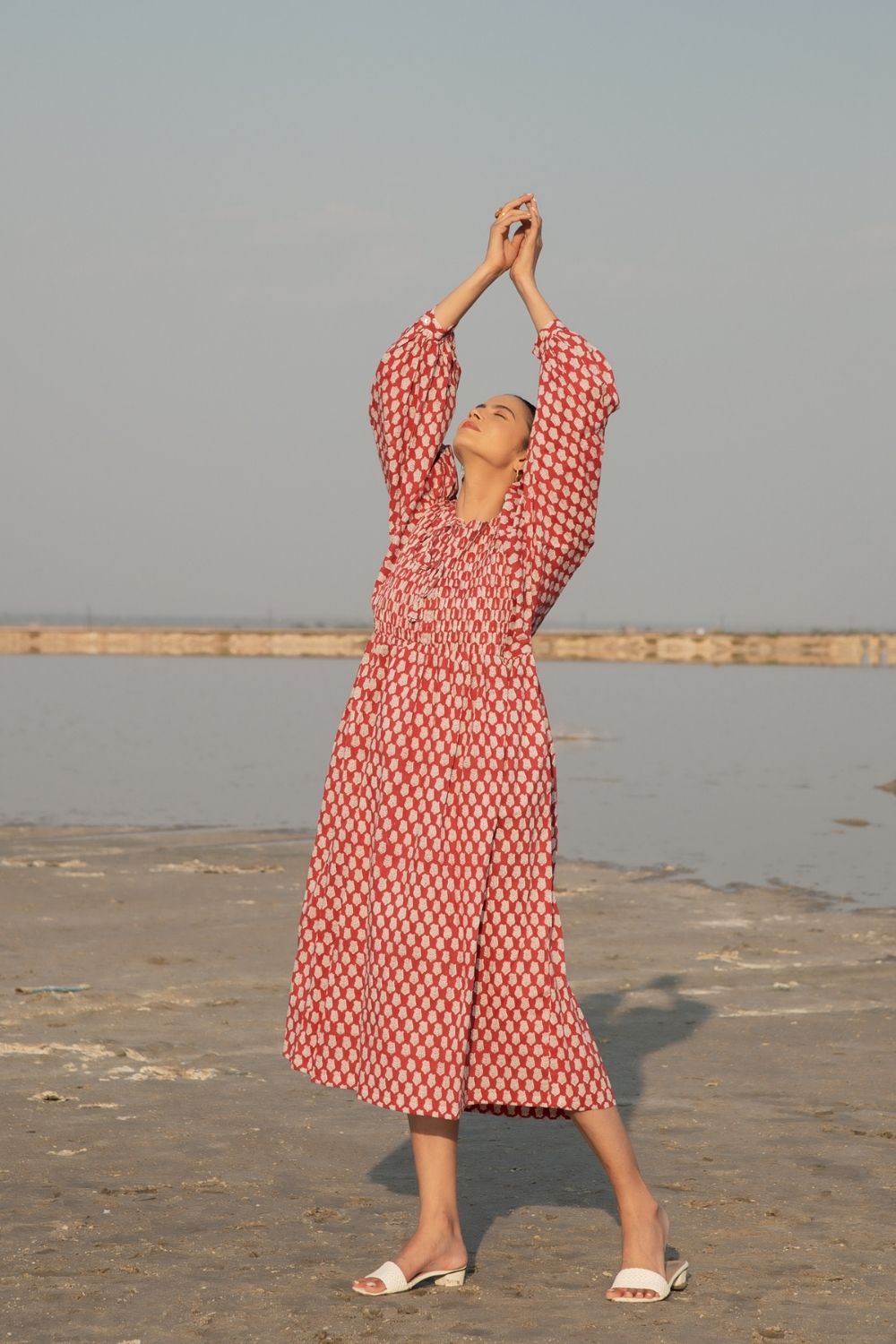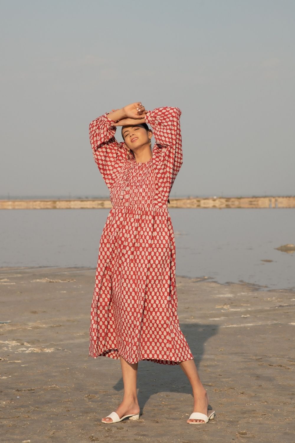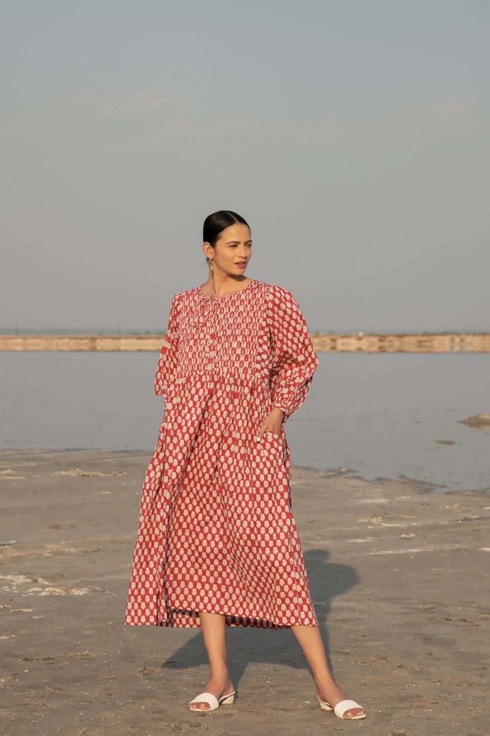 Make your summer style effortless with this gathered red hand block printed dress. Complete with kaftan style sleeves & a handmade printex detailing on neck, this ones a must have. The print is a soft lotus bud design on a soft cotton base.