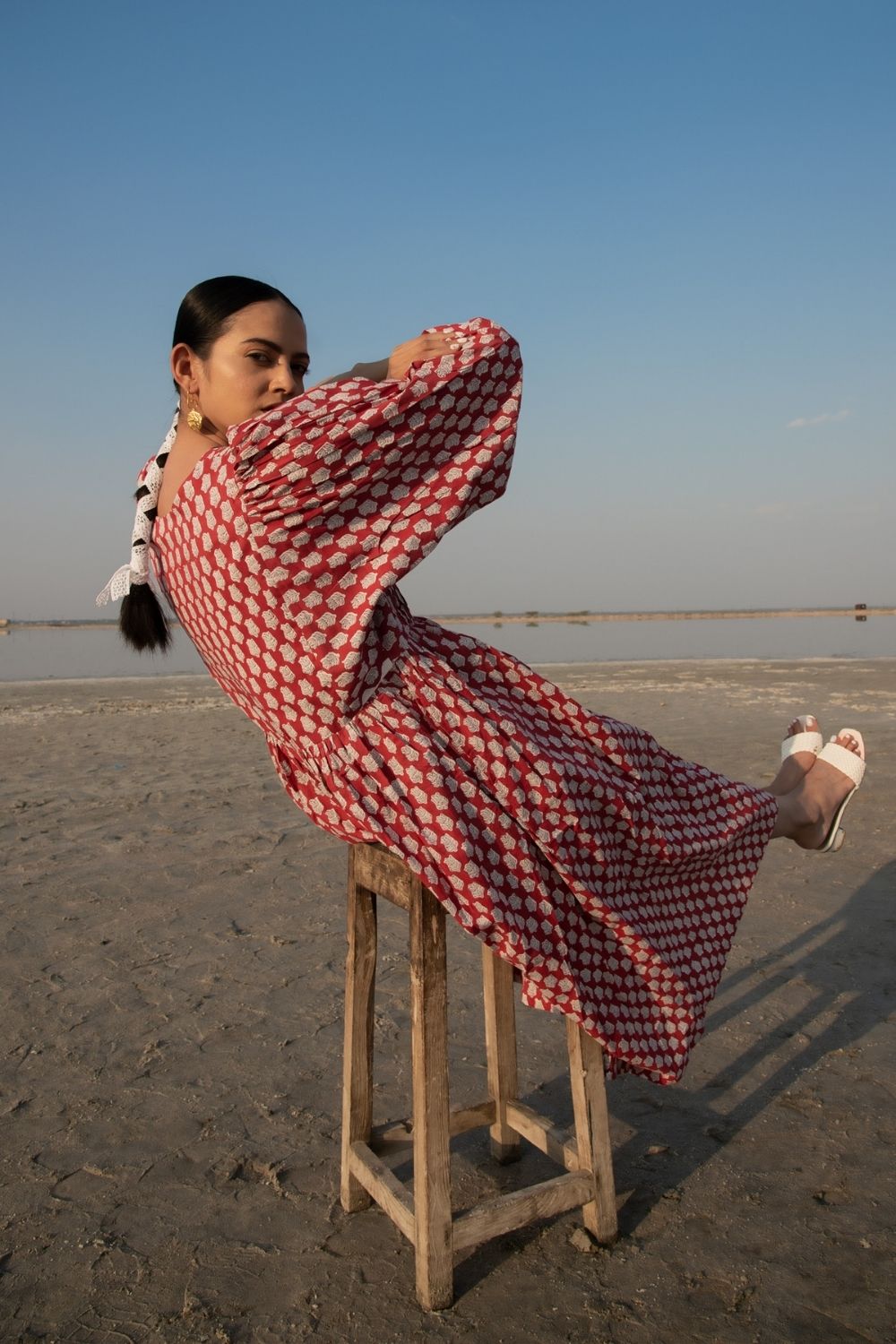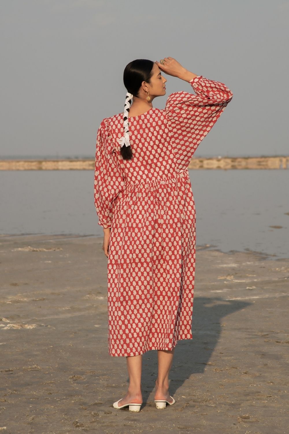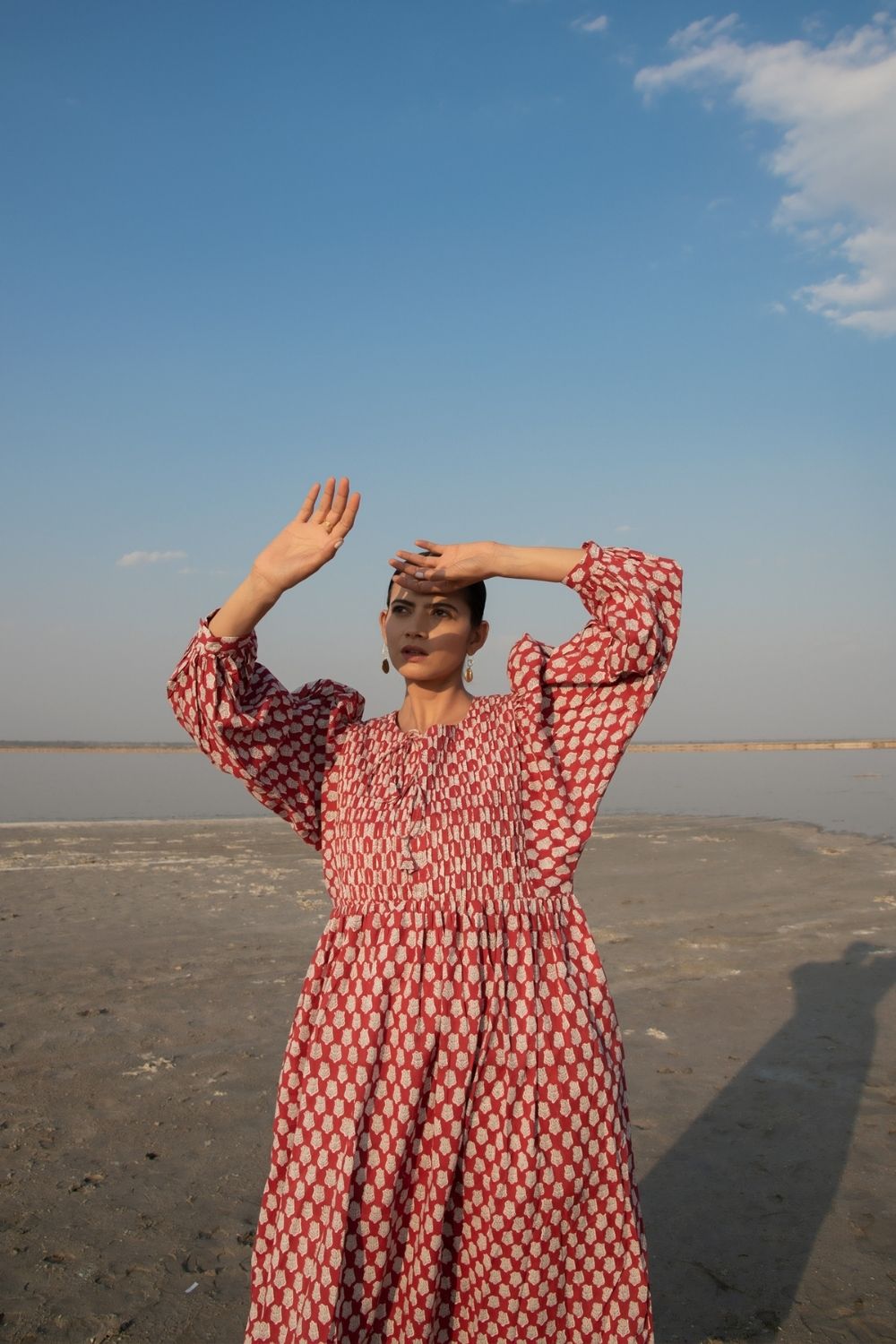 Make your summer style effortless with this gathered red hand block printed dress. Complete with kaftan style sleeves & a handmade printex detailing on neck, this ones a must have. The print is a soft lotus bud design on a soft cotton base.