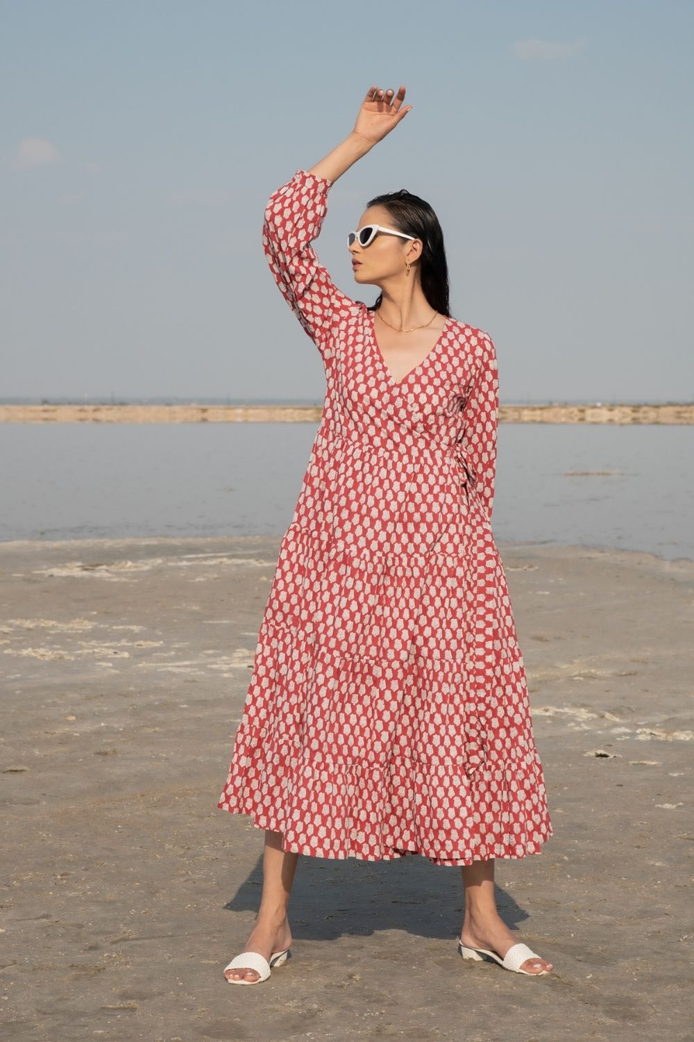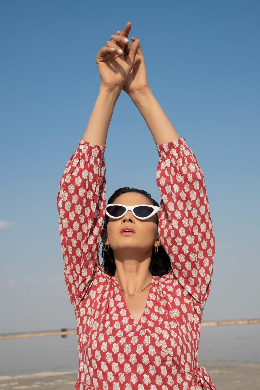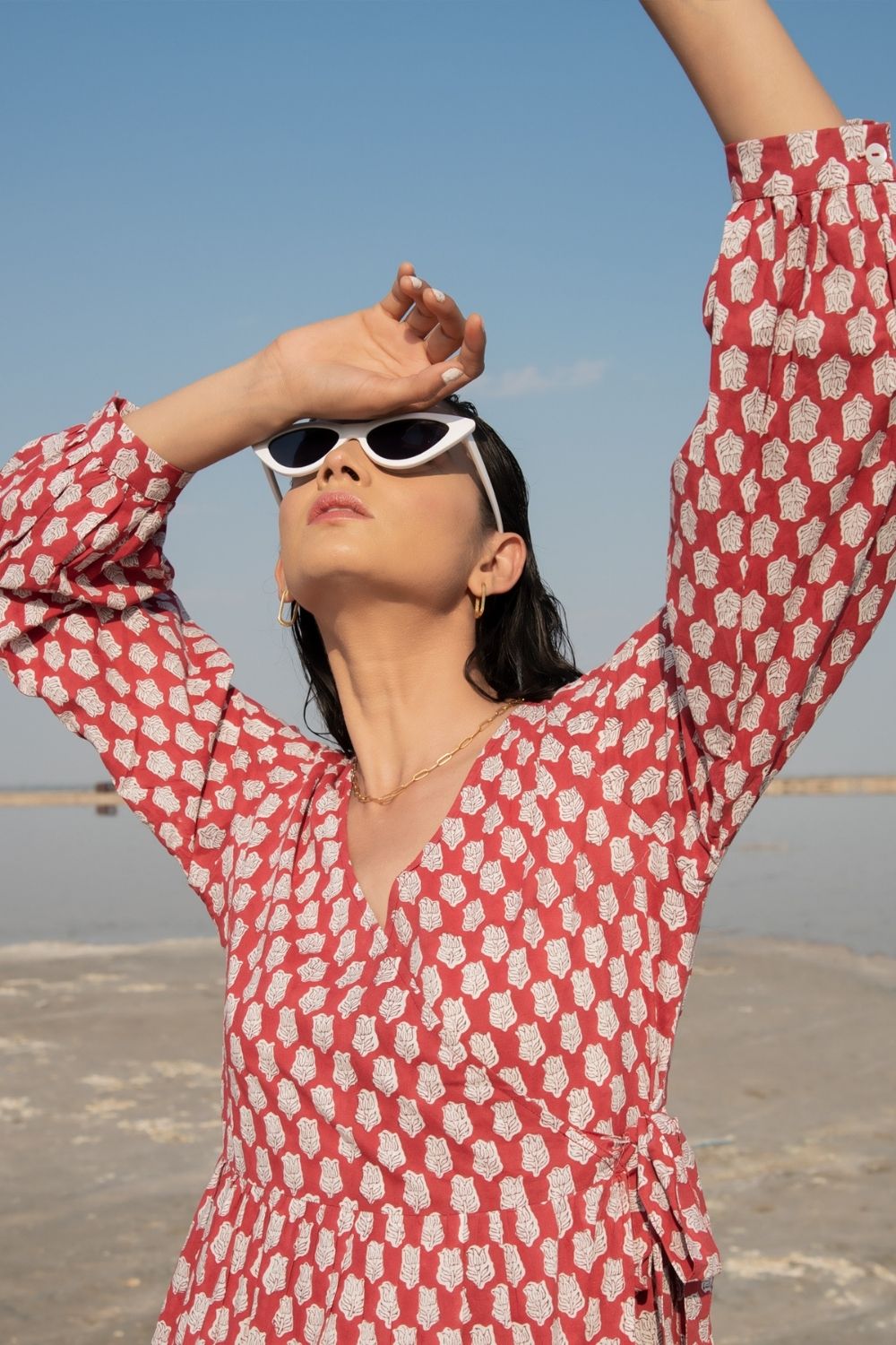 Wrap dresses are versatile and can be tied in multiple ways. This one is red handblock printed in a soft lotus print and has loads of volume and flounce. The puffed sleeves complete the look and tie it all together! Dress is down for a sunday brunch, or dress is up for an intimate dinner with friends.