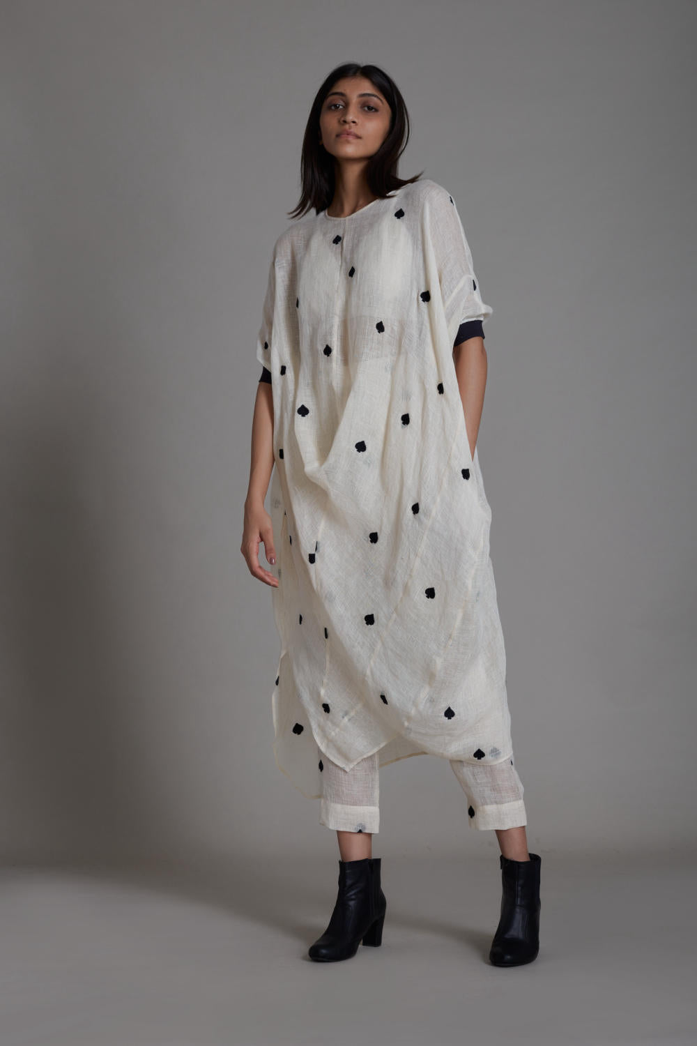 Our classic draped cowl silhouette !! the embroidery on linen gives it a festive feel and the ribbed sleeve round and side pockets give it a comfortable touch!! A perfect pick for your Diwali parties !! also handwoven cotton bralette inner comes with the set.