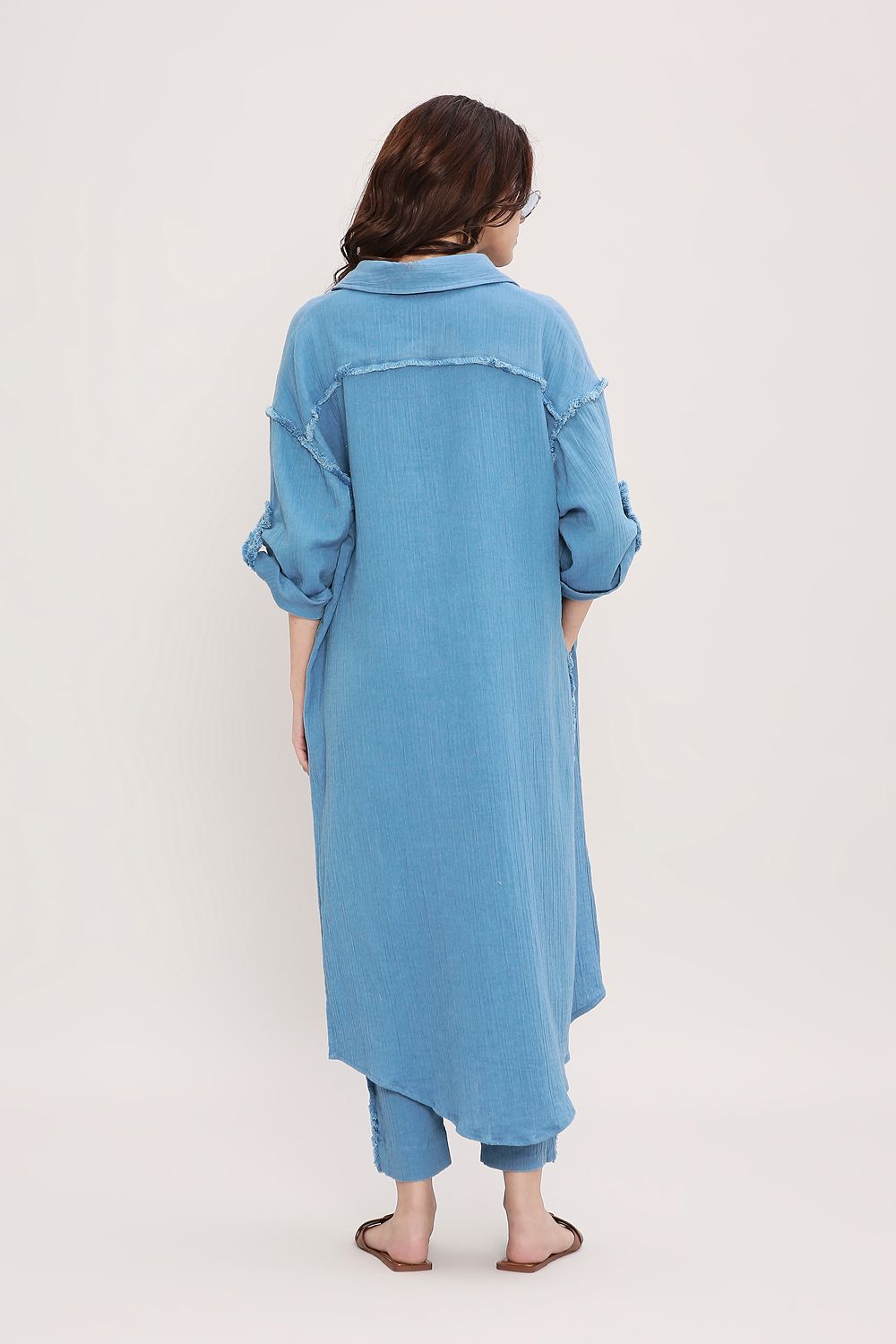 Long shirt in soft crush cotton with front button opening, fringed details and comfort fit. Team it with our tassled elasticated pants to complete the look.