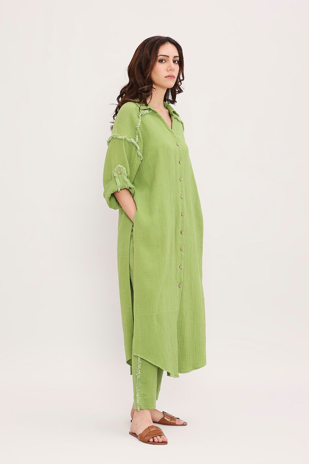 Long shirt in soft crush cotton with front button opening, fringed details and comfort fit. Team it with our tassled elasticated pants to complete the look.
