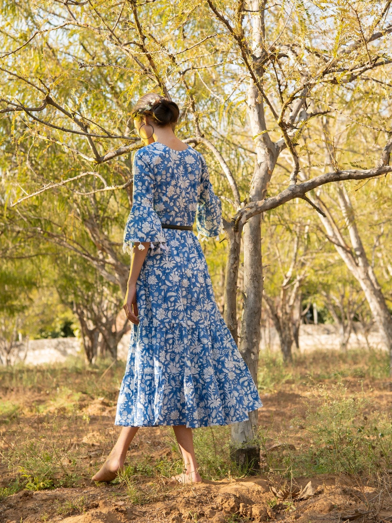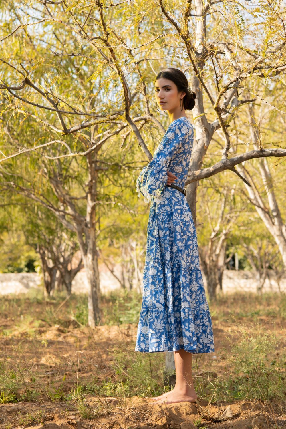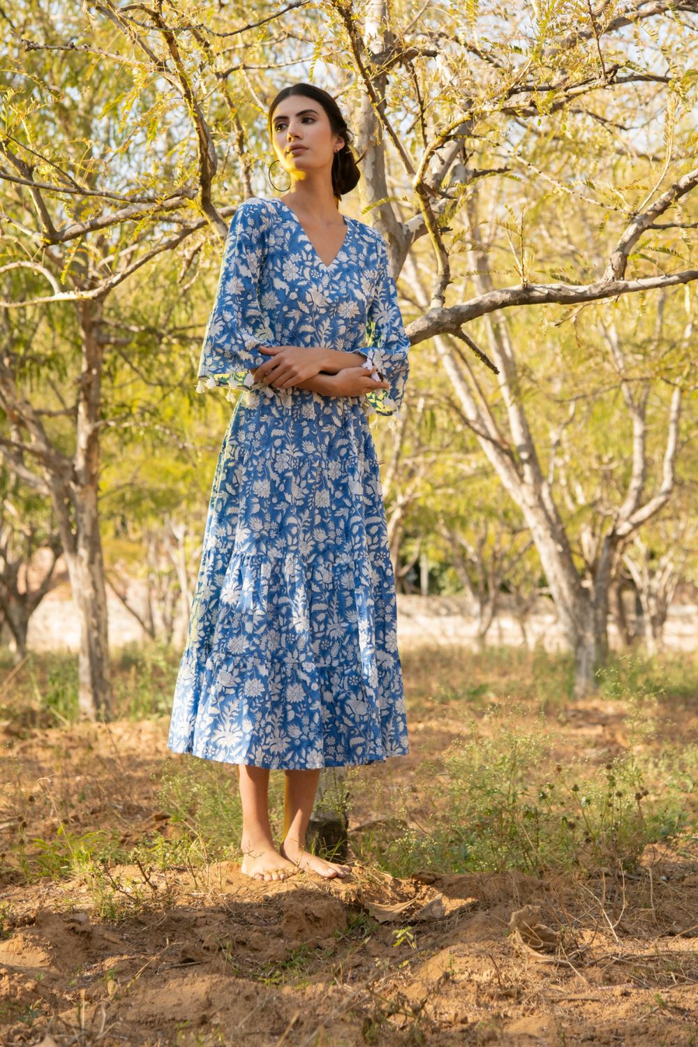 Easy, breezy floral block printed tiered dress. Comes with flared sleeves with lace detailing. Perfect for casual day outs or lounging at home scenes.