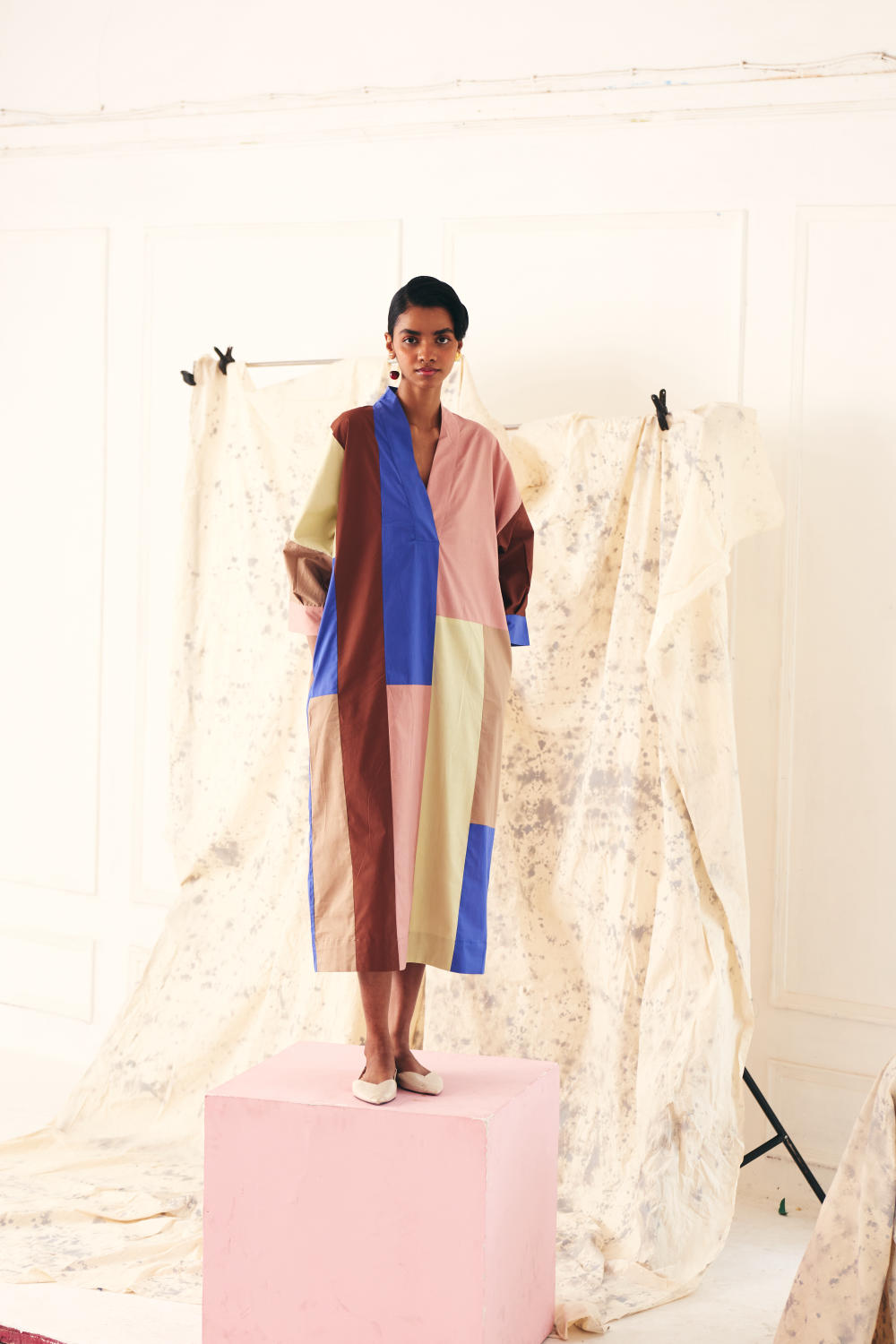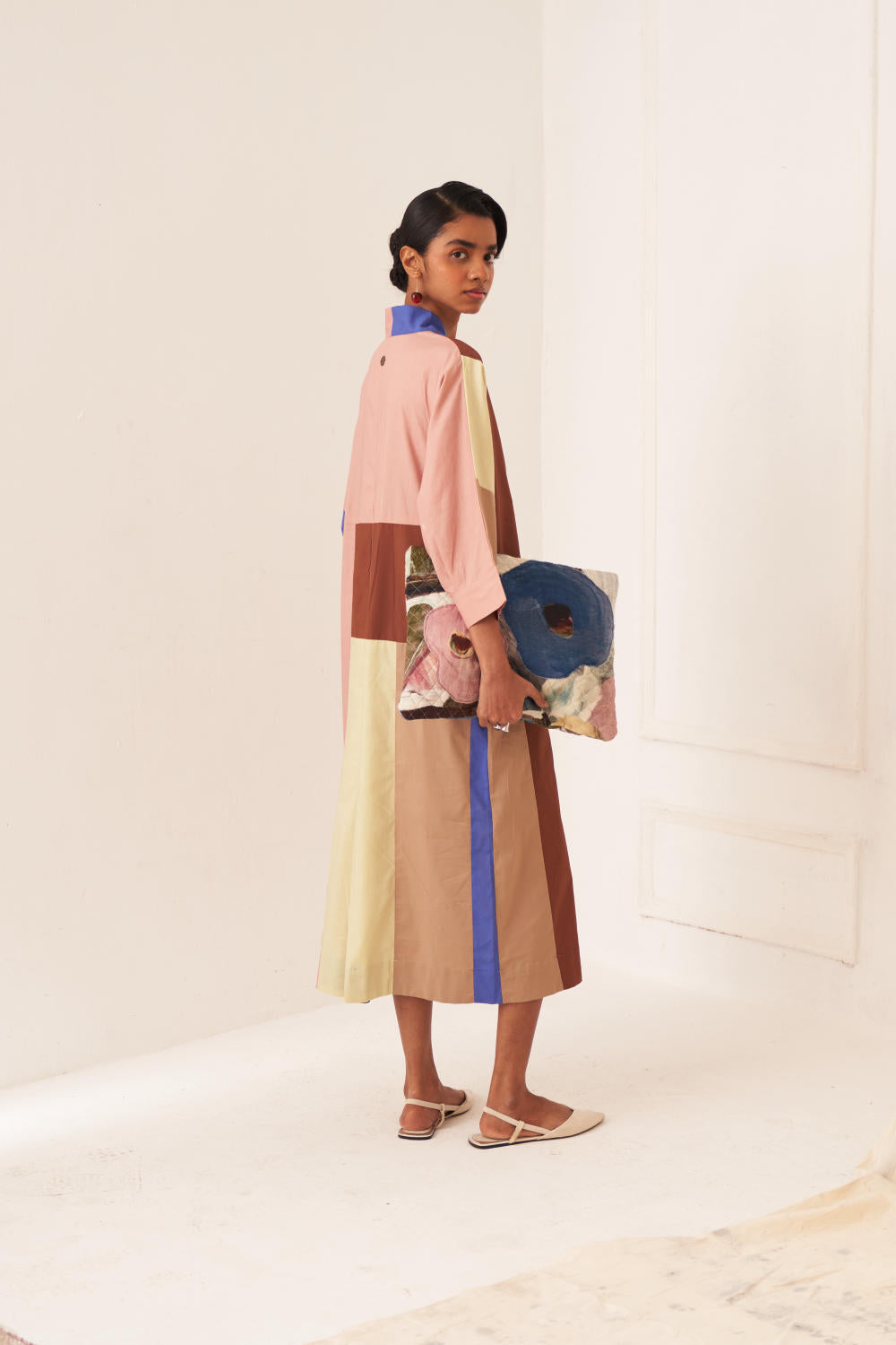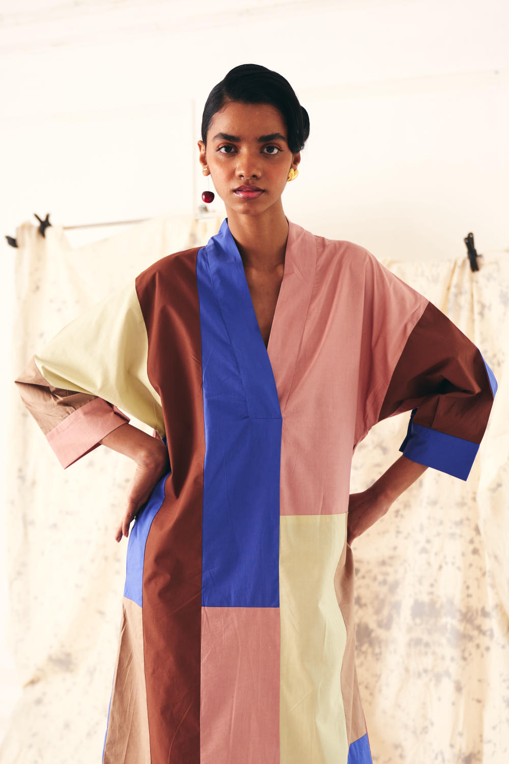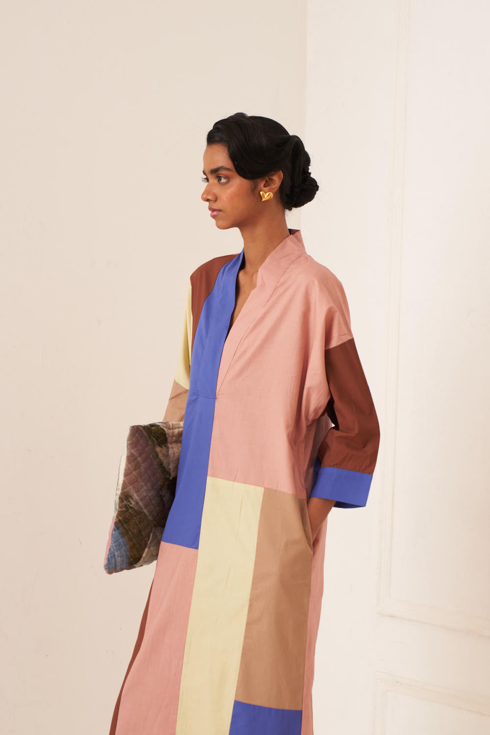 The Patchwork Dress is a stunning colorblocked with a V- neck this dress is both chic and functional. It comes equipped with side seam pockets. Finished with a vintage coin at the back yoke. Model is wearing size M.