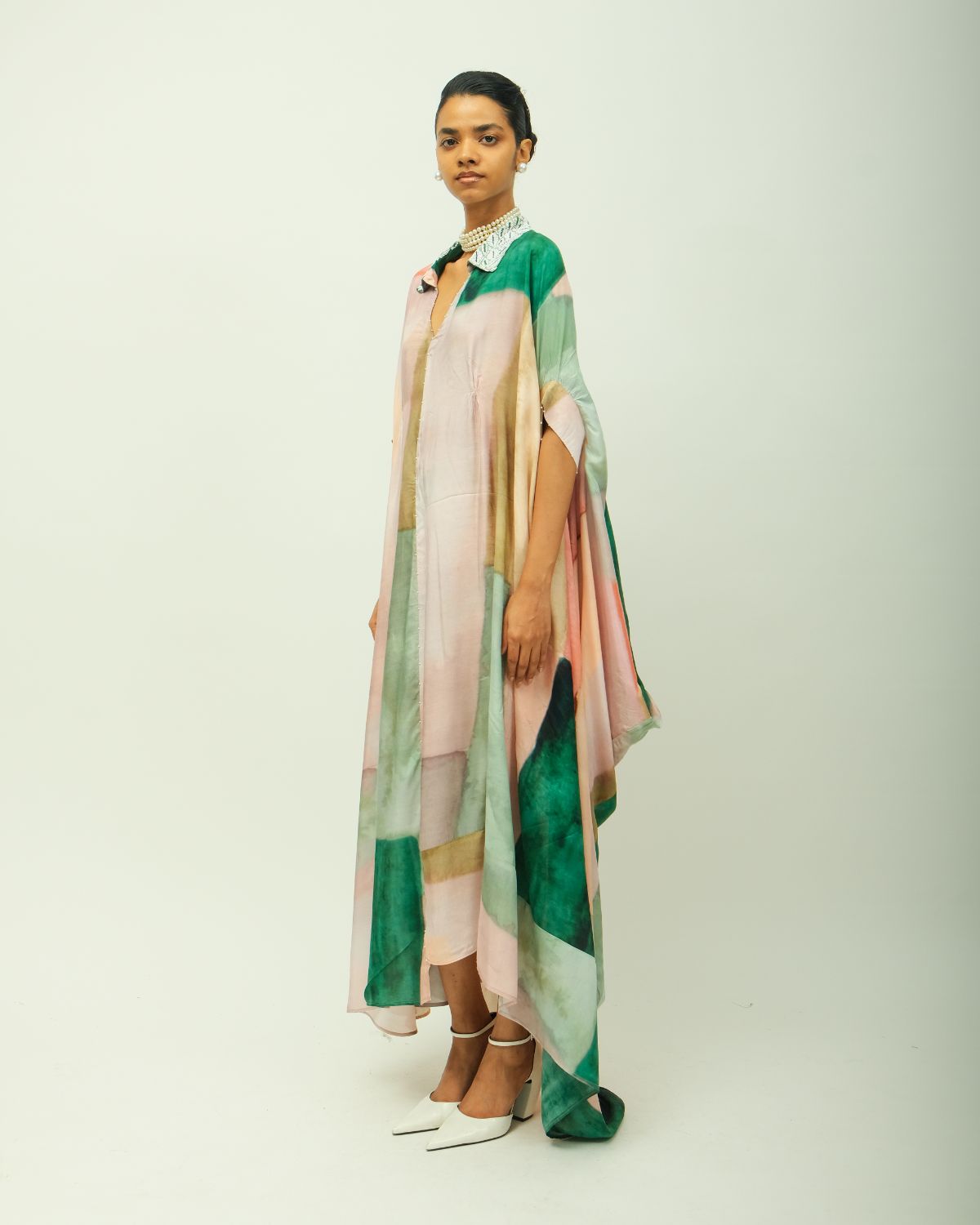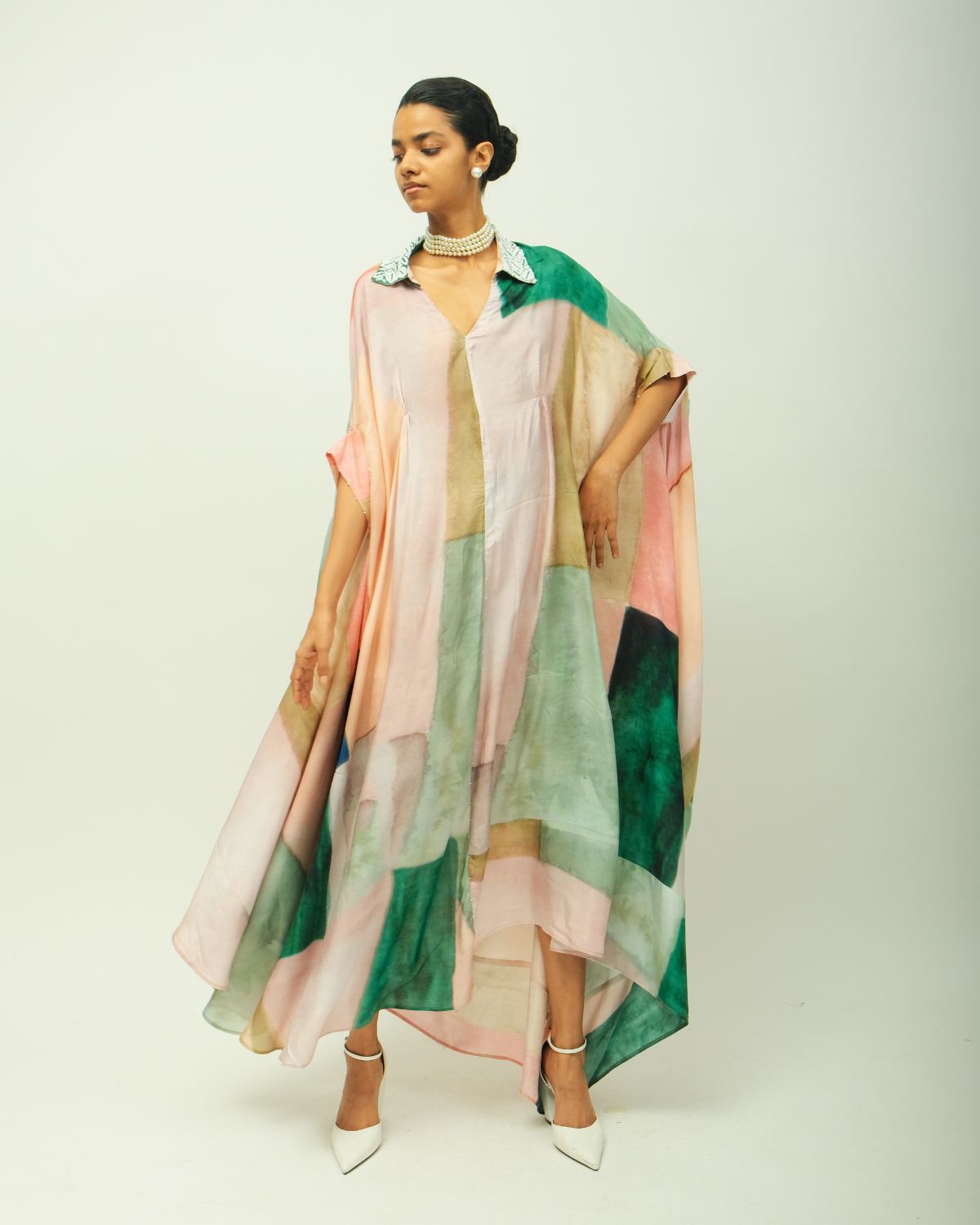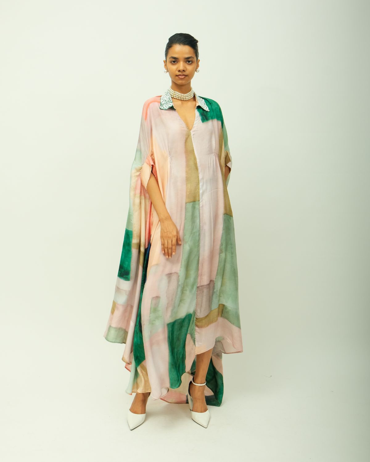 Anti-fit kaftan dress with a collared V neckline adorned with beads and fluid silhouette. Crafted from lightweight fabric, it features a hand-painted, digitally transferred abstract print in soft, earthy tones. Designed with a relaxed fit, and side pockets for ease. Each piece is unique—print placement may vary. Garment Length : front - 50", back - 54"