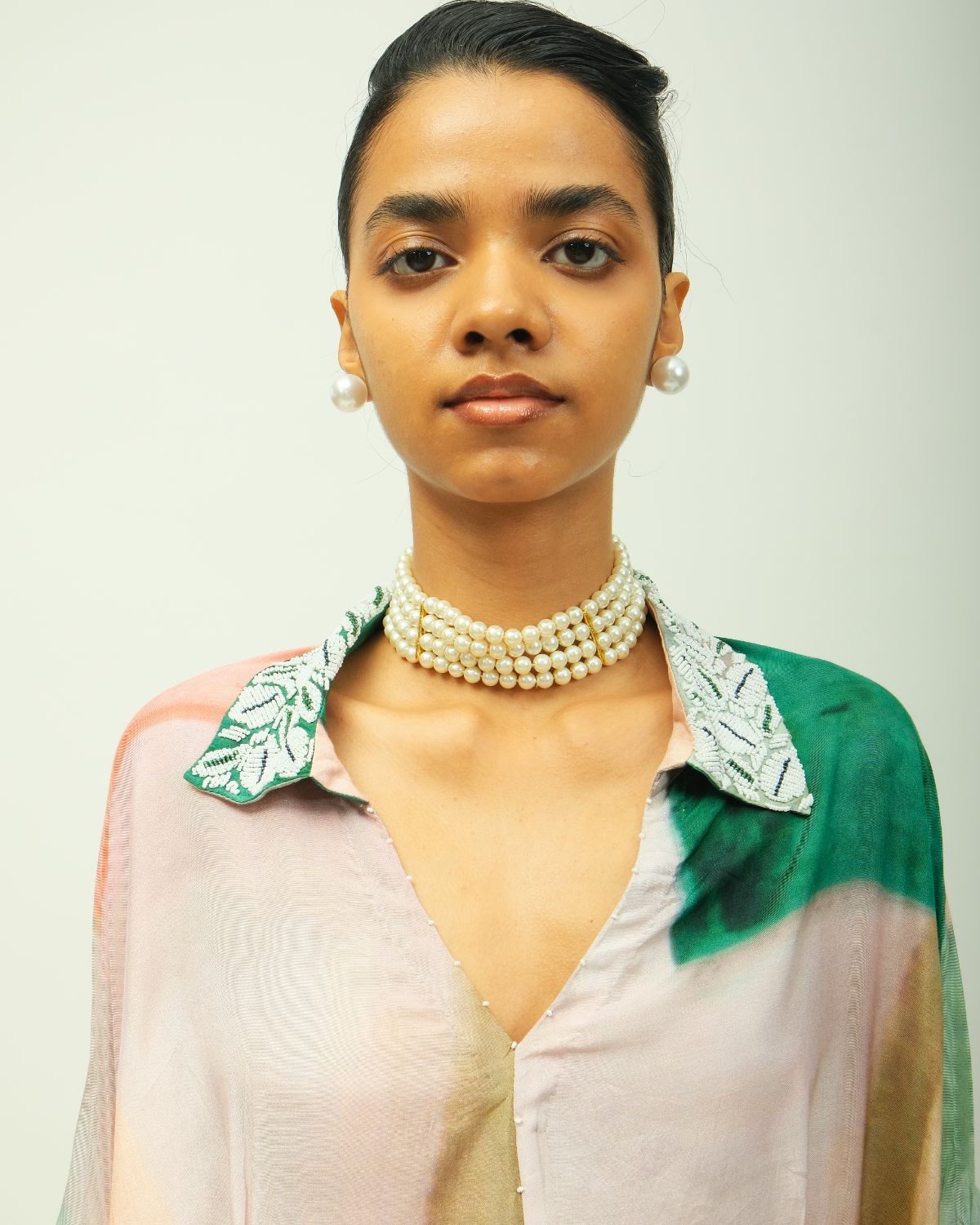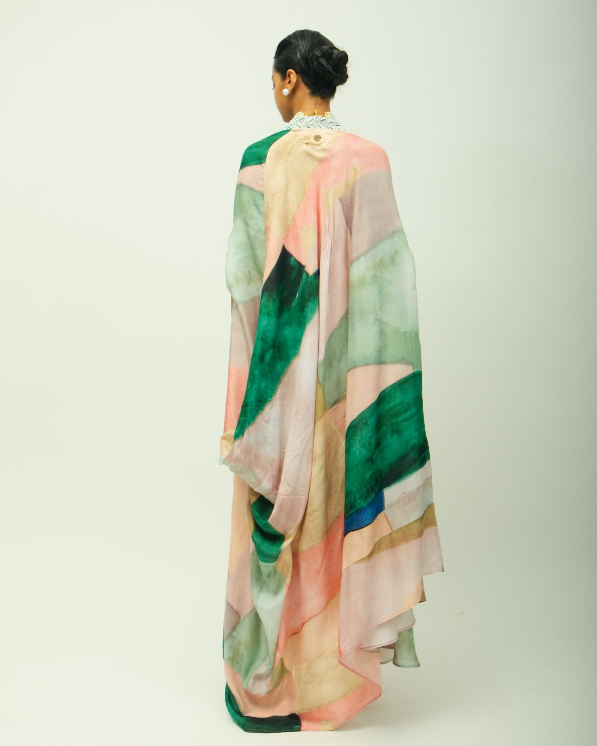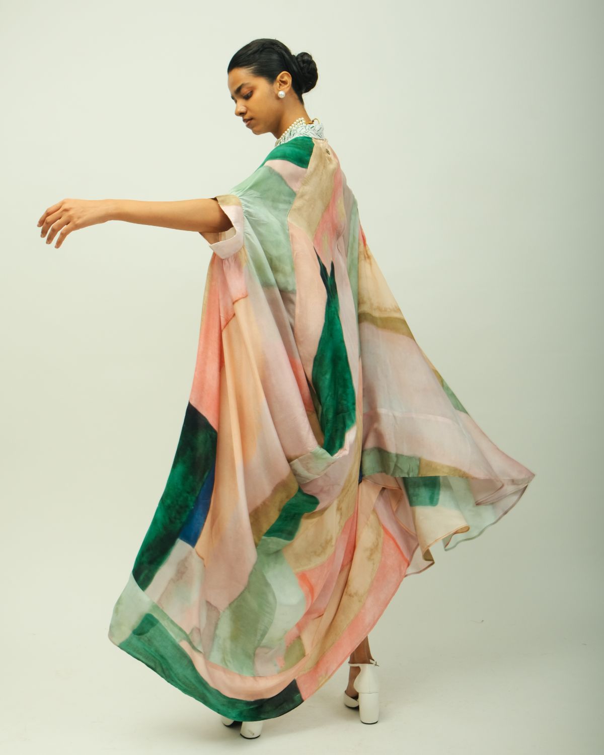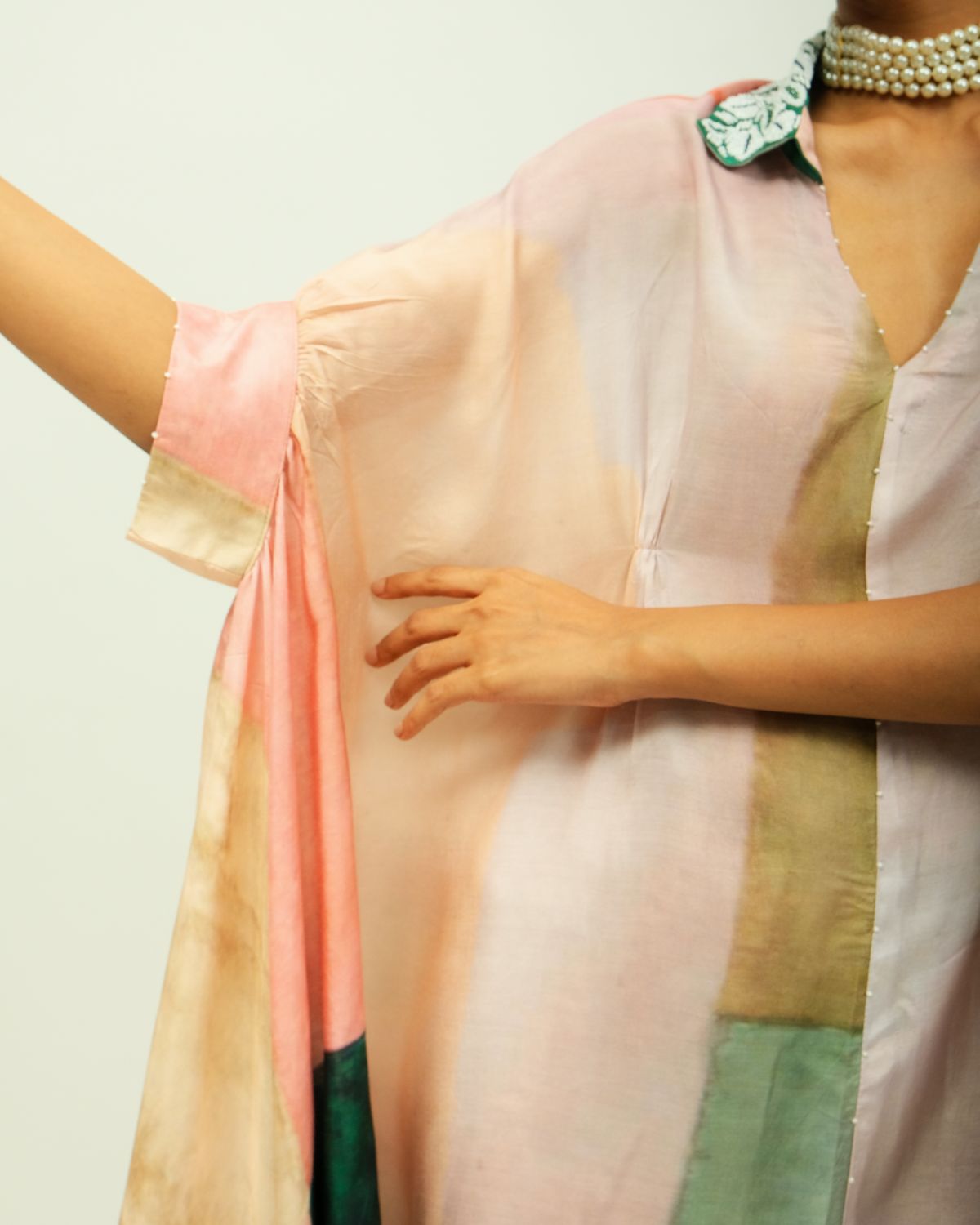 Anti-fit kaftan dress with a collared V neckline adorned with beads and fluid silhouette. Crafted from lightweight fabric, it features a hand-painted, digitally transferred abstract print in soft, earthy tones. Designed with a relaxed fit, and side pockets for ease. Each piece is unique—print placement may vary. Garment Length : front - 50", back - 54"