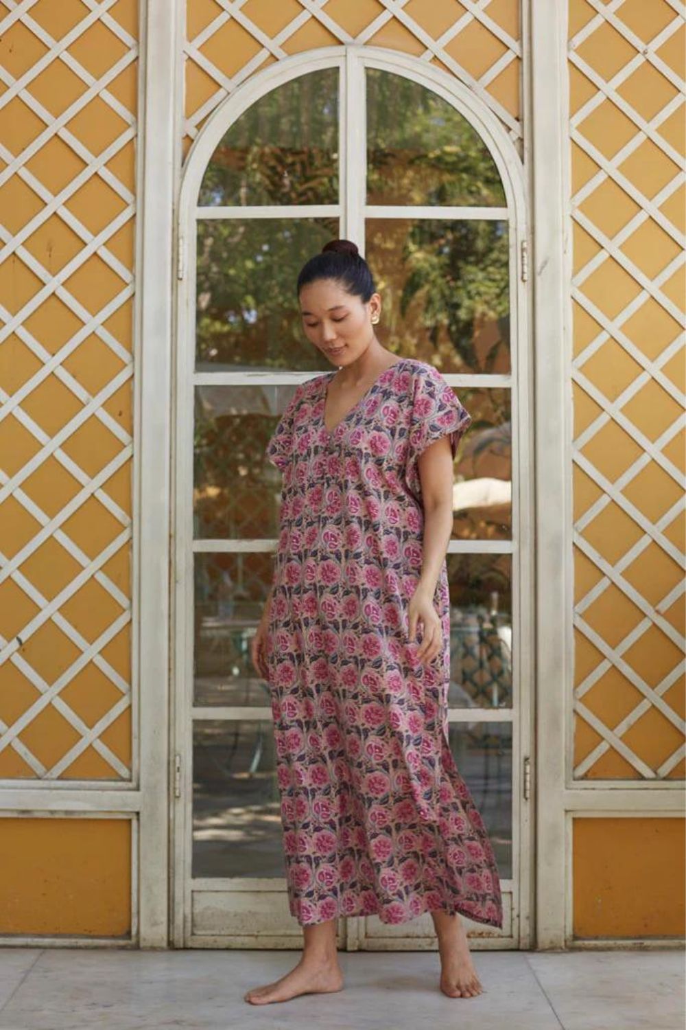 Hand printed kaftaan, in cotton mulmul with front hand made fabric buttons.All our printing is done by our partner artisans in the neighbouring printing village of Sanganer in Jaipur.