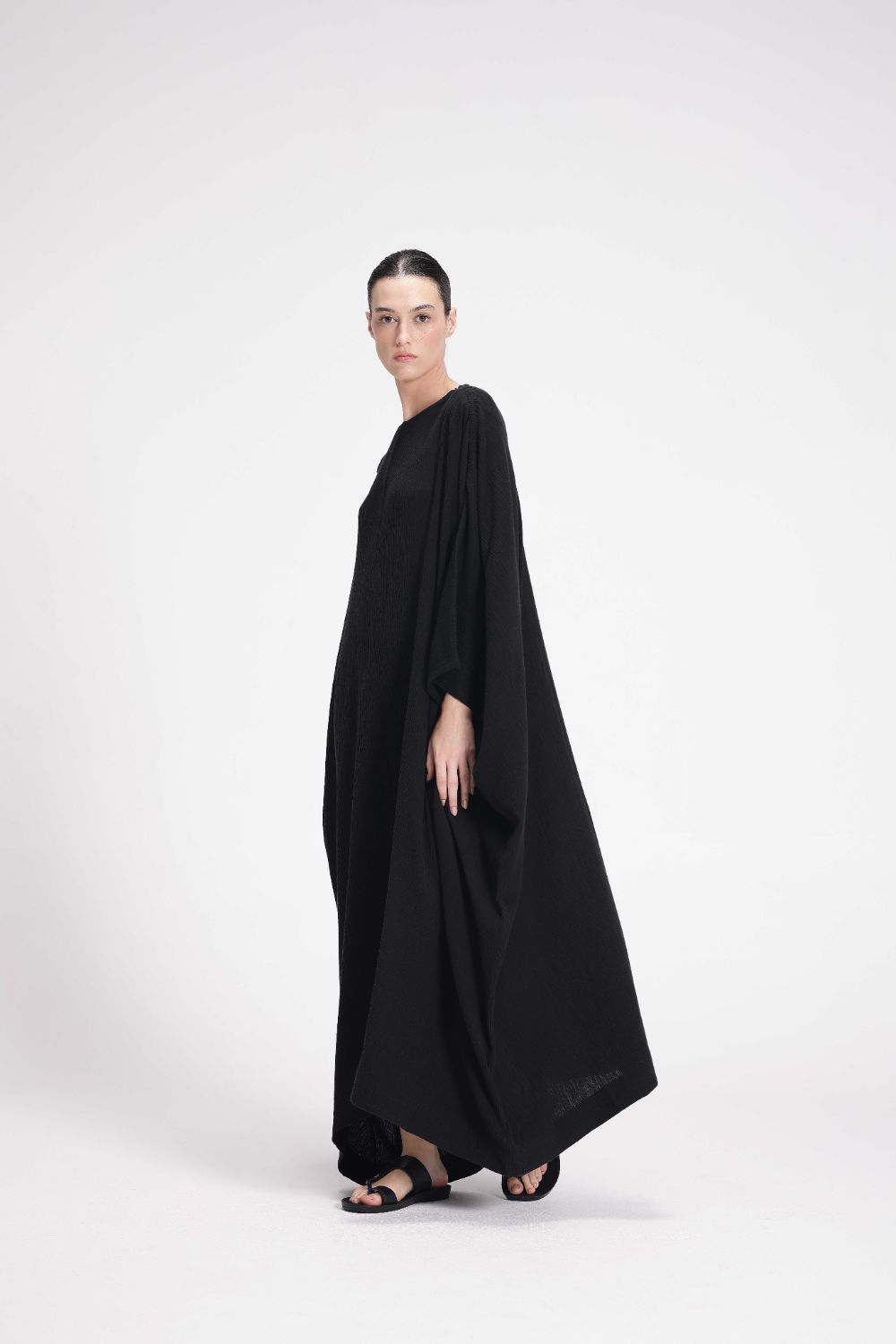 Made from stretchable cotton crepe, this ankle-length kaftan features a round neck and a convenient shoulder zip for easy wear. This versatile piece is designed for a relaxed fit and all-day comfort. Kaftan Comes in Size: ONE (2XS,XS,S)