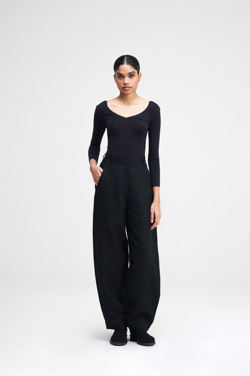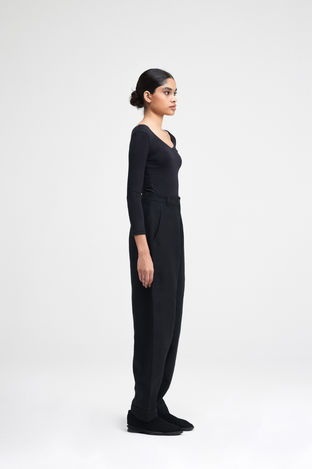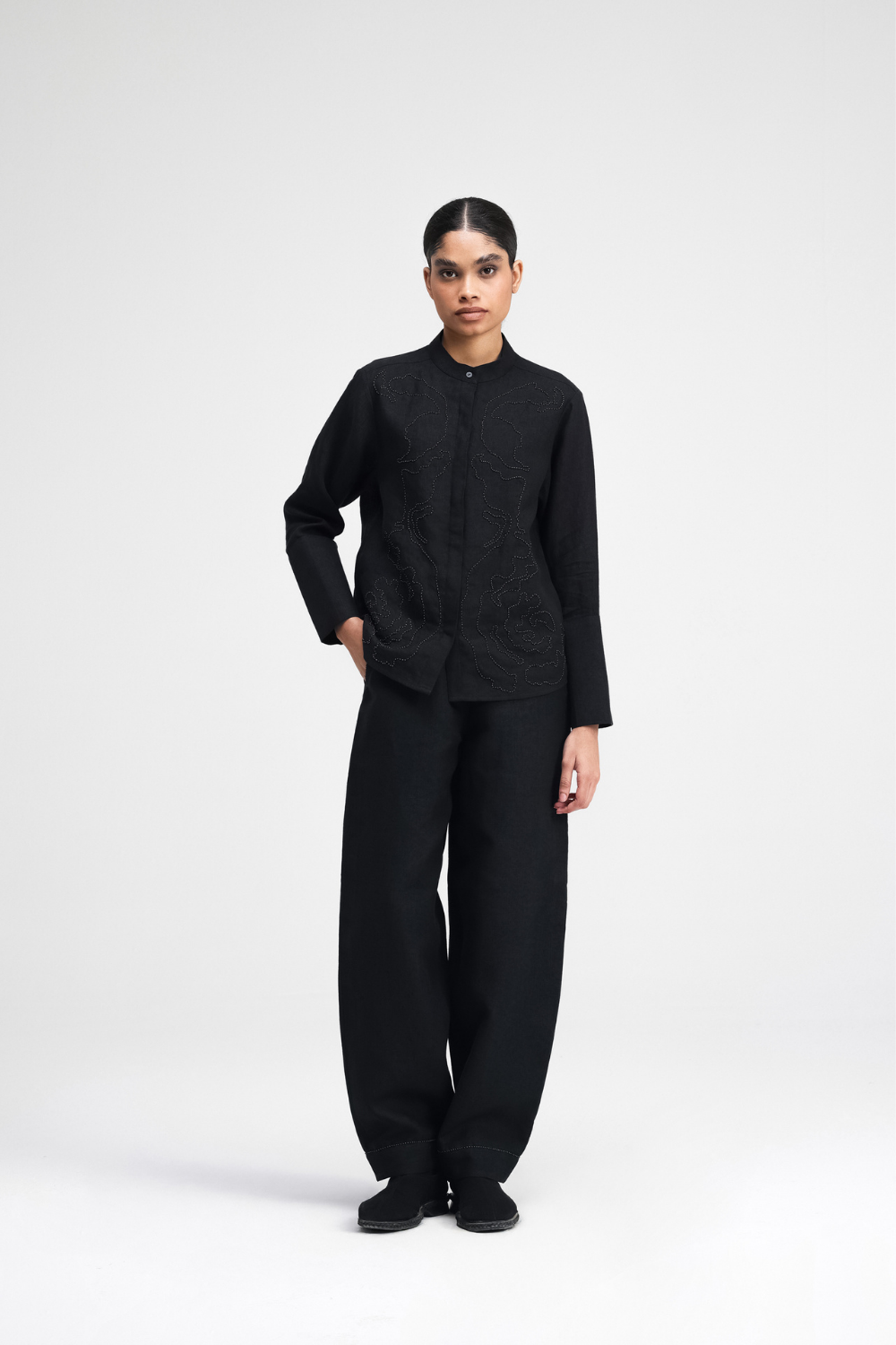 Our Koja pants are a relaxed-fit barrel-leg pants that offer a laid-back silhouette. Featuring back darts for shape and front cross-pockets for practicality, the hand-embellished hem and pockets offer a unique, artisanal touch. The embroidery is made up of French Knots and beads, combining comfort and intricate craftsmanship.
