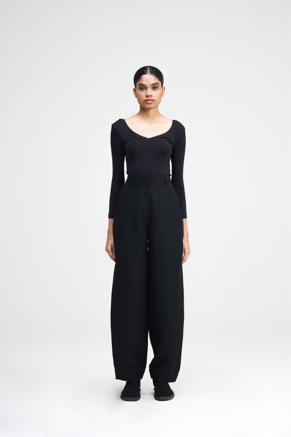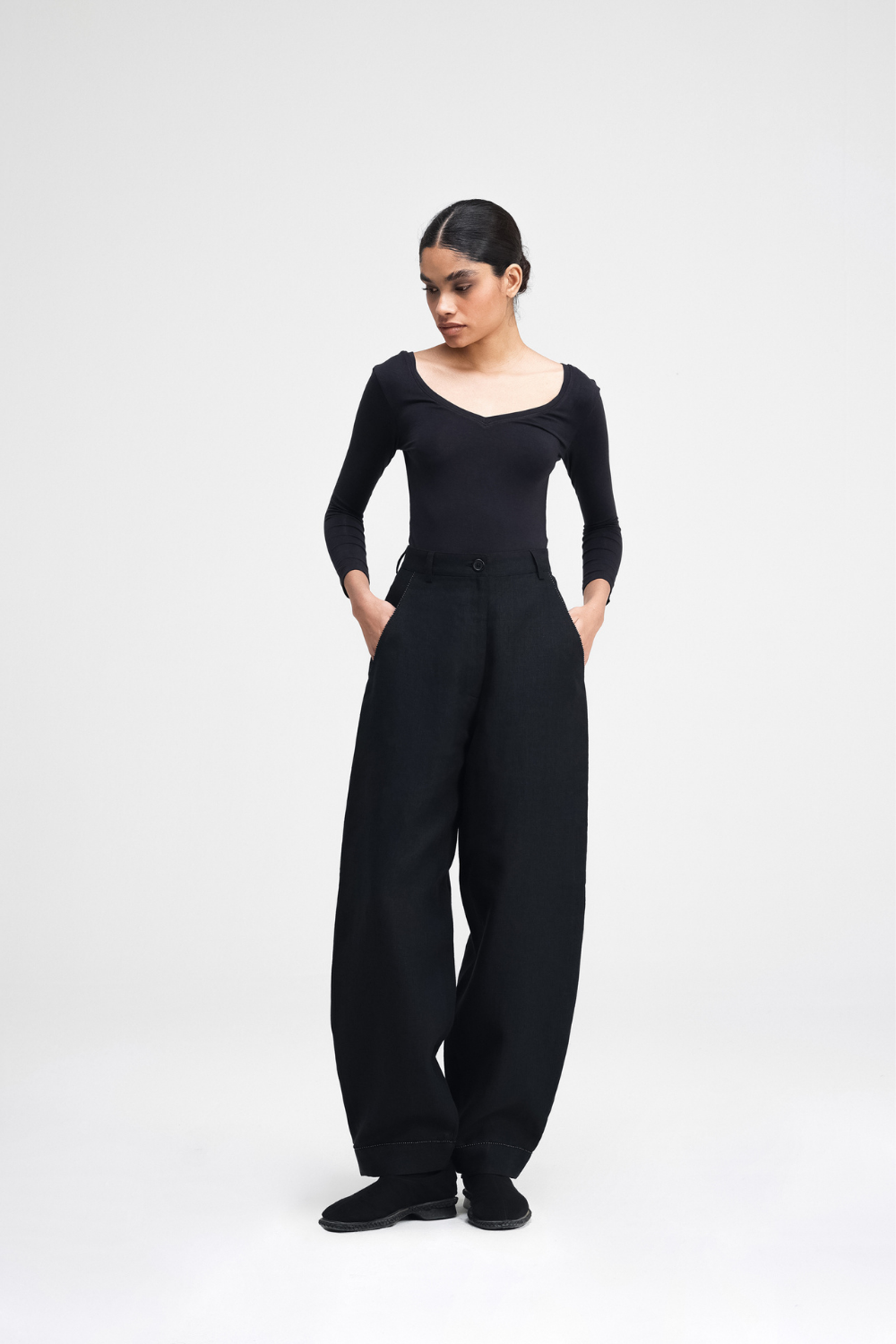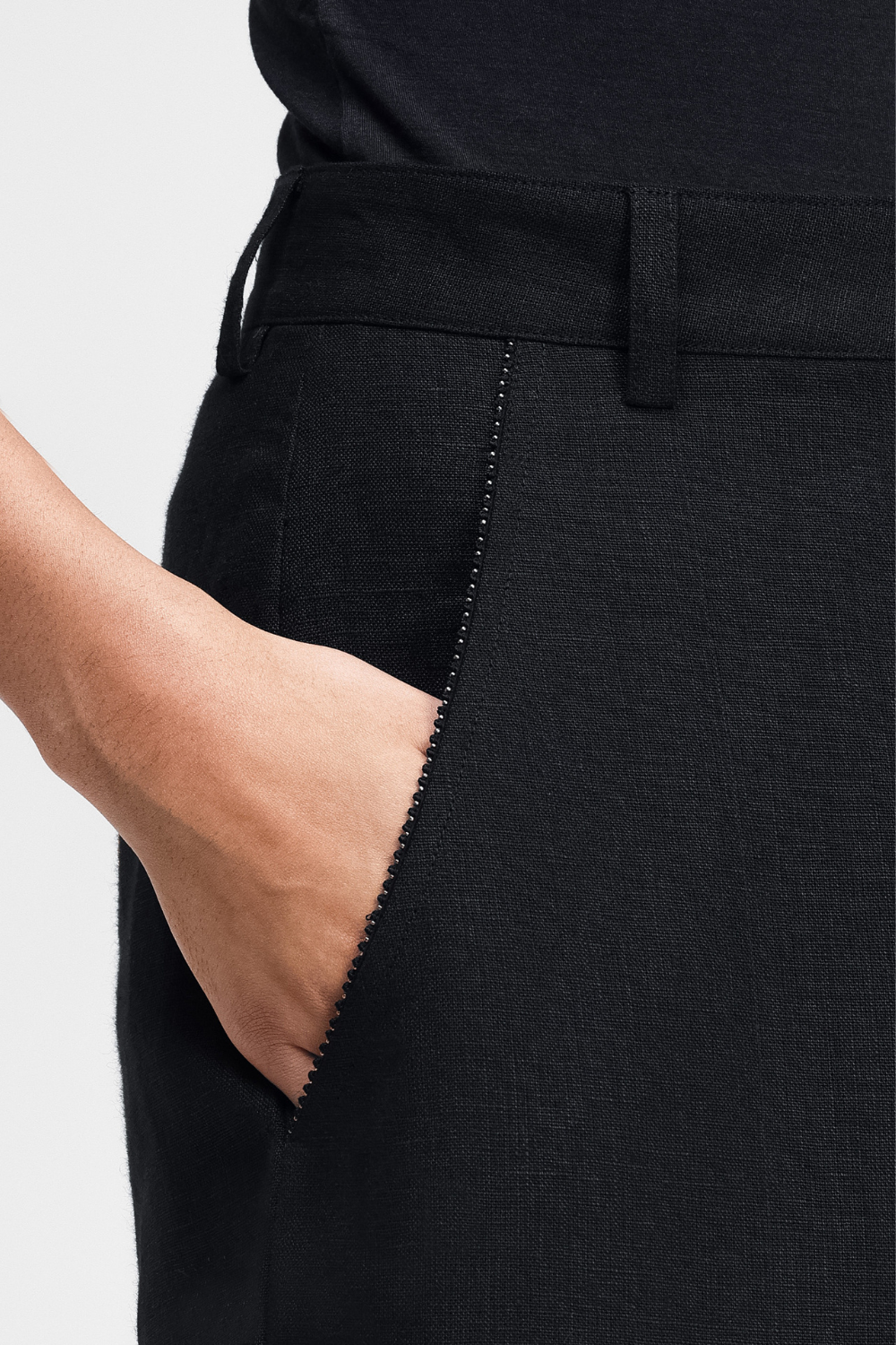 Our Koja pants are a relaxed-fit barrel-leg pants that offer a laid-back silhouette. Featuring back darts for shape and front cross-pockets for practicality, the hand-embellished hem and pockets offer a unique, artisanal touch. The embroidery is made up of French Knots and beads, combining comfort and intricate craftsmanship.