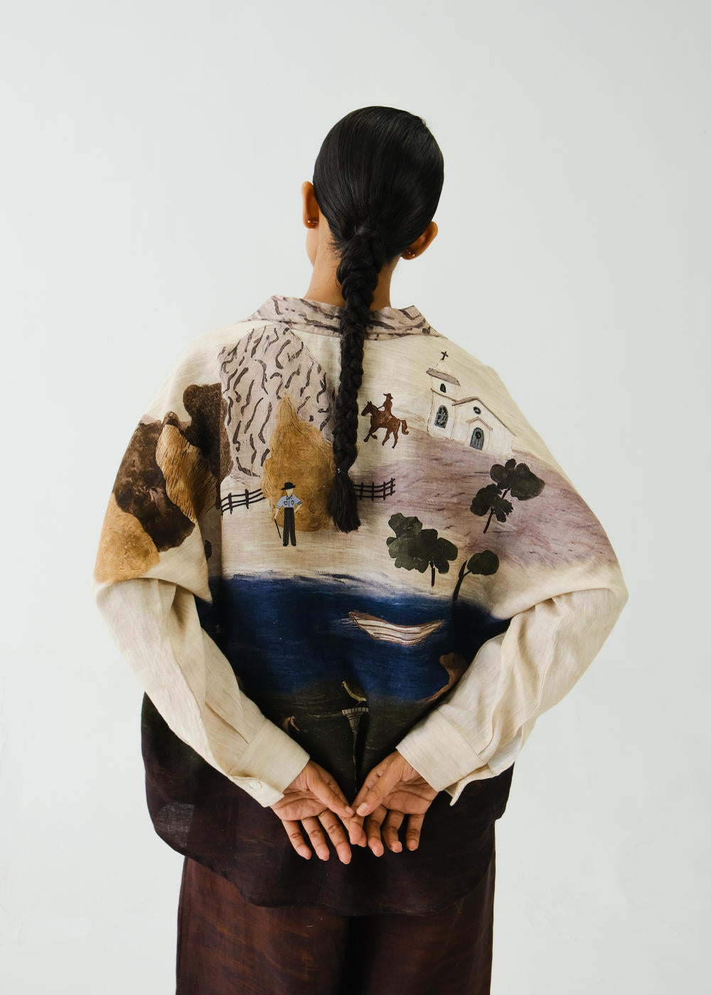 The Lounge shirt is made from 100% handwoven linen fabric in a Village print. It is a button-down shirt and has notched collar detailing. Fabric : Linen