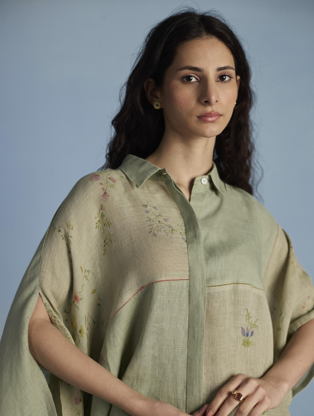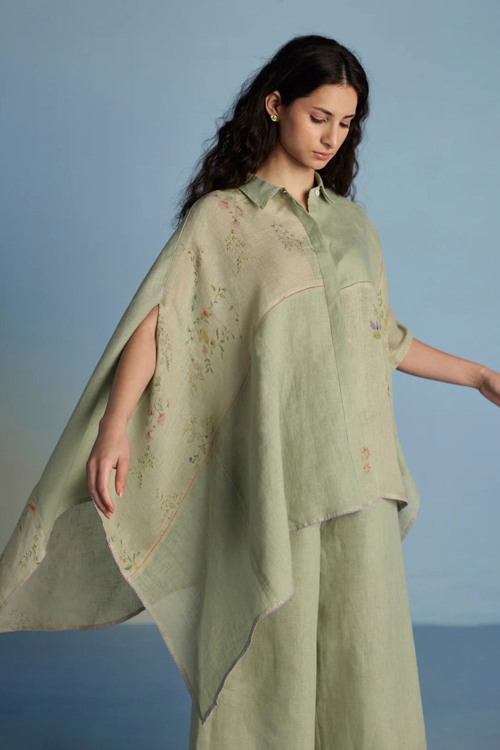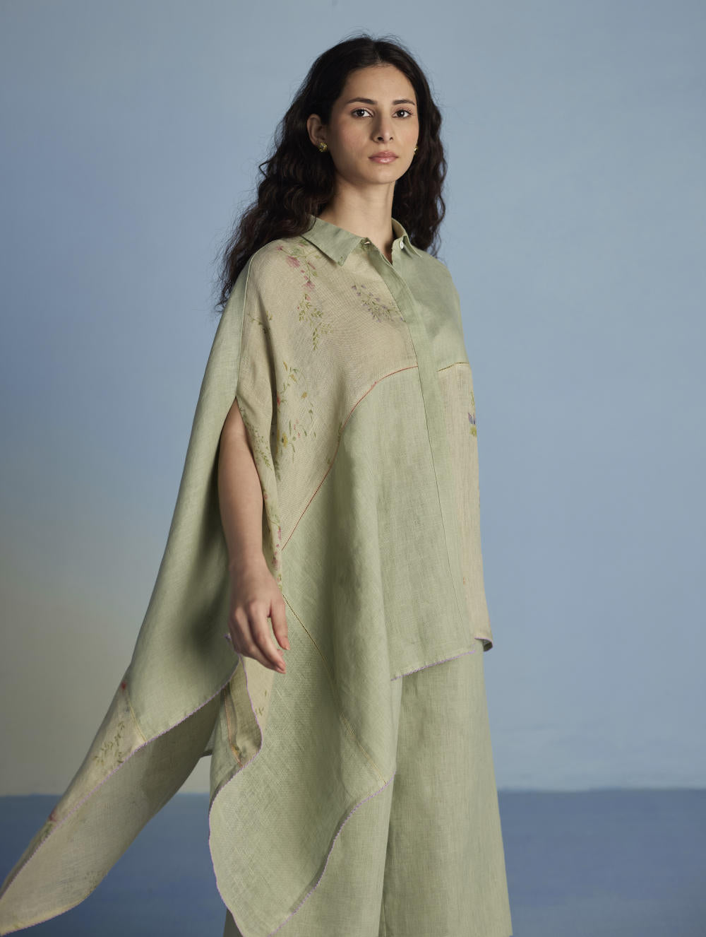 A contemporary take on a kaftan shirt crafted by patching soft yarn-dyed linen and printed sheer linen; featuring hand-illustrated delicate floral prints on the sheer panels and joined with vibrant, multi-colored intricate fagotting thread details. The statement oversized shirt pairs beautifully and easily with our linen pants. It is finished with pop-coloured intricate picoting detail at the hem.
