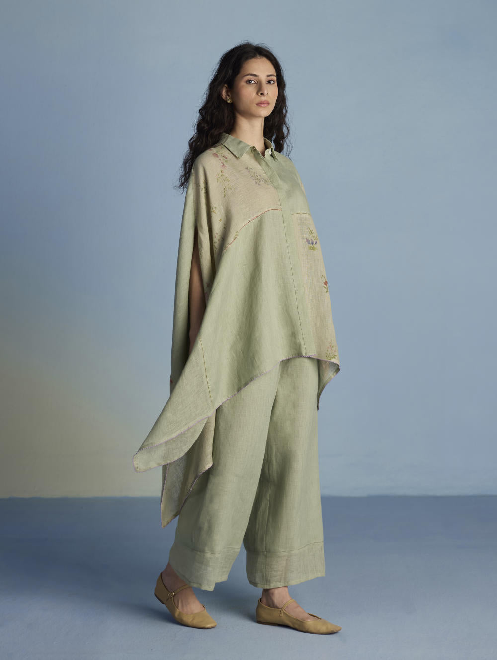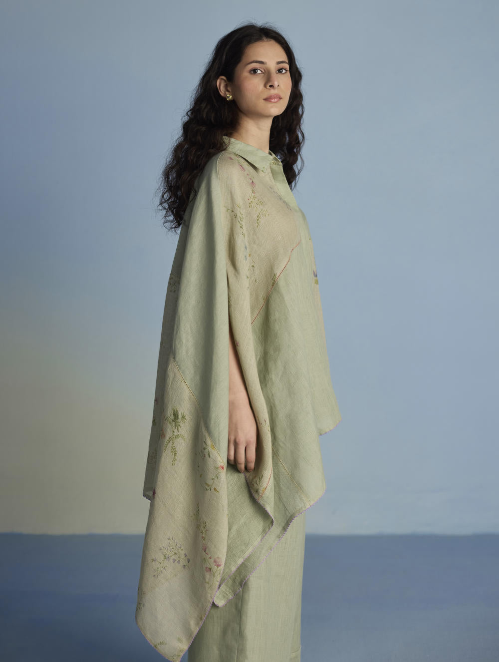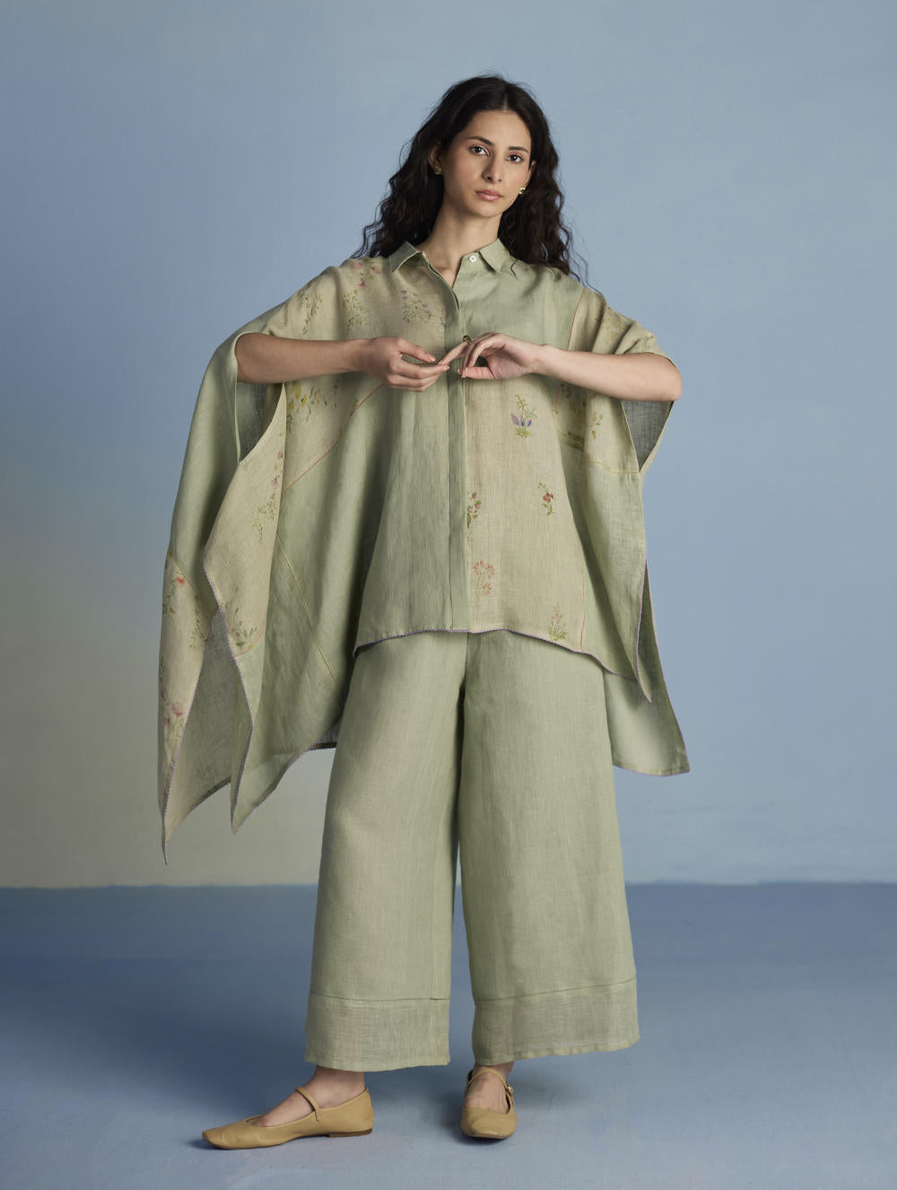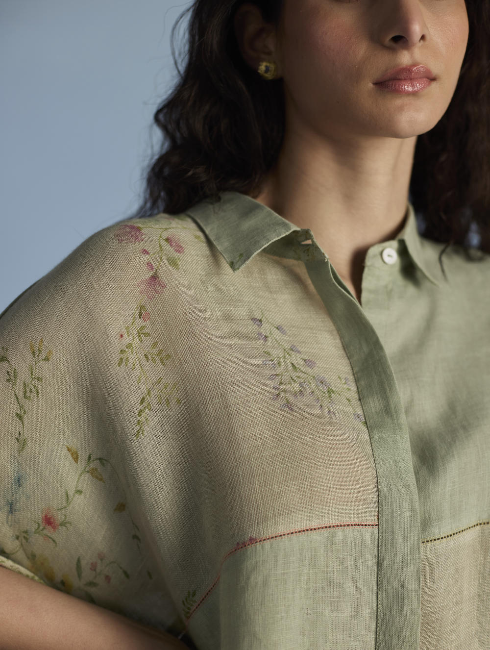 A contemporary take on a kaftan shirt crafted by patching soft yarn-dyed linen and printed sheer linen; featuring hand-illustrated delicate floral prints on the sheer panels and joined with vibrant, multi-colored intricate fagotting thread details. The statement oversized shirt pairs beautifully and easily with our linen pants. It is finished with pop-coloured intricate picoting detail at the hem.