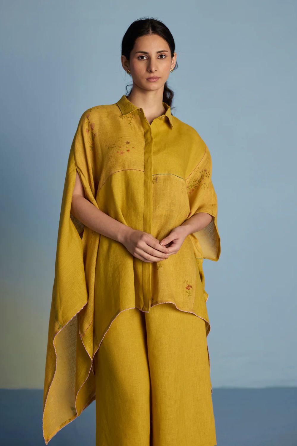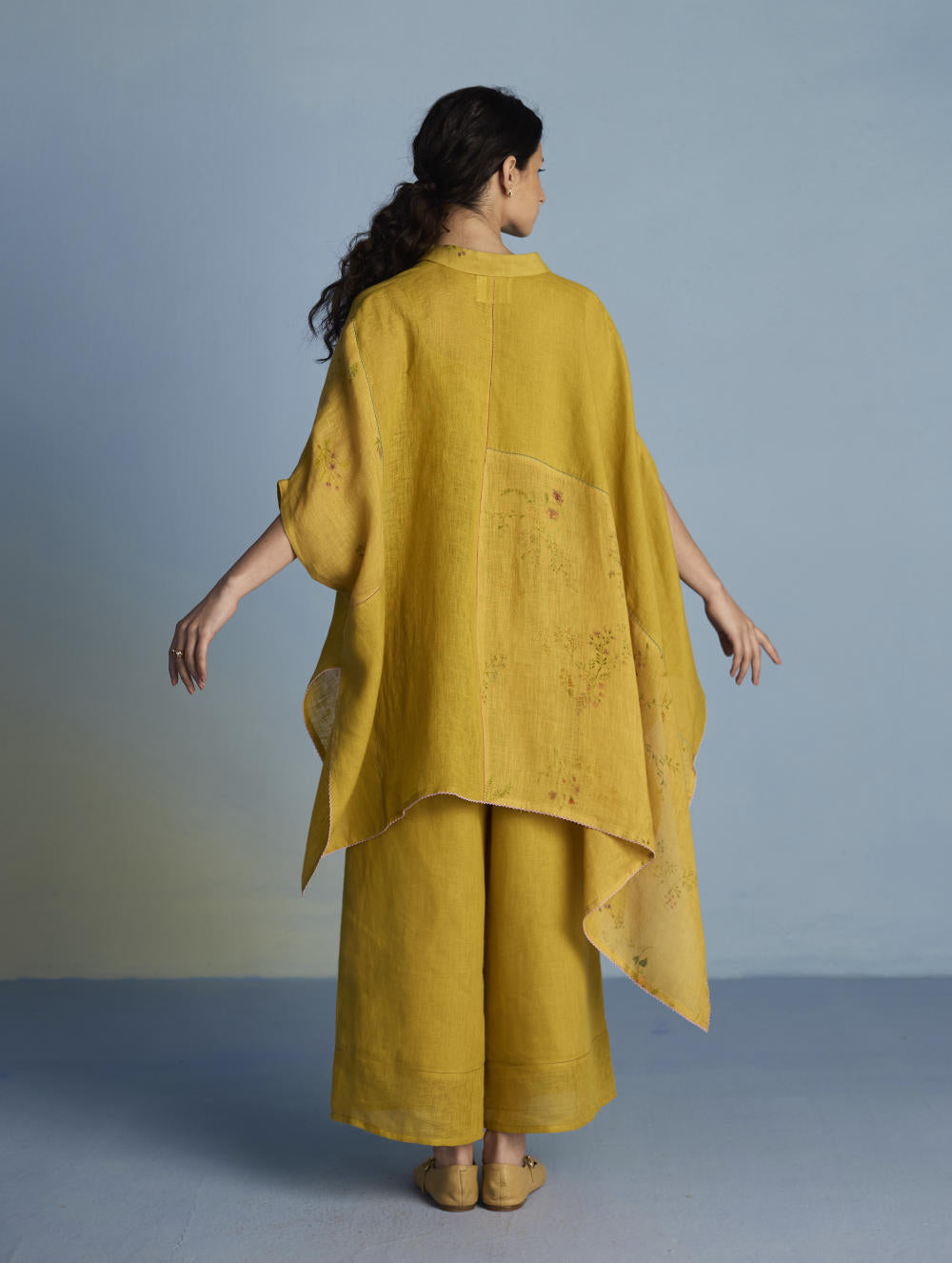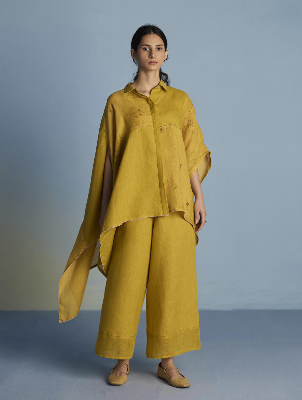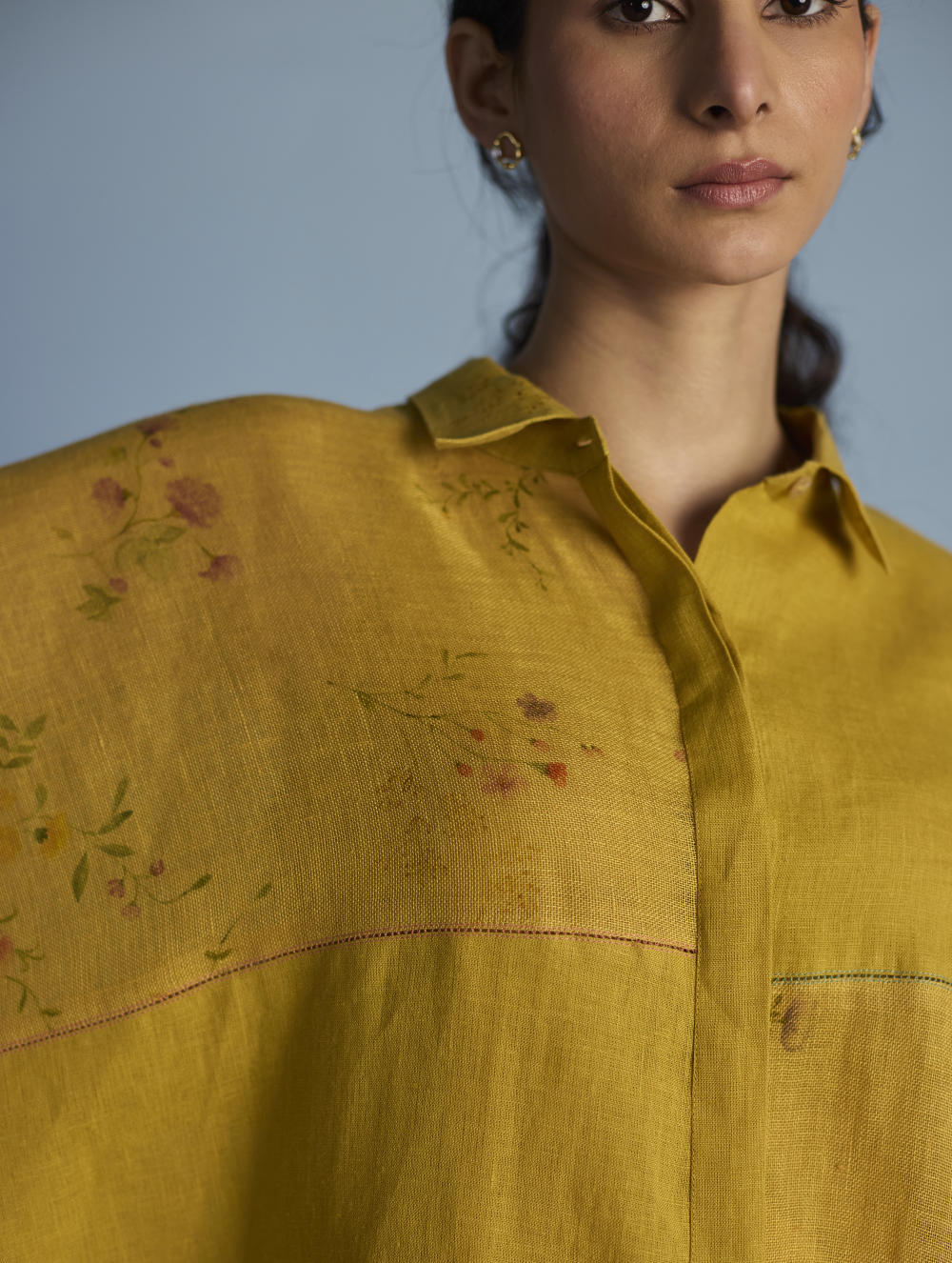 A contemporary take on a kaftan shirt crafted by patching soft yarn-dyed linen and printed sheer linen; featuring hand-illustrated delicate floral prints on the sheer panels and joined with vibrant, multi-colored intricate fagotting thread details. The statement oversized shirt pairs beautifully and easily with our linen pants. It is finished with pop-coloured intricate picoting detail at the hem.