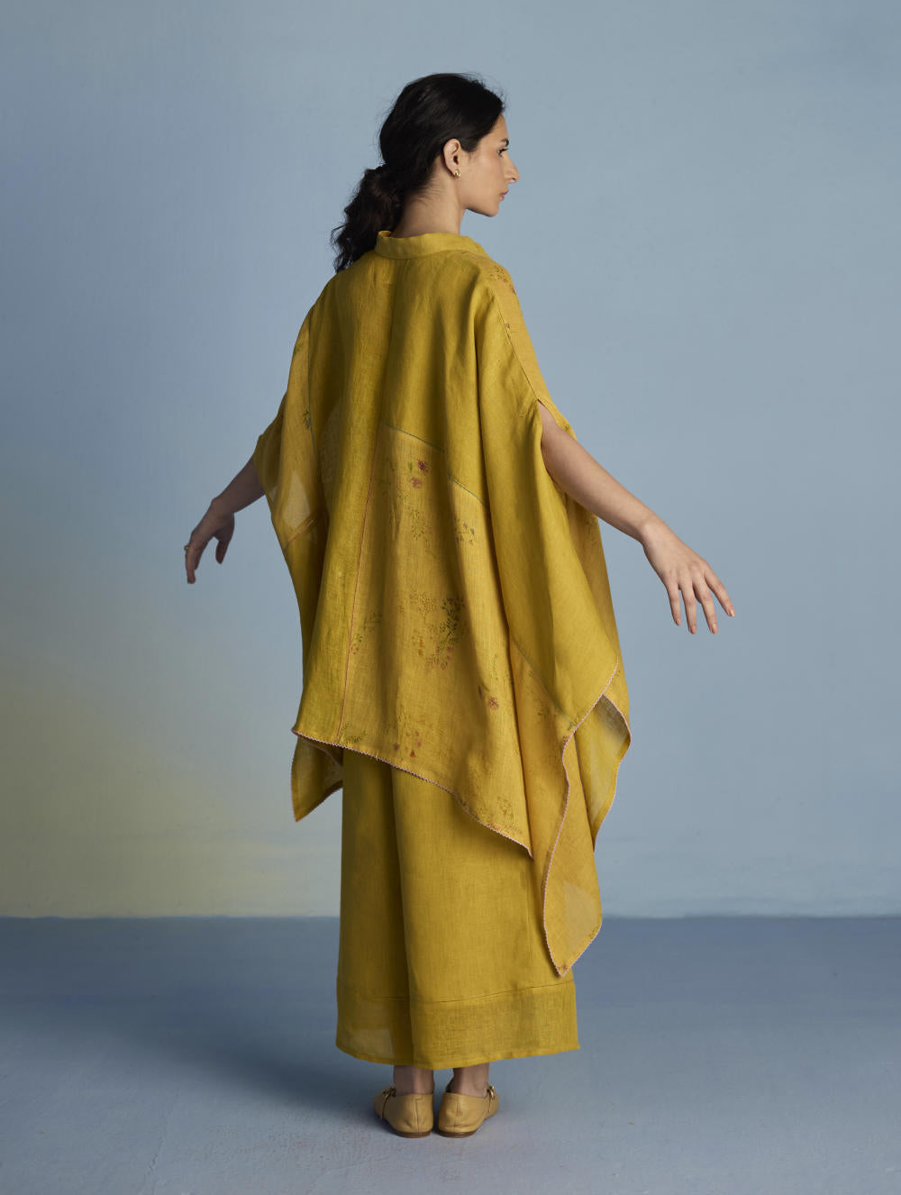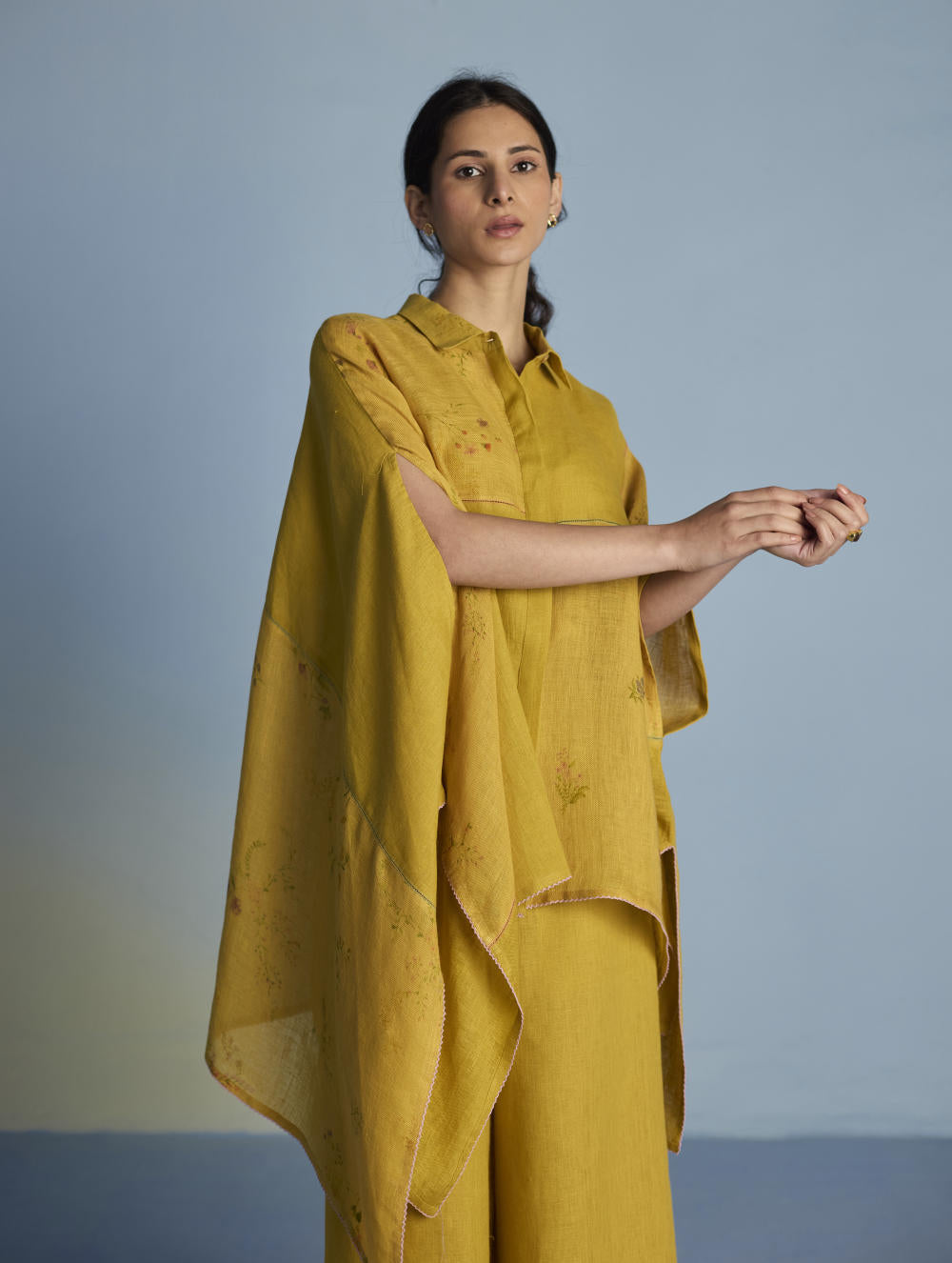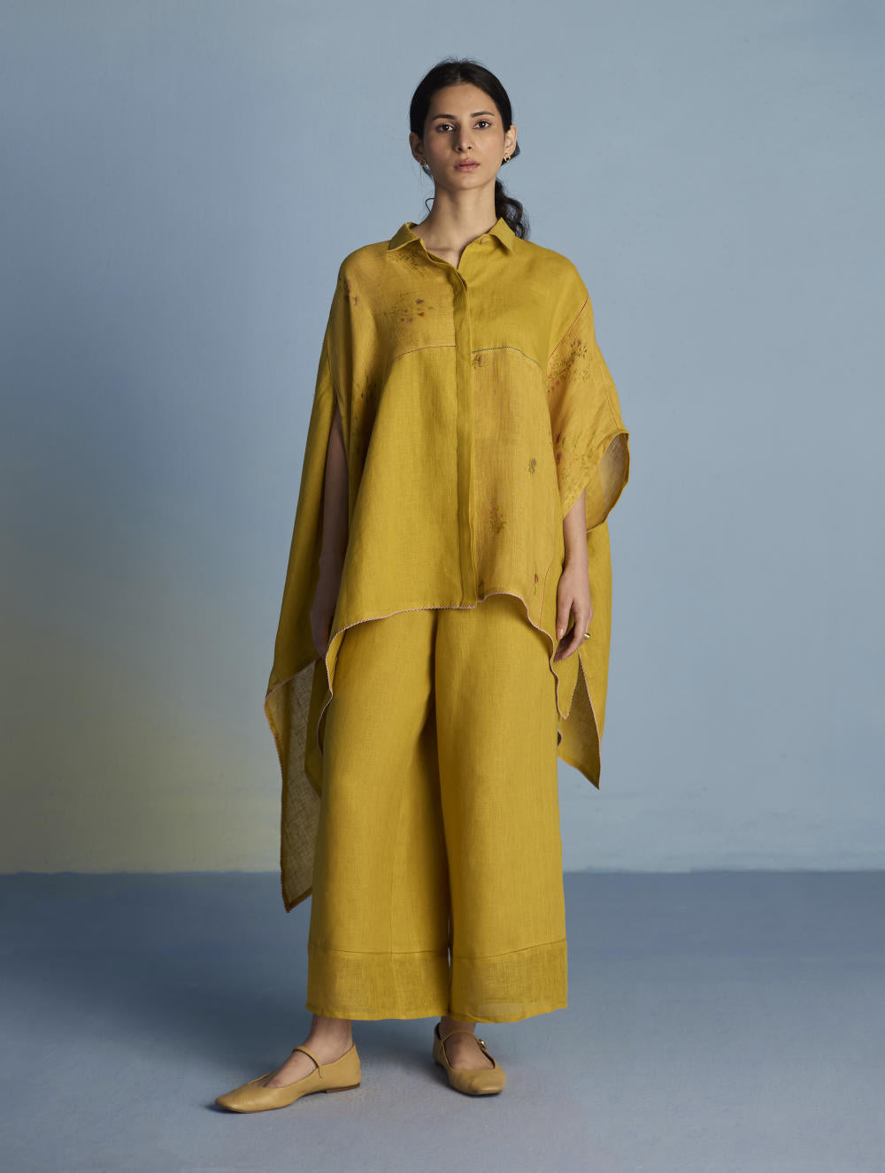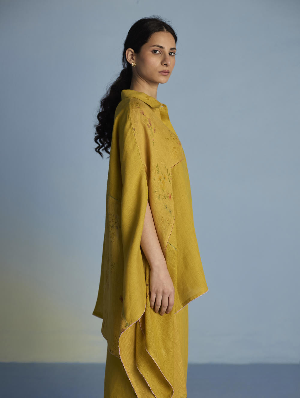 A contemporary take on a kaftan shirt crafted by patching soft yarn-dyed linen and printed sheer linen; featuring hand-illustrated delicate floral prints on the sheer panels and joined with vibrant, multi-colored intricate fagotting thread details. The statement oversized shirt pairs beautifully and easily with our linen pants. It is finished with pop-coloured intricate picoting detail at the hem.