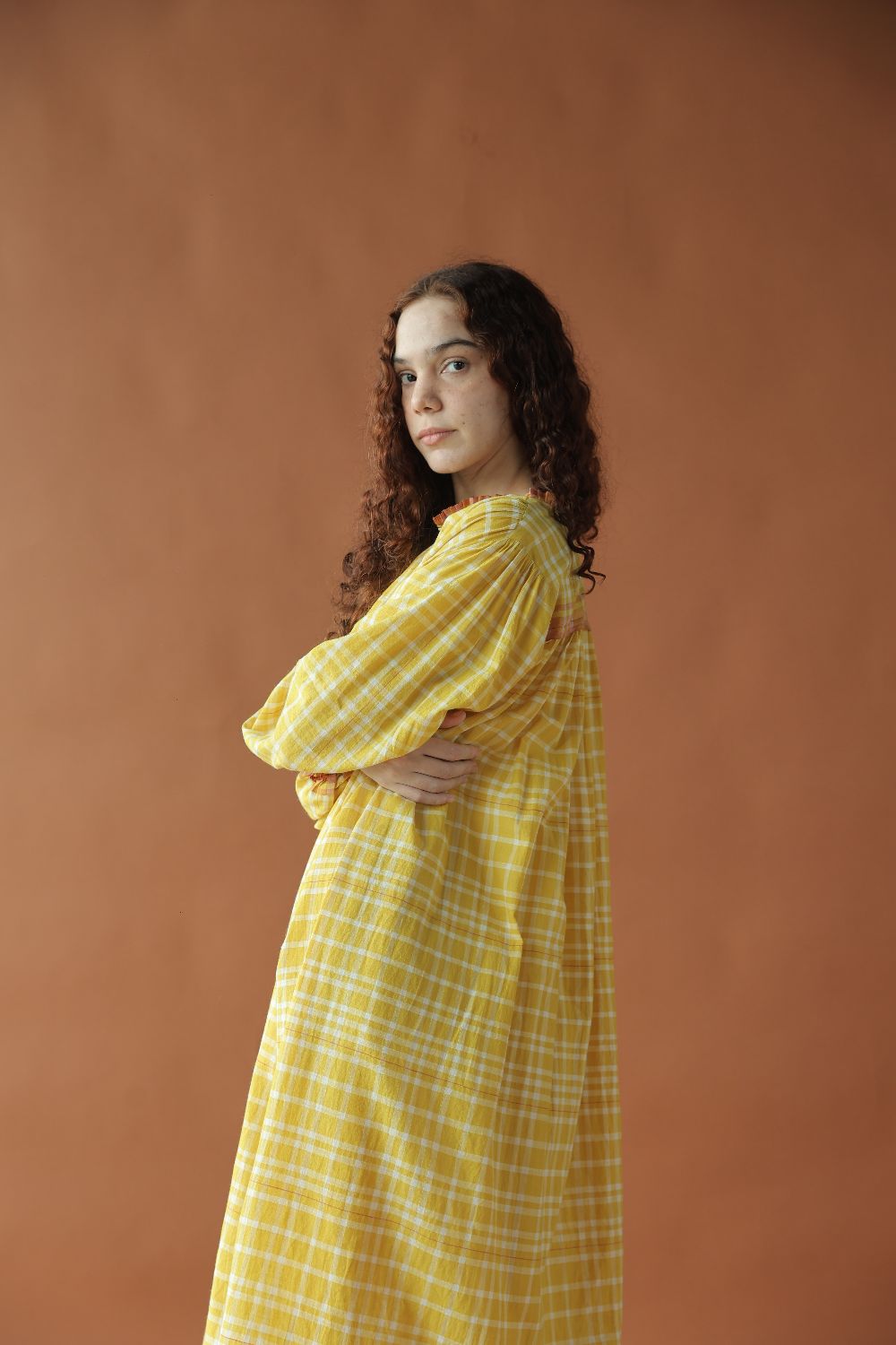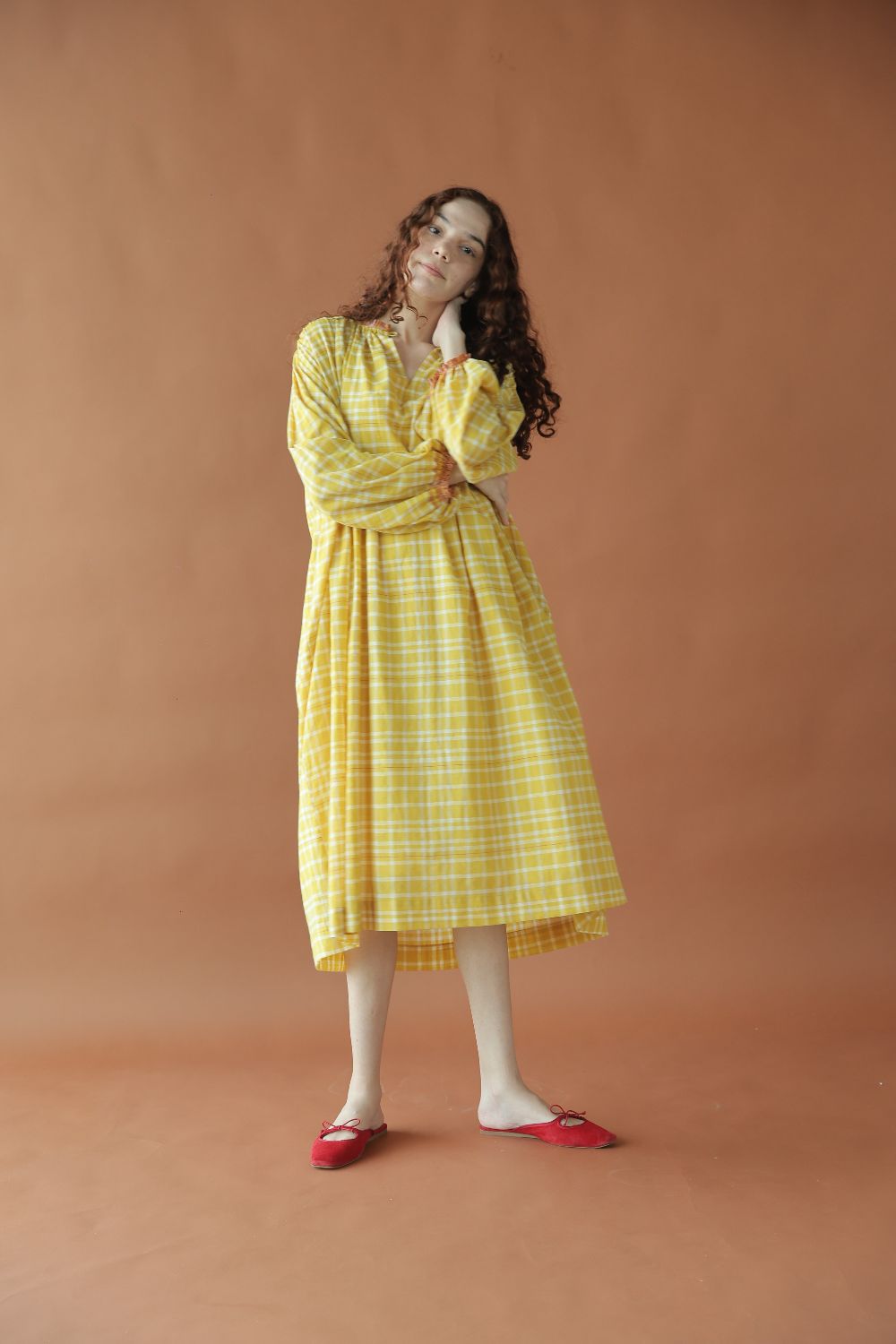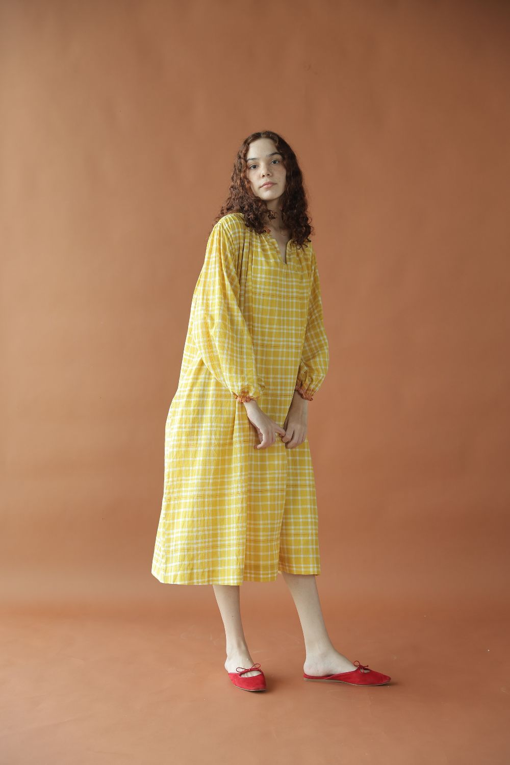Cut in the softest handwoven cotton, 'Sierra' is a dress in vibrant yellow checks with a small ruffled collar, long sleeves that gather around the cuff to form a tiny frill. 'Sierra' can be worn as is, or cinched with the belt provided with the dress.