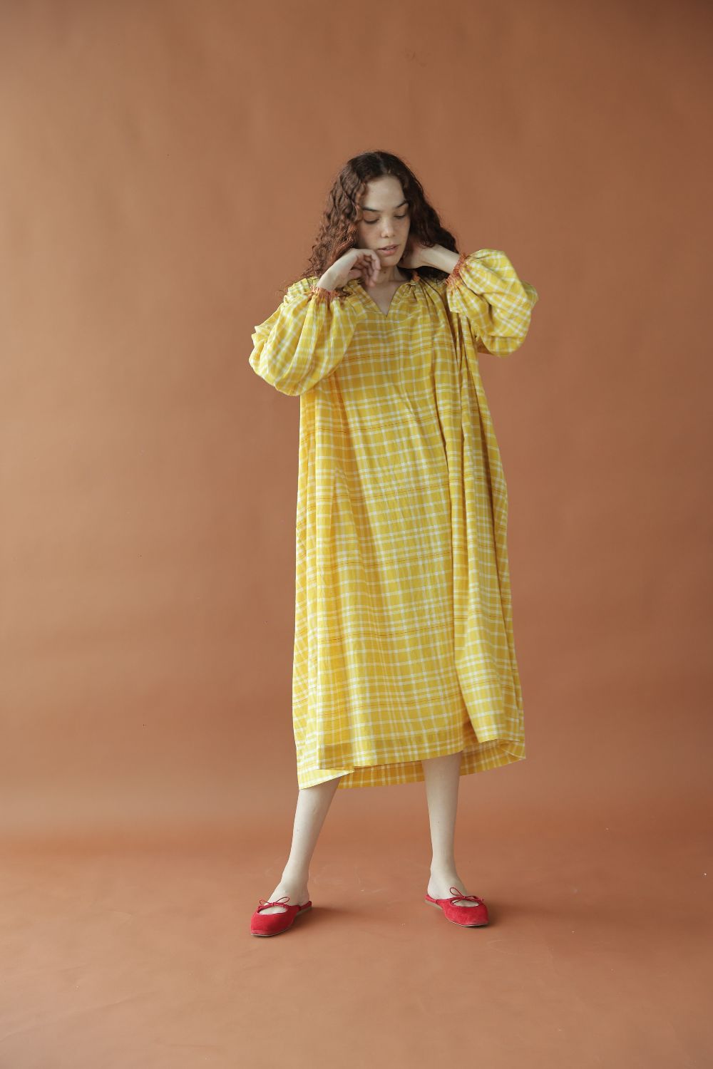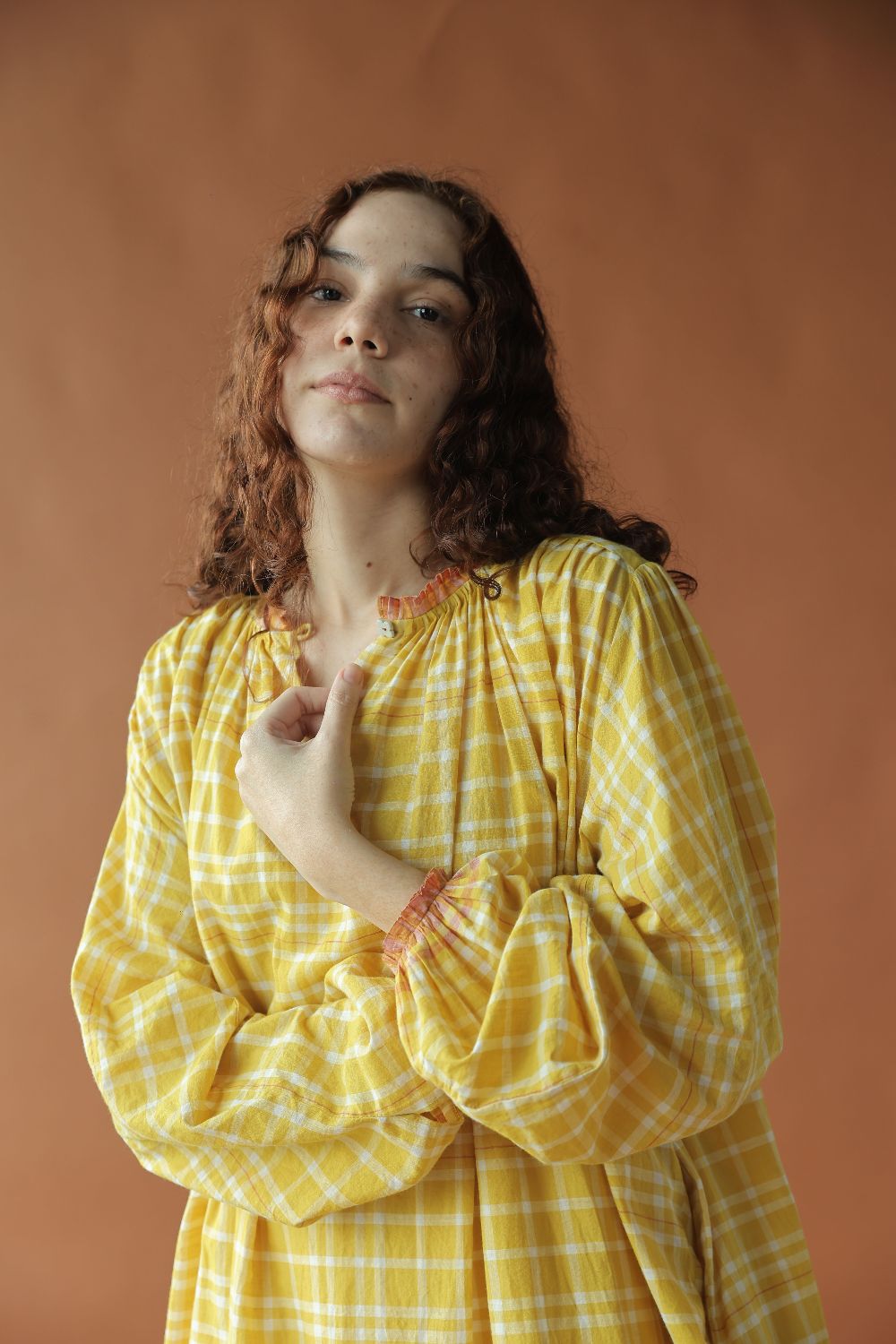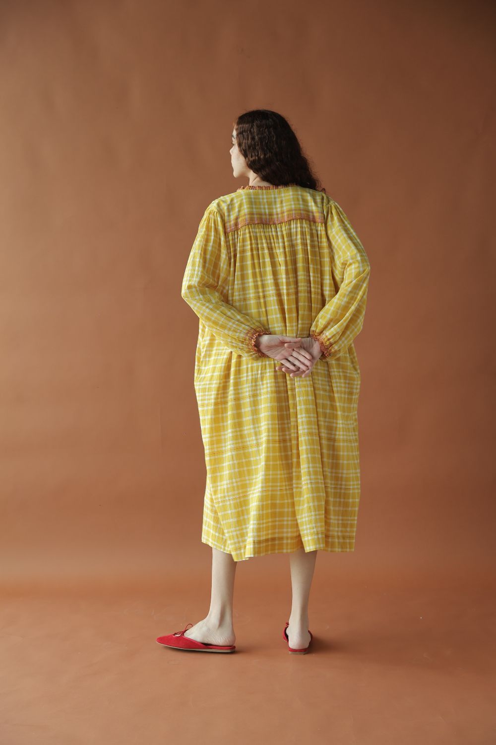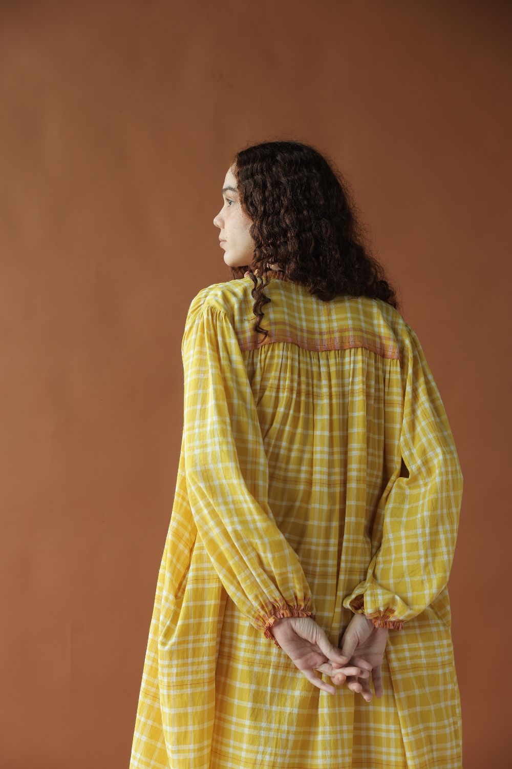 Cut in the softest handwoven cotton, 'Sierra' is a dress in vibrant yellow checks with a small ruffled collar, long sleeves that gather around the cuff to form a tiny frill. 'Sierra' can be worn as is, or cinched with the belt provided with the dress.