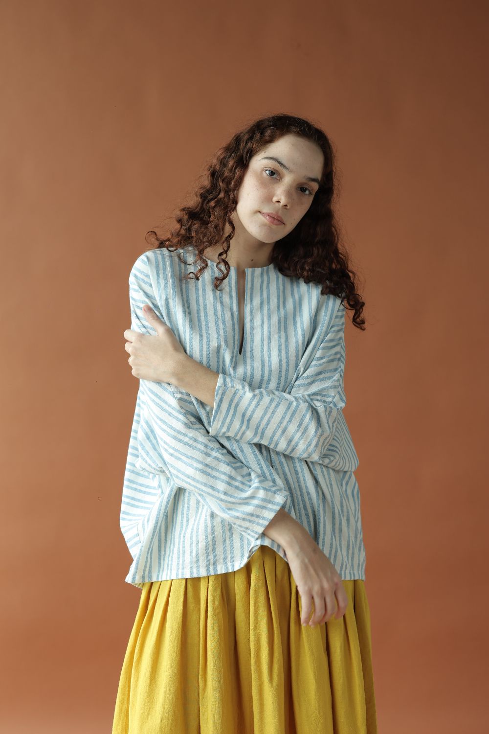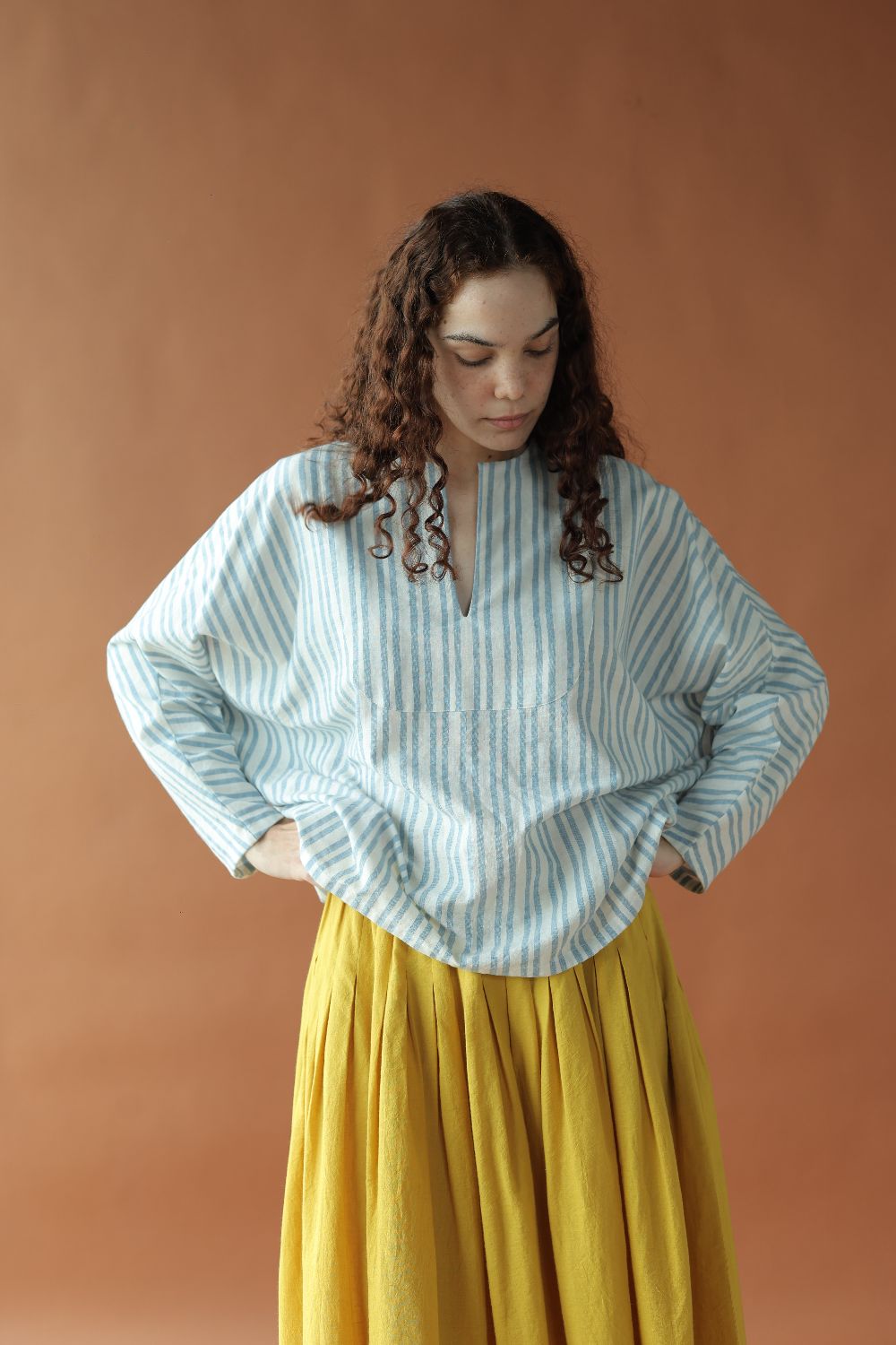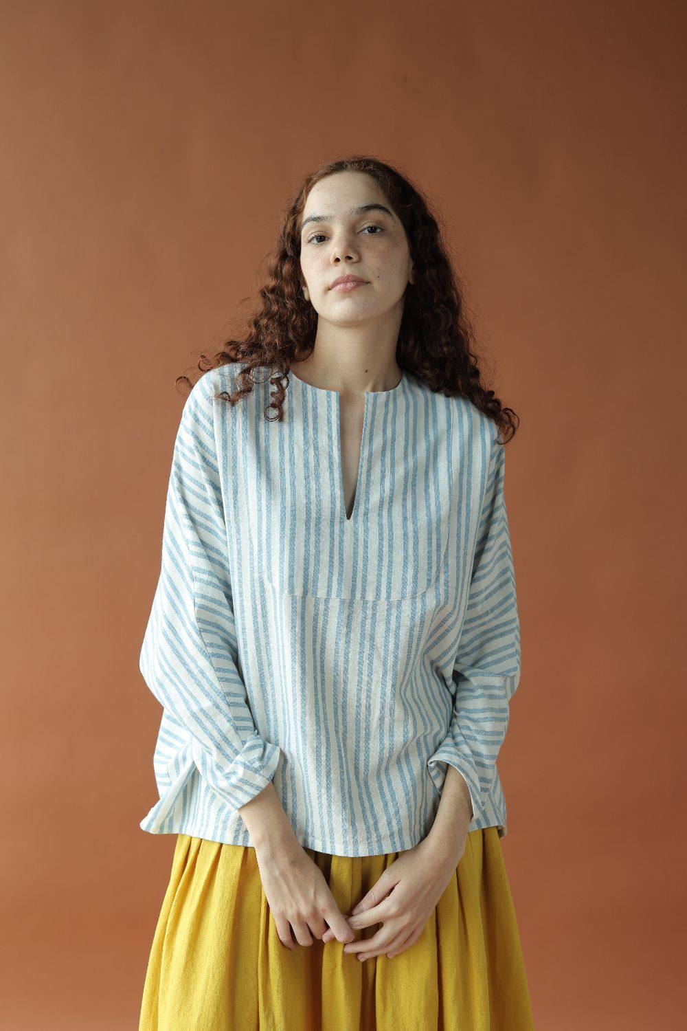 Sylvie is a classic strips handwoven cotton top featuring a deep neckline and loose long sleeves for a casual yet chic look that provides comfort in a refreshing blue and white colour for your summer wardrobe.
