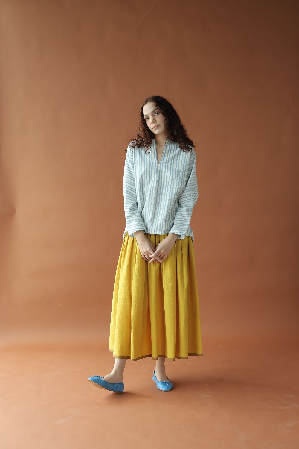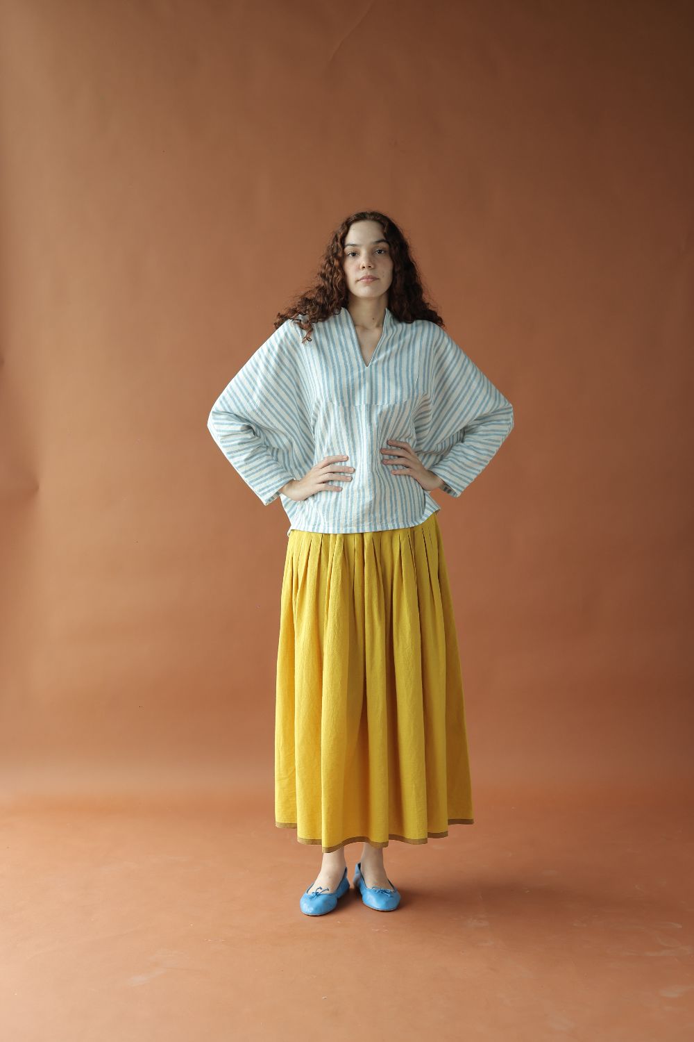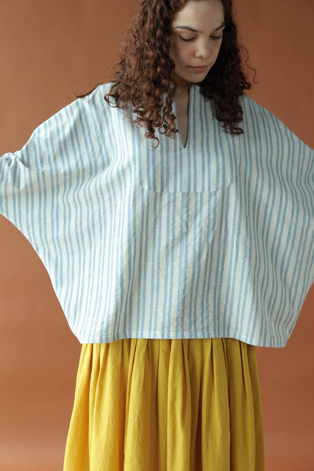 Sylvie is a classic strips handwoven cotton top featuring a deep neckline and loose long sleeves for a casual yet chic look that provides comfort in a refreshing blue and white colour for your summer wardrobe.