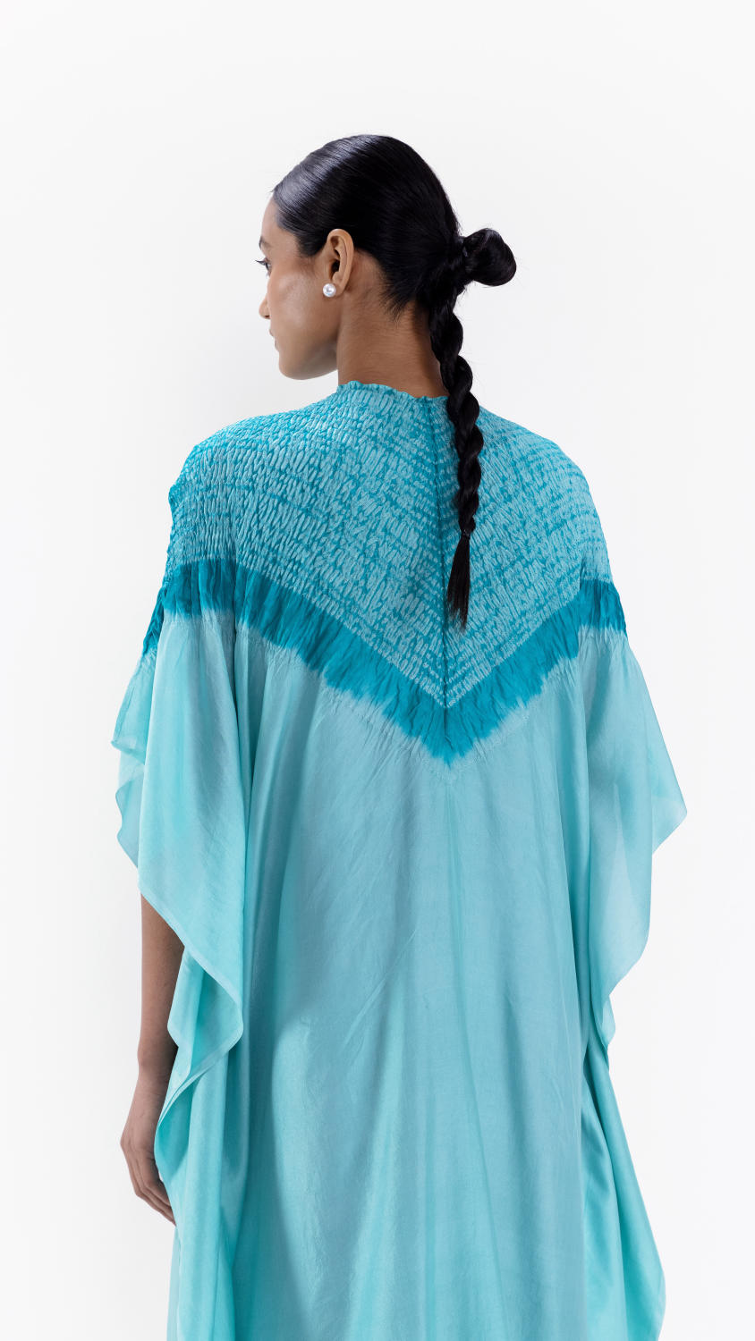 Free-size silk kaftan with our signature shibori neckline, dyed in shades of blue.