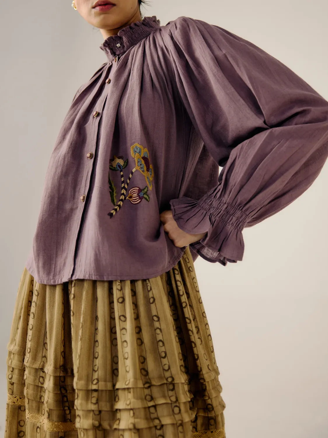 The Elsa top features smocking on the neck and the cuffs, the cuffs are elasticated with a relaxed fit. It also features hand-embroidered buttons.