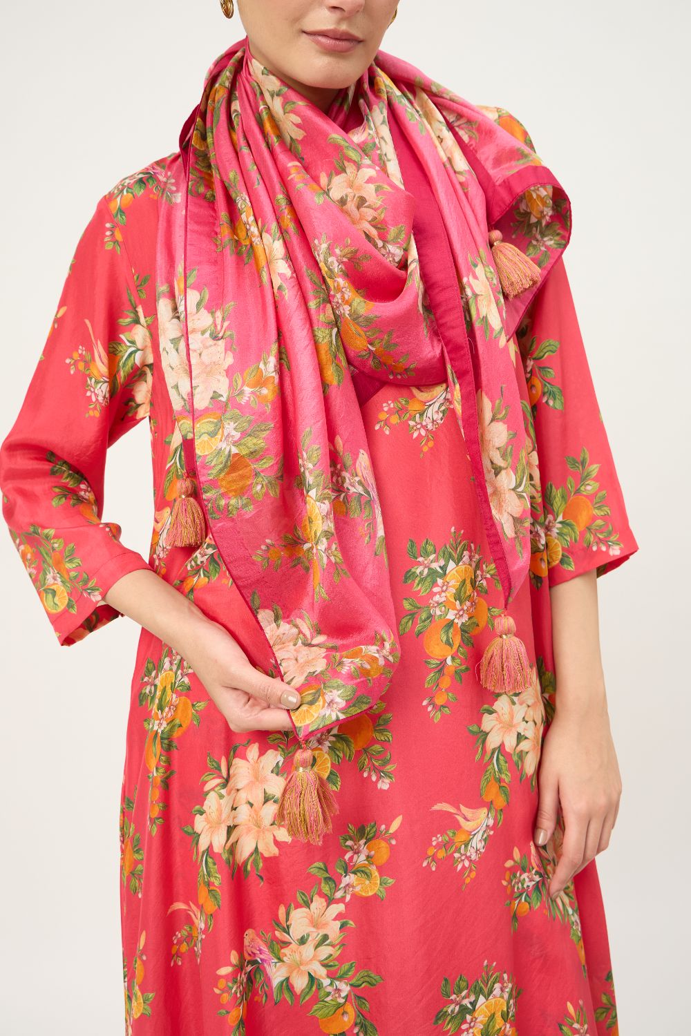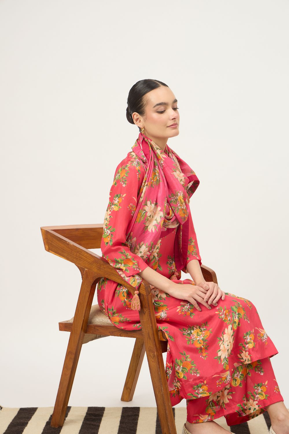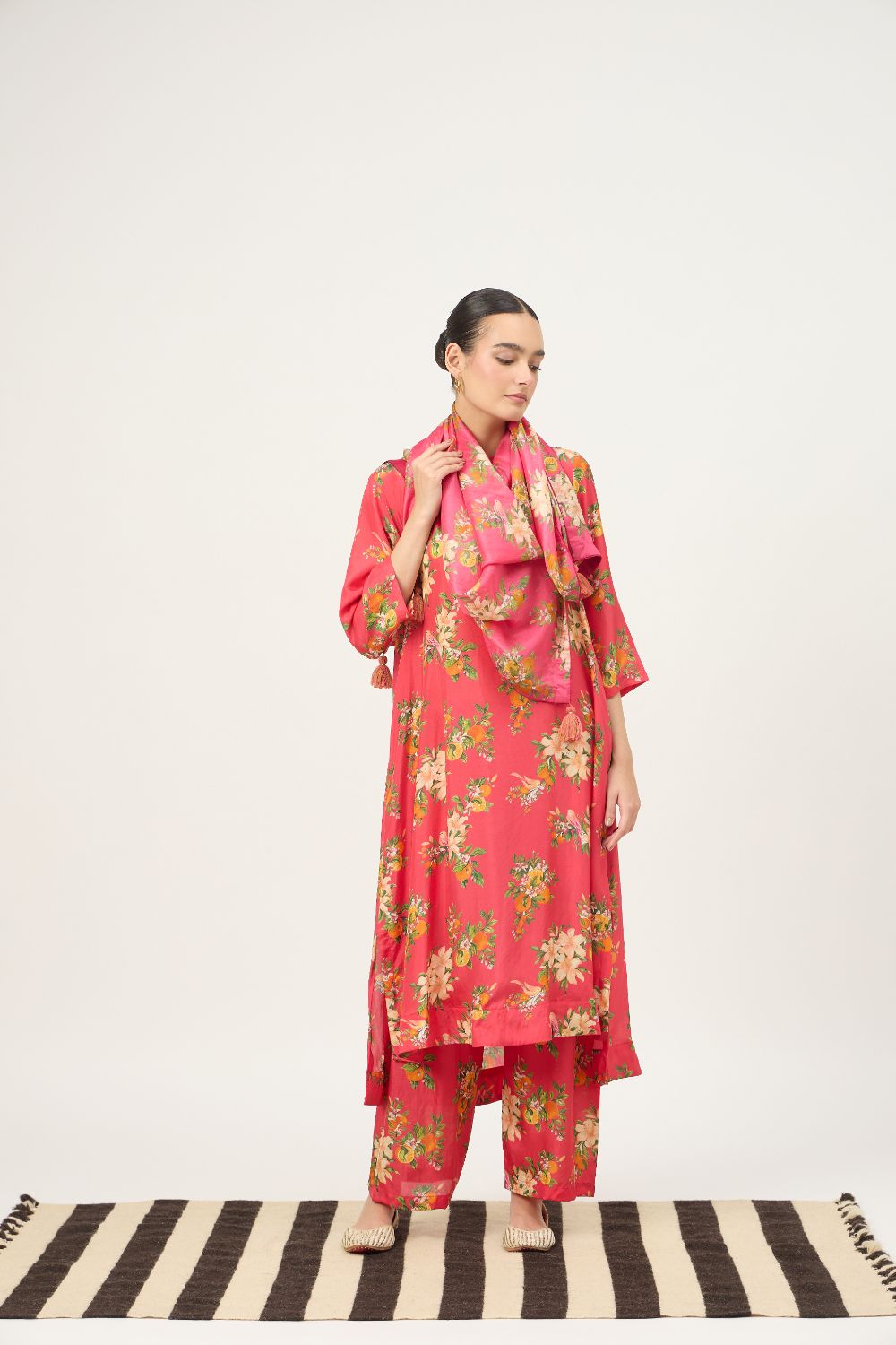 Make a statement in effortless elegance with this vibrant coral pink floral kurta set. Crafted in a lightweight Habuti Silk breathable fabric, the kurta features an all-over botanical print, bringing a fresh and feminine charm.